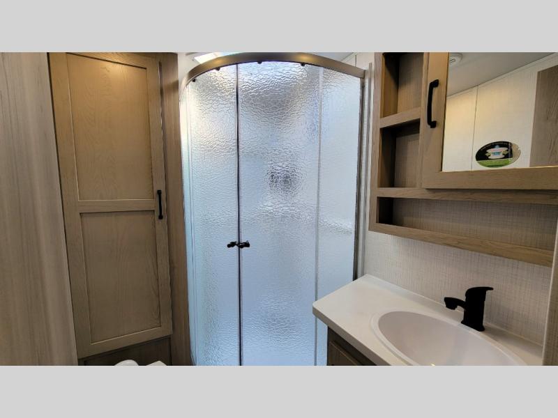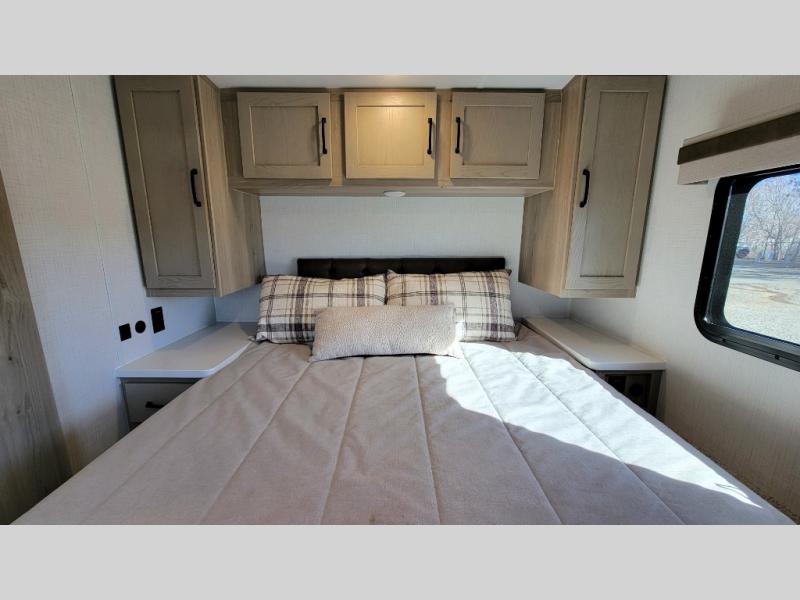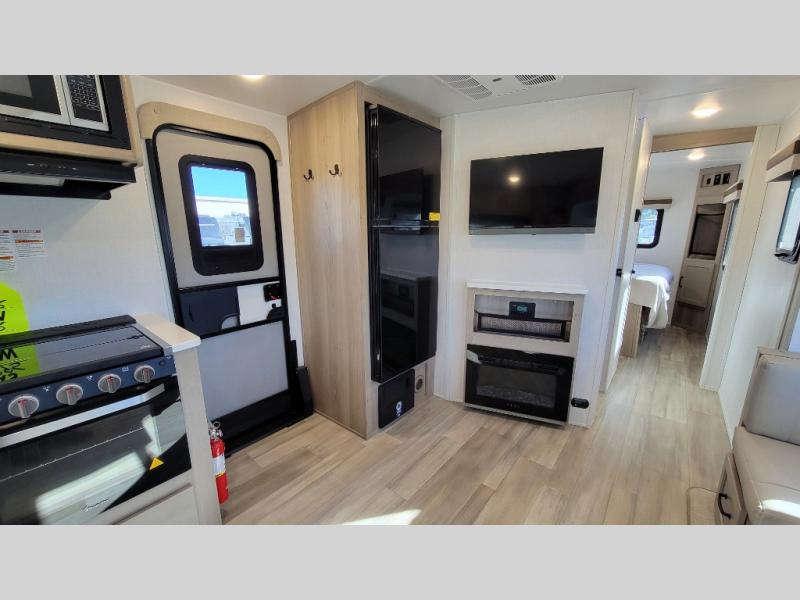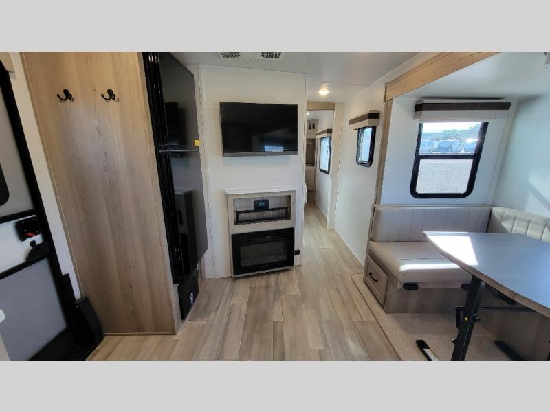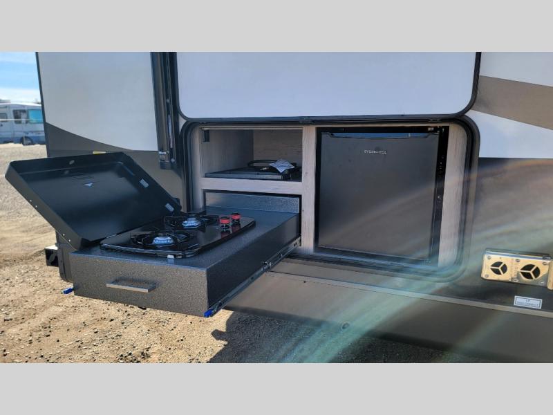 If you like the front kitchen layout, you're going to love this one! You'll have plenty of counter space to prepare and cook meals, or you may just want to head outdoors to cook on the outside kitchen. There is a 17' power awning with LED lights to keep you protected from the sun and rain, and there are three exterior storage compartments for lawn chairs, fishing poles, and firewood! This model includes a U-shaped dinette slide in perfect view of the LED TV and fireplace, and this area can double as your guests' sleeping space at night. You'll stay comfortable in the rear bedroom that includes an RV queen bed, dual bedroom wardrobes, and an optional TV if you enjoy movies in bed!
