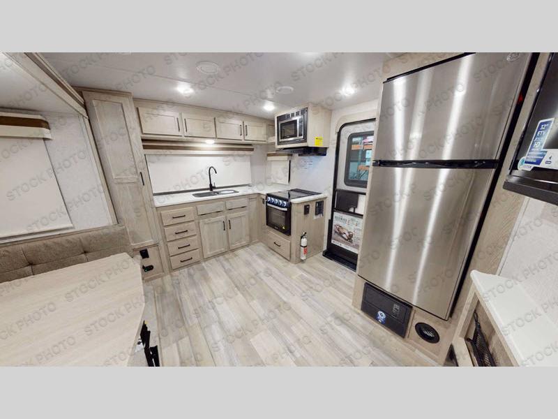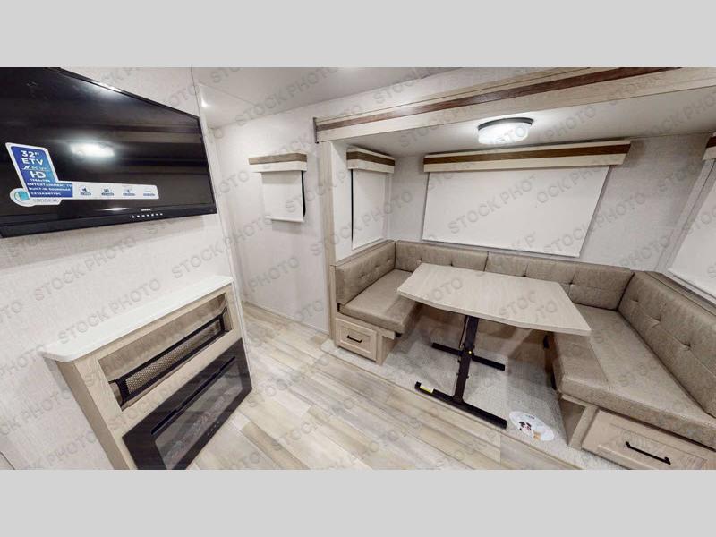 If you like the front kitchen layout, you're going to love this one! You'll have plenty of counter space to prepare and cook meals, or you may just want to head outdoors to cook on the outside kitchen. There is a 17' power awning with LED lights to keep you protected from the sun and rain, and there are three exterior storage compartments for lawn chairs, fishing poles, and firewood! This model includes a U-shaped dinette slide in perfect view of the LED TV and fireplace, and this area can double as your guests' sleeping space at night. You'll stay comfortable in the rear bedroom that includes an RV queen bed, dual bedroom wardrobes, and an optional TV if you enjoy movies in bed!