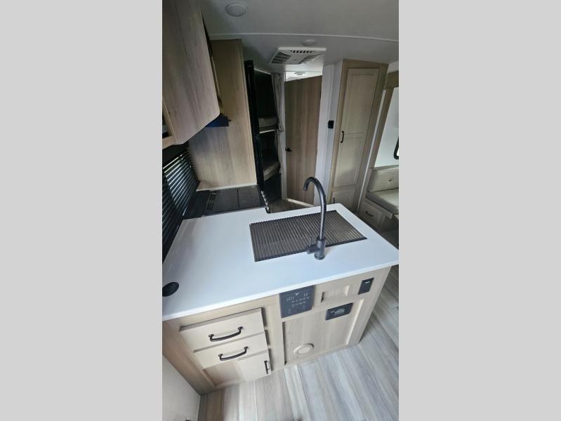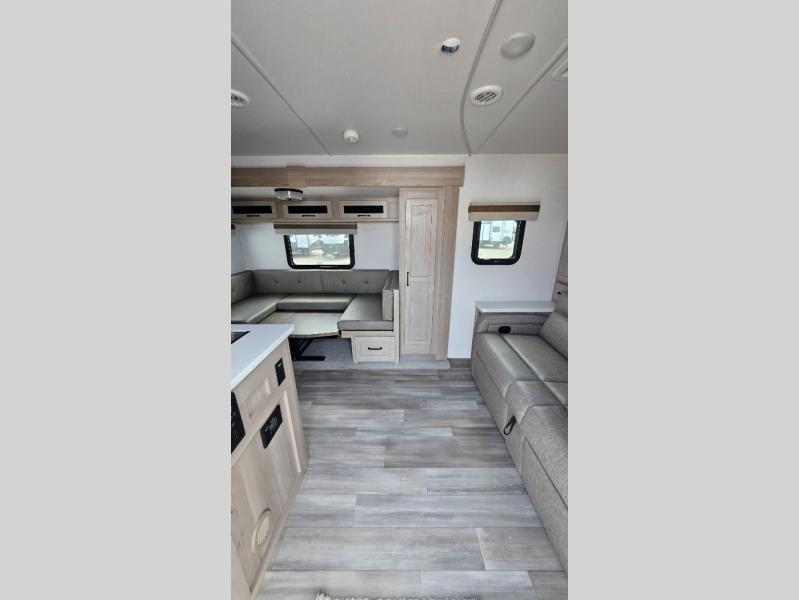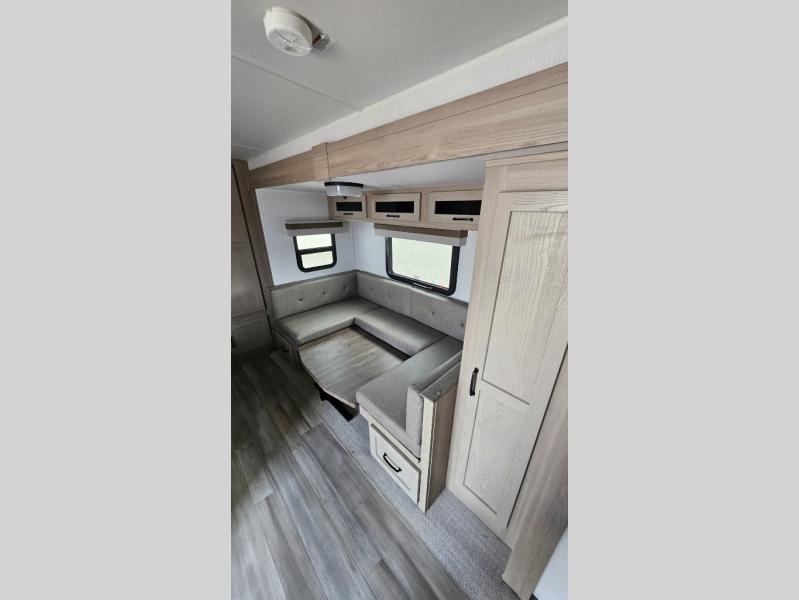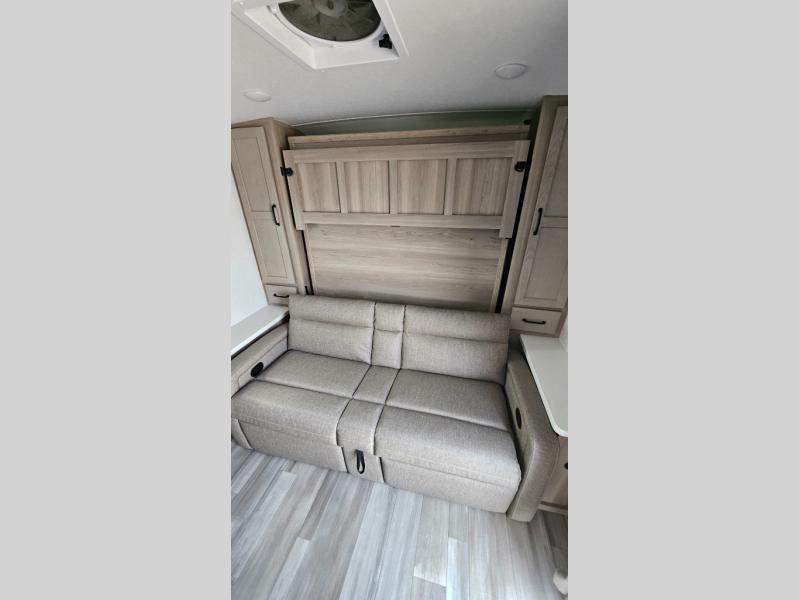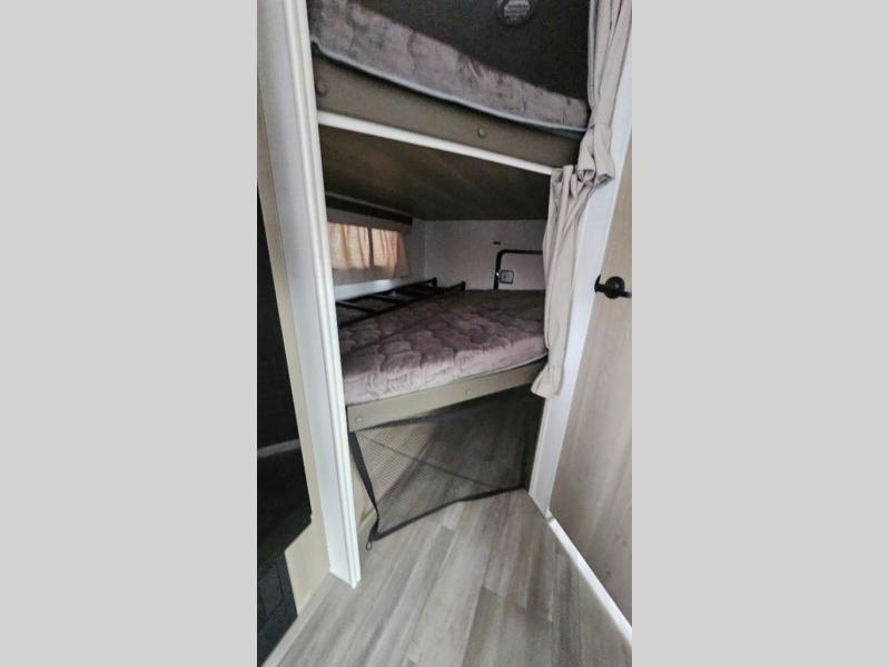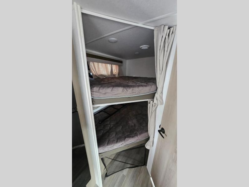 Finally, a lightweight travel trailer with double-size bunks for the kids or your guests! You'll find the versatile Murphy bed up front will be super convenient when you need more space to move around, and the 72" sofa will provide comfy seating space when the bed is put up. This model also includes a U-shaped dinette slide perfect to dine around, play games, and sleep additional guests. An LED TV in the main living area will allow you to watch your favorite shows in the evenings, or you may just find yourselves outdoors under the 18' power awning with LED lights. And check out the pass-through storage, plus additional exterior storage for your hiking gear!