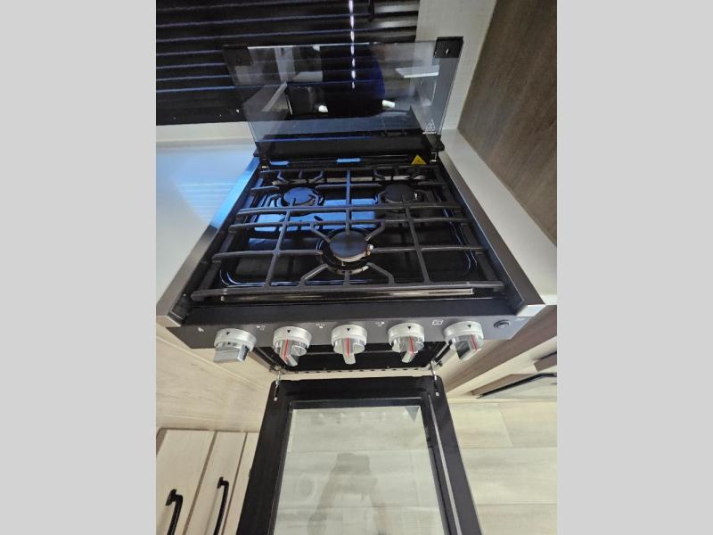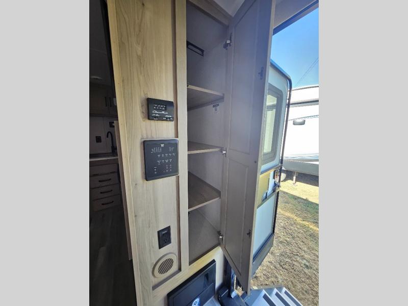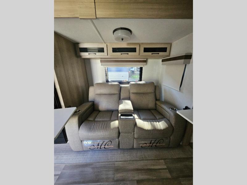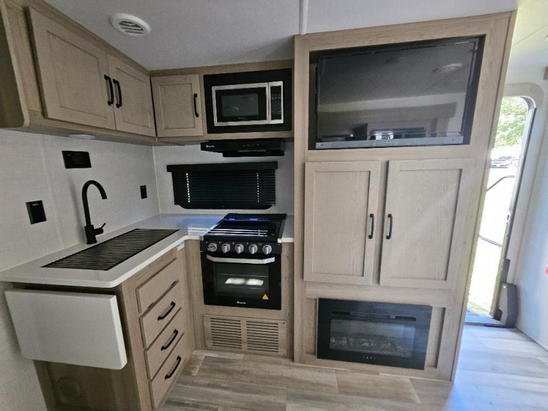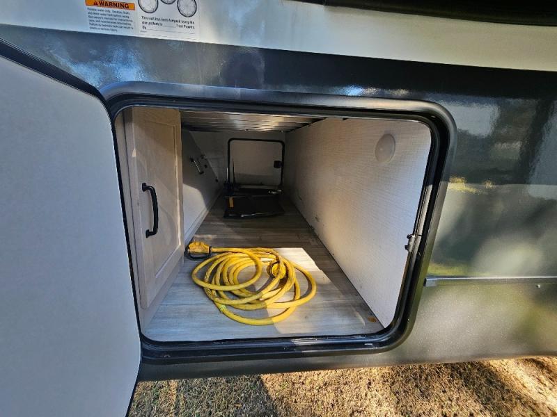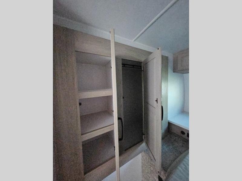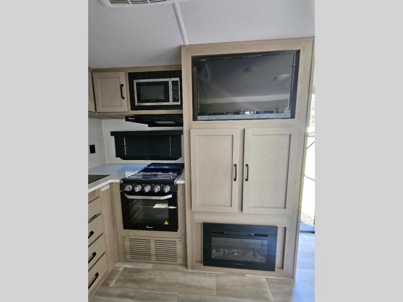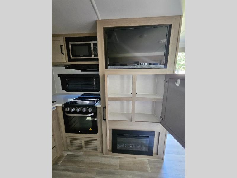 Camping trips to the lake just got sweeter with this dual slide out travel trailer in tow! Once you arrive, unload your gear from the exterior drop-frame pass-through storage, then start lunch on the exterior griddle. If you need a rest after traveling all day, the RV queen bed in the front bedroom is sure to give you comfort, or you can relax on the theater seating. The fireplace and entertainment center with an LED TV will make this space feel just like home, and check out the spacious full rear bath for added privacy. This model also includes an entryway closet/pantry for jackets, shoes, and food!