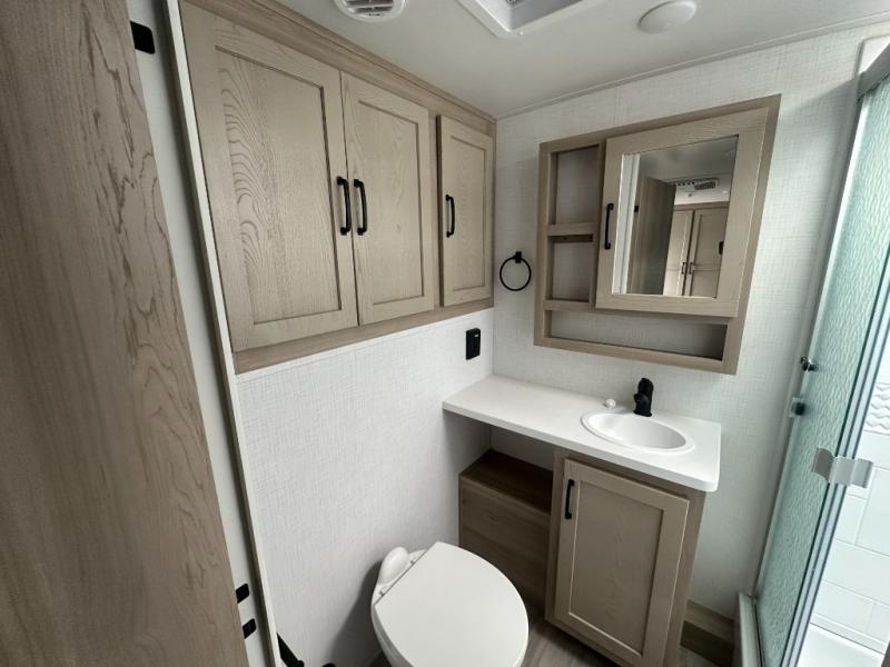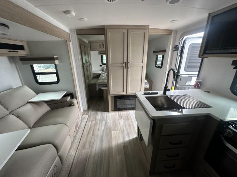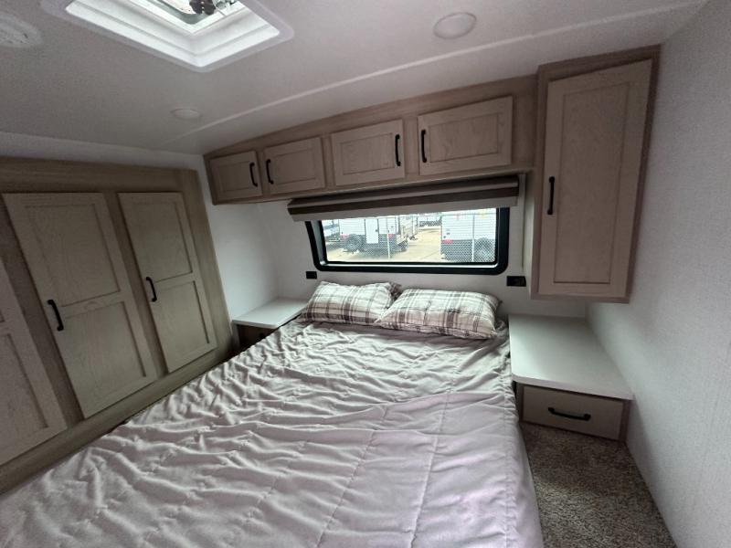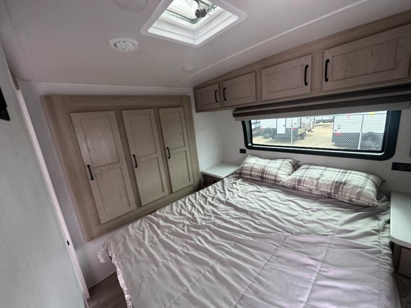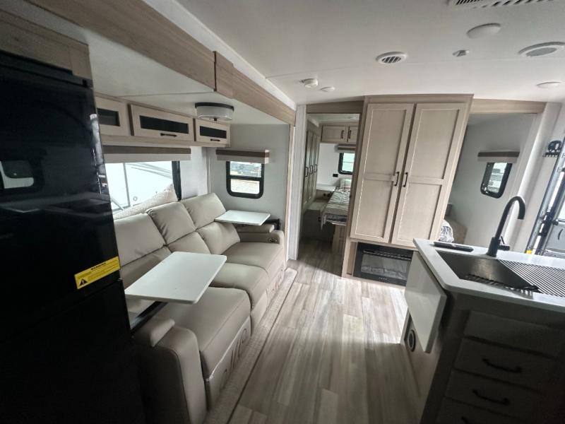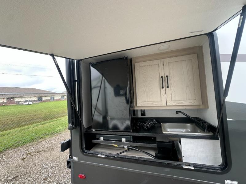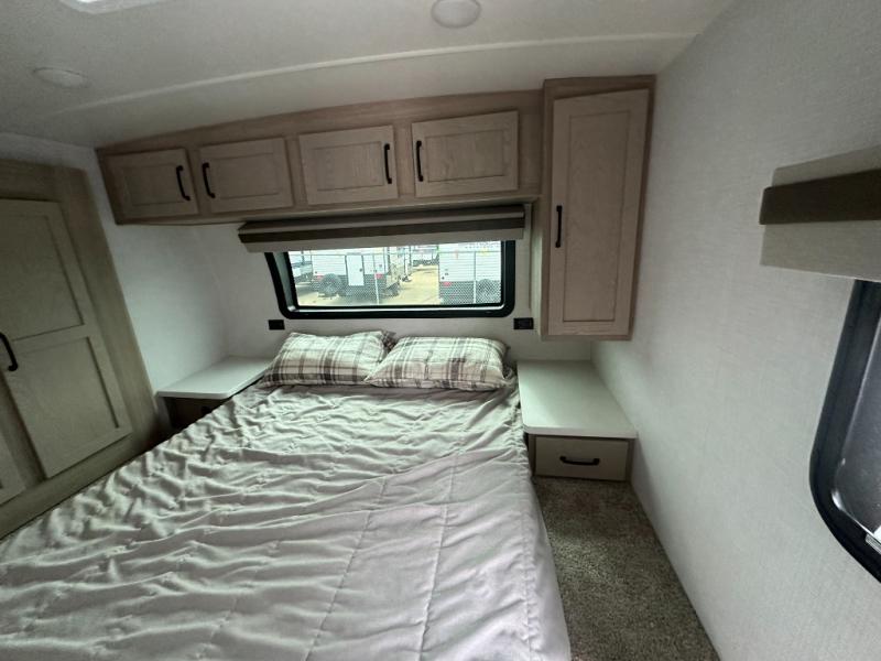 This is the perfect travel trailer for two people looking for comfortable camping trips! You will have your own RV queen bed to sleep on in the front private bedroom, and an optional TV can be added if you enjoy the morning news in bed. Breakfast can be made on the three burner cooktop, or head outdoors to cook on the outside kitchen. The theater seating with a table will provide a place to relax and dine together, and the spacious full rear bath will allow you to clean up before you head out for the day. This model includes plenty of storage space, including two pantries, a wardrobe slide out in the bedroom, plus a drop-frame pass-through storage for larger camp gear!