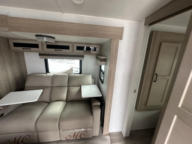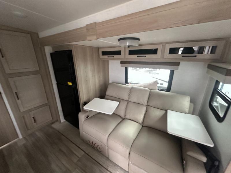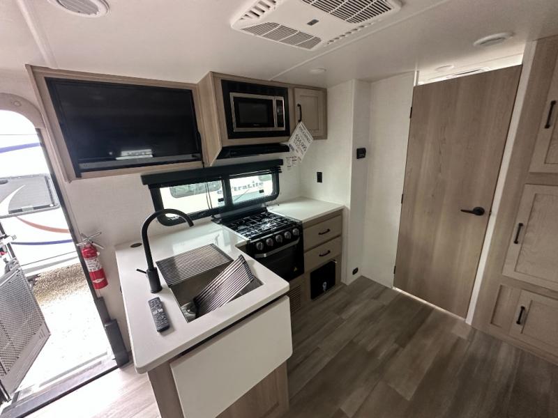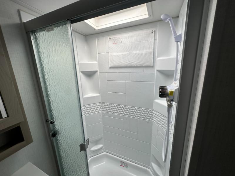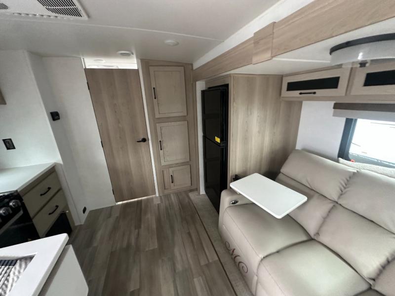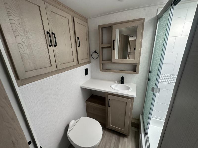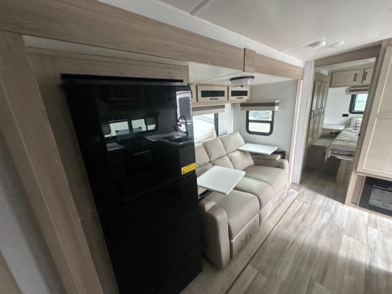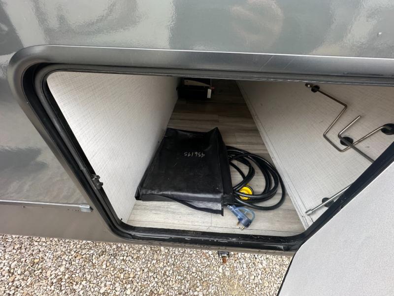 This is the perfect travel trailer for two people looking for comfortable camping trips! You will have your own RV queen bed to sleep on in the front private bedroom, and an optional TV can be added if you enjoy the morning news in bed. Breakfast can be made on the three burner cooktop, or head outdoors to cook on the outside kitchen. The theater seating with a table will provide a place to relax and dine together, and the spacious full rear bath will allow you to clean up before you head out for the day. This model includes plenty of storage space, including two pantries, a wardrobe slide out in the bedroom, plus a drop-frame pass-through storage for larger camp gear!
