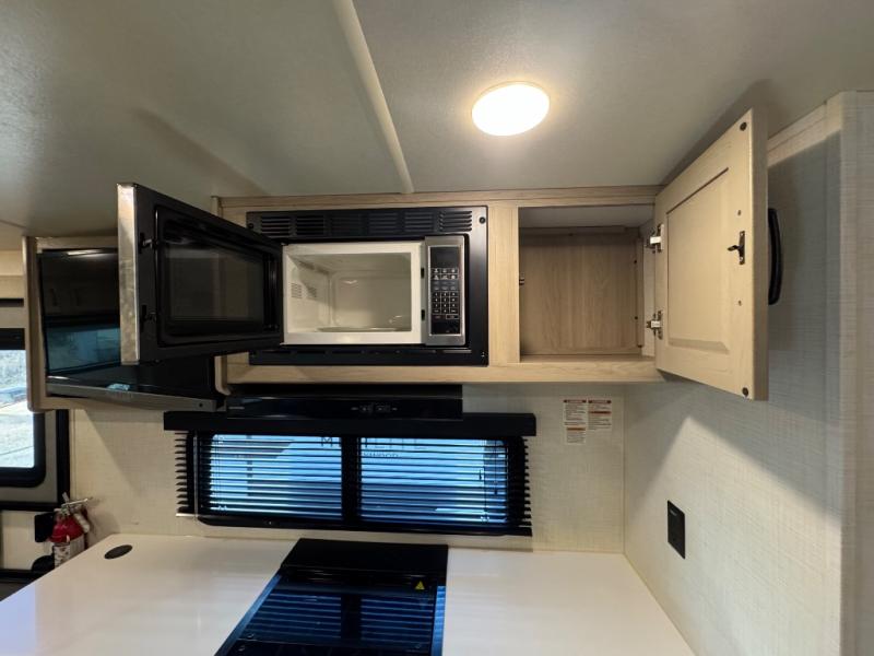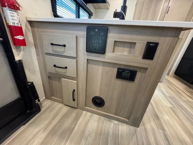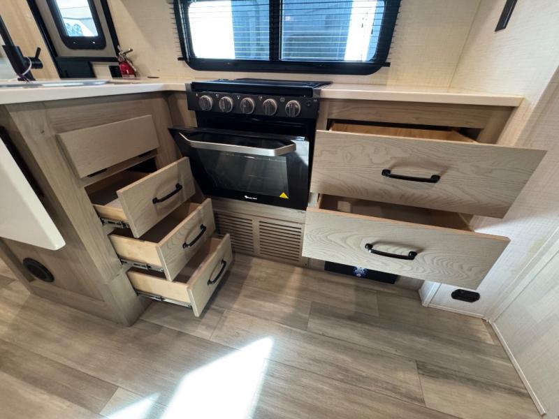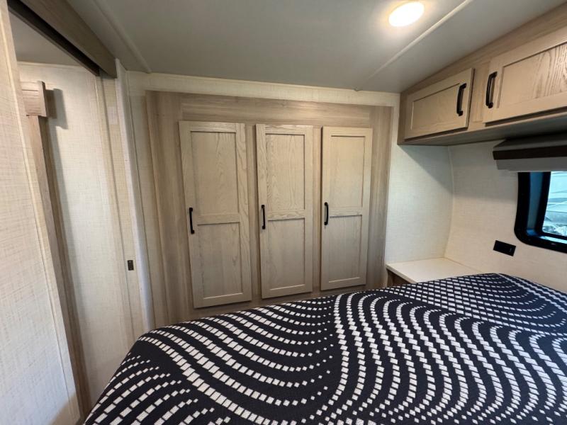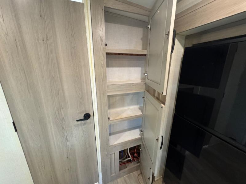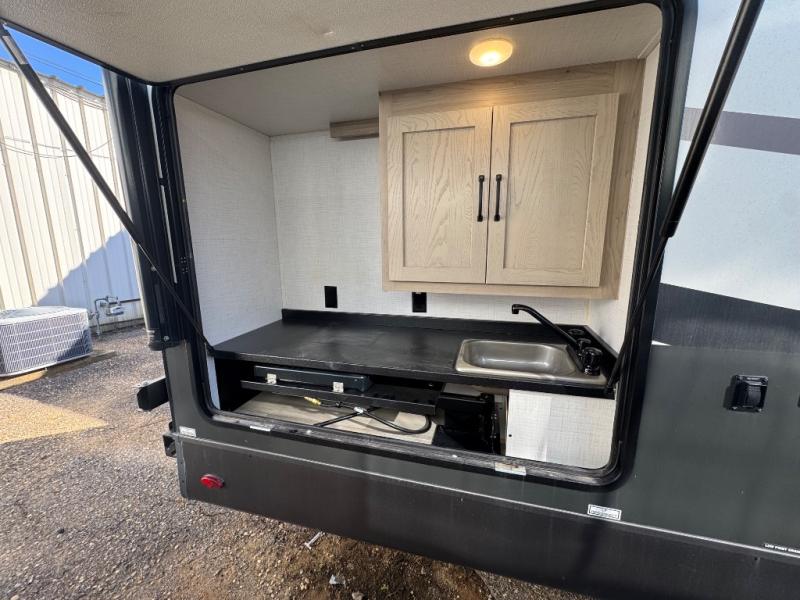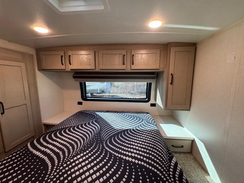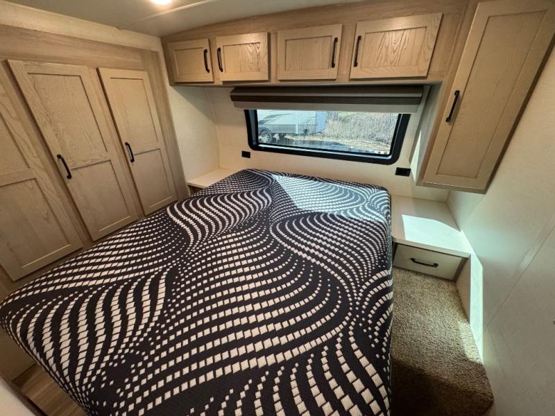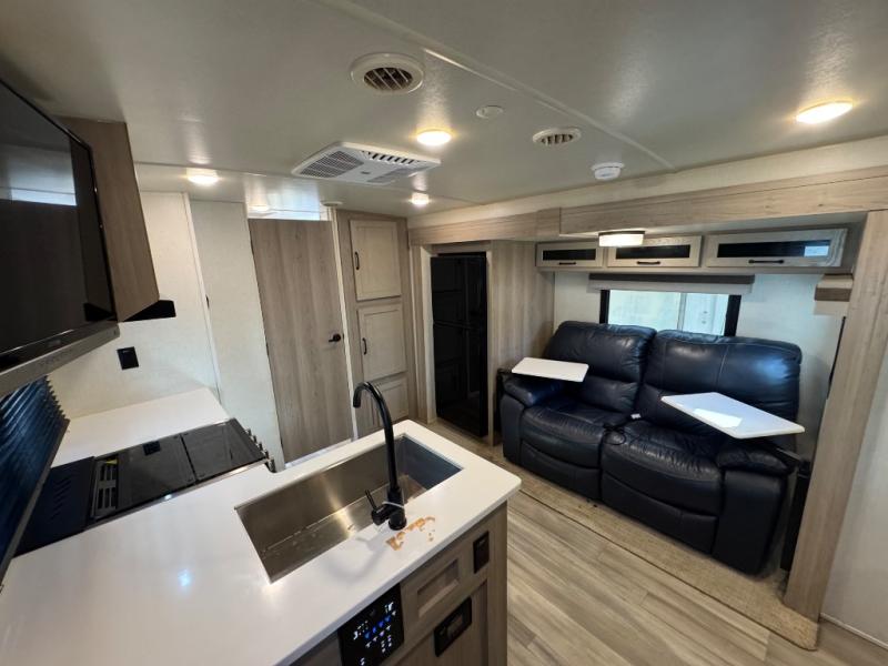 This is the perfect travel trailer for two people looking for comfortable camping trips! You will have your own RV queen bed to sleep on in the front private bedroom, and an optional TV can be added if you enjoy the morning news in bed. Breakfast can be made on the three burner cooktop, or head outdoors to cook on the outside kitchen. The theater seating with a table will provide a place to relax and dine together, and the spacious full rear bath will allow you to clean up before you head out for the day. This model includes plenty of storage space, including two pantries, a wardrobe slide out in the bedroom, plus a drop-frame pass-through storage for larger camp gear!
