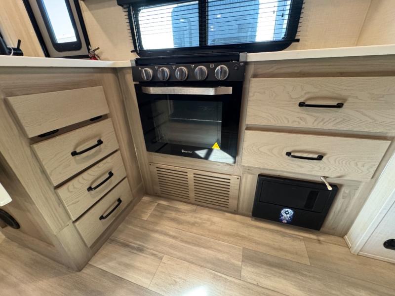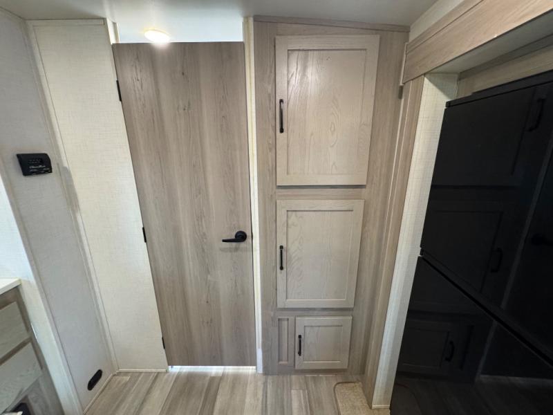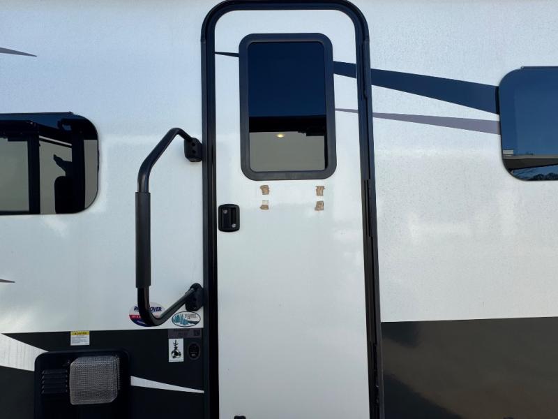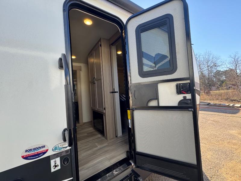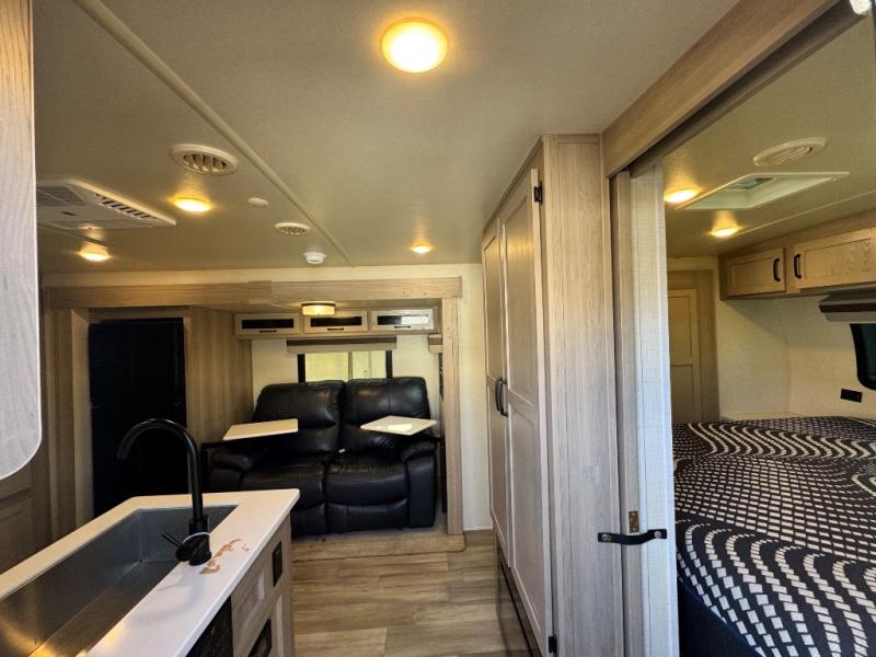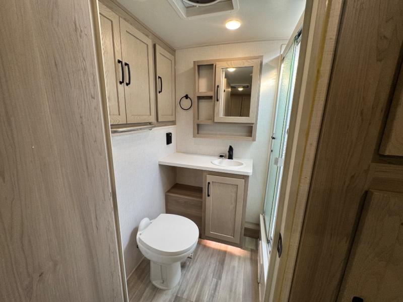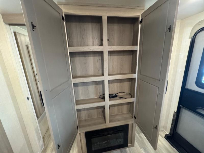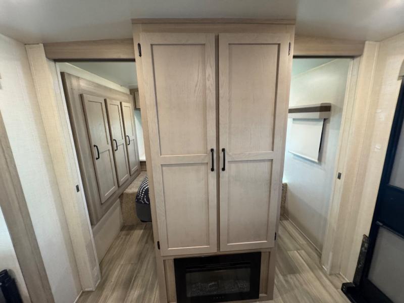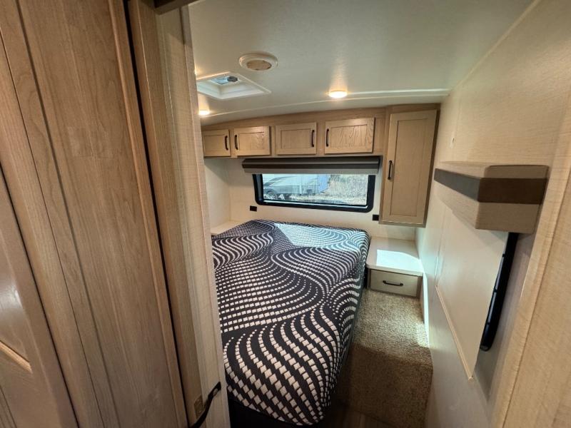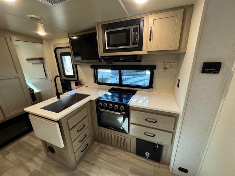 This is the perfect travel trailer for two people looking for comfortable camping trips! You will have your own RV queen bed to sleep on in the front private bedroom, and an optional TV can be added if you enjoy the morning news in bed. Breakfast can be made on the three burner cooktop, or head outdoors to cook on the outside kitchen. The theater seating with a table will provide a place to relax and dine together, and the spacious full rear bath will allow you to clean up before you head out for the day. This model includes plenty of storage space, including two pantries, a wardrobe slide out in the bedroom, plus a drop-frame pass-through storage for larger camp gear!