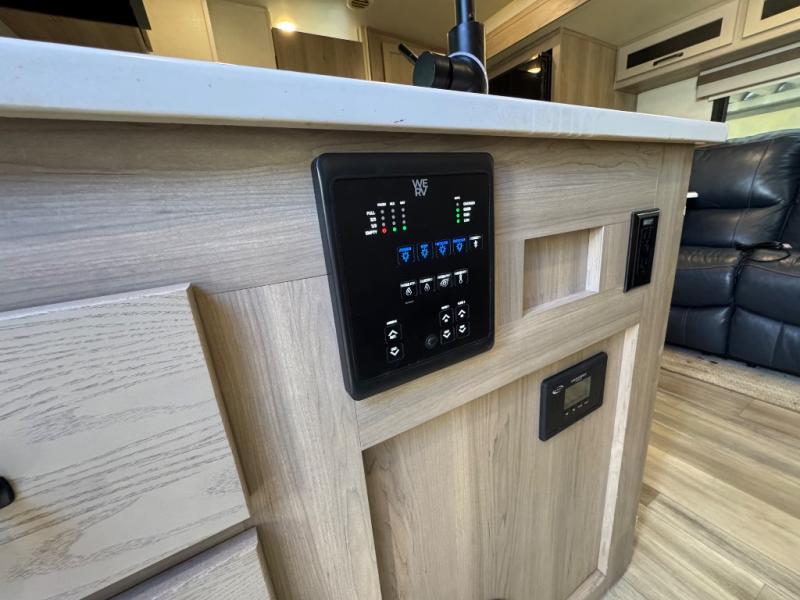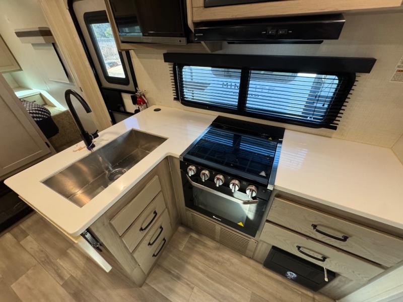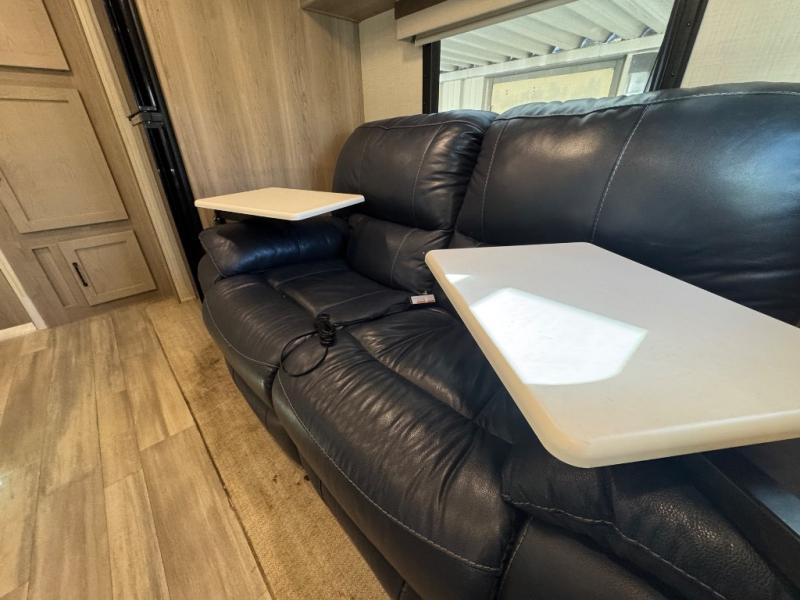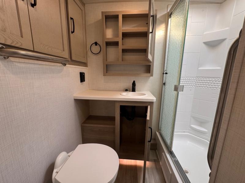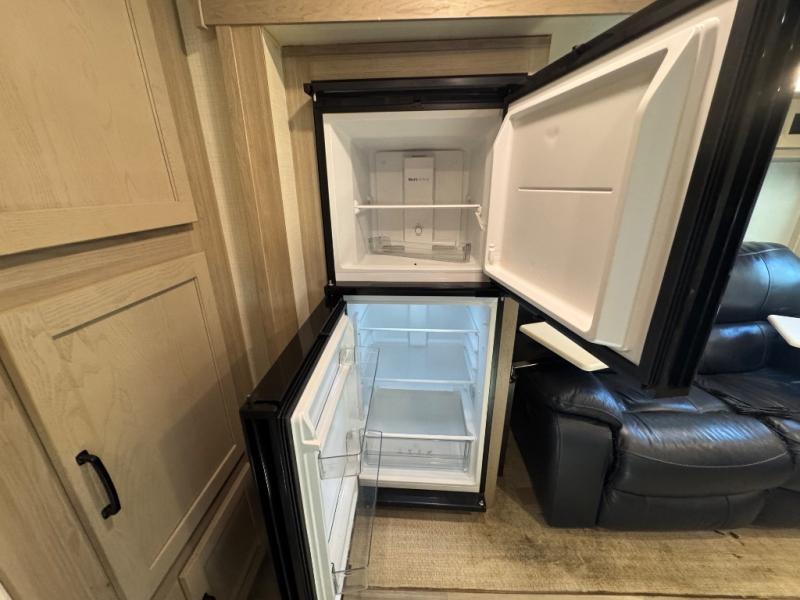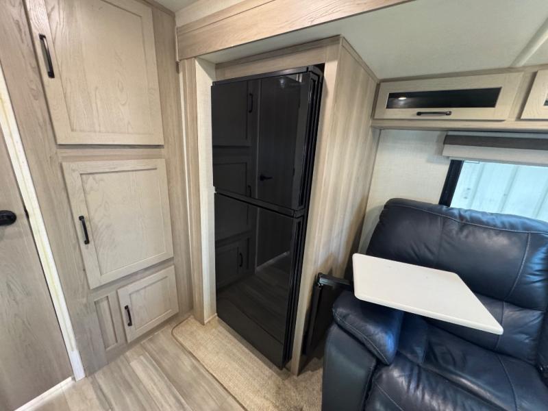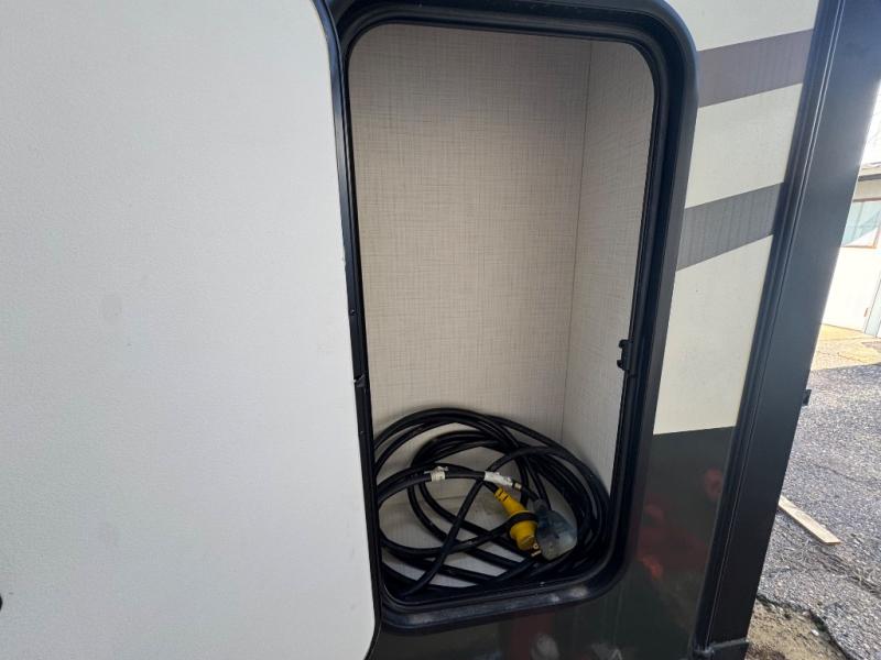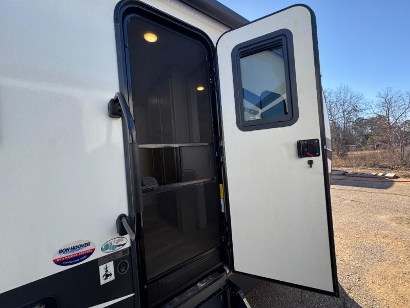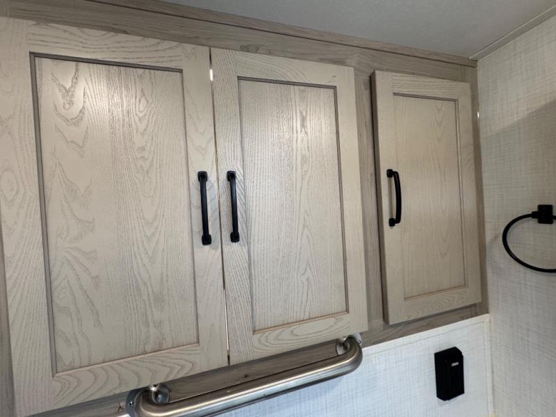 This is the perfect travel trailer for two people looking for comfortable camping trips! You will have your own RV queen bed to sleep on in the front private bedroom, and an optional TV can be added if you enjoy the morning news in bed. Breakfast can be made on the three burner cooktop, or head outdoors to cook on the outside kitchen. The theater seating with a table will provide a place to relax and dine together, and the spacious full rear bath will allow you to clean up before you head out for the day. This model includes plenty of storage space, including two pantries, a wardrobe slide out in the bedroom, plus a drop-frame pass-through storage for larger camp gear!