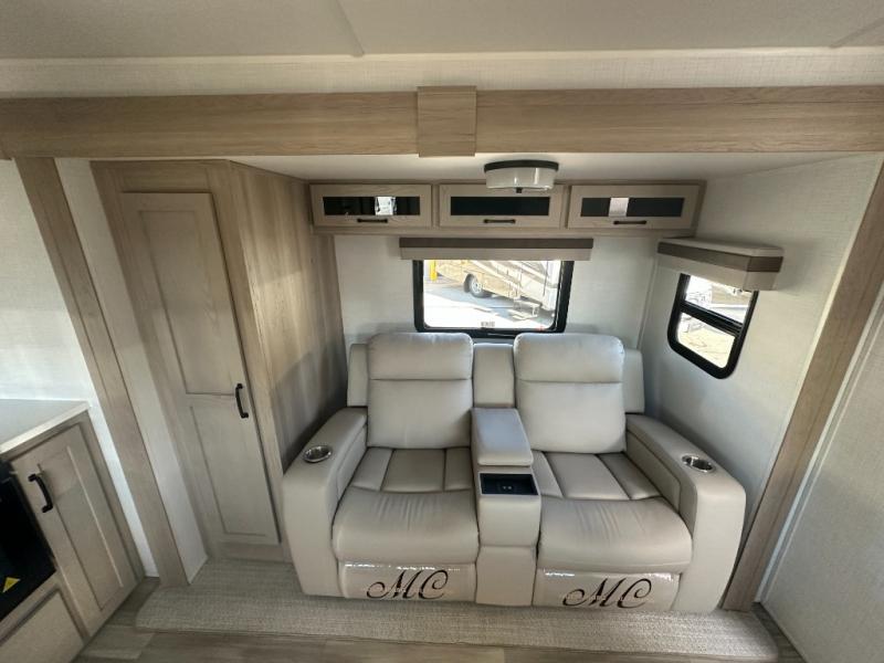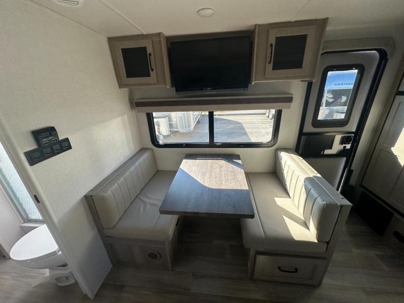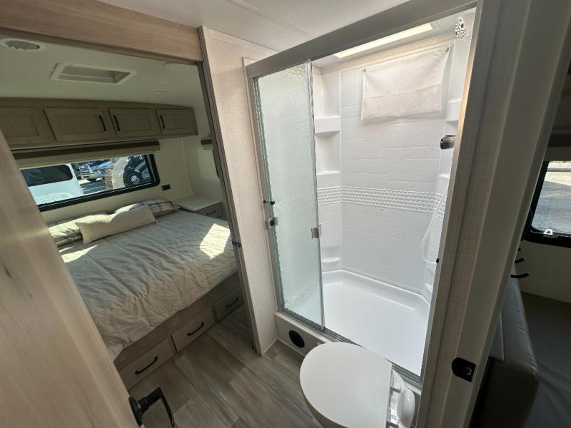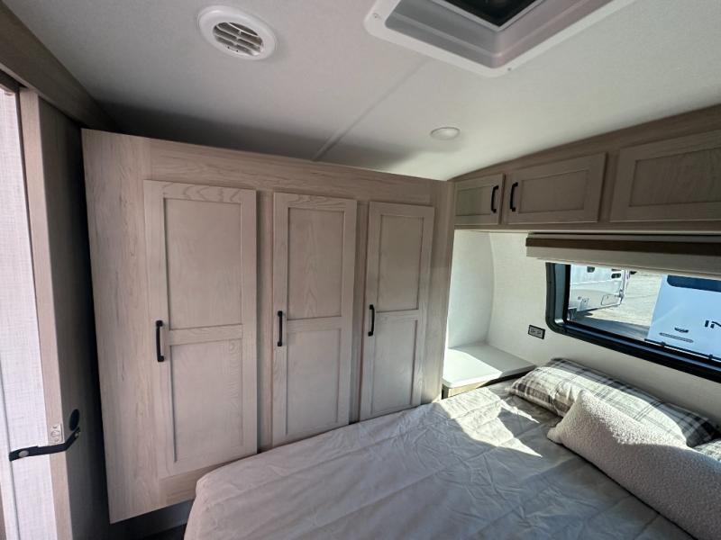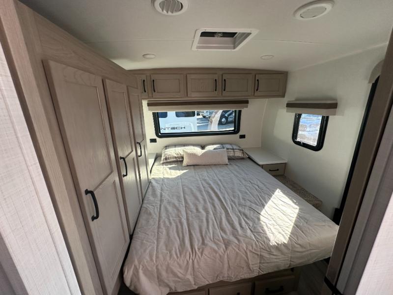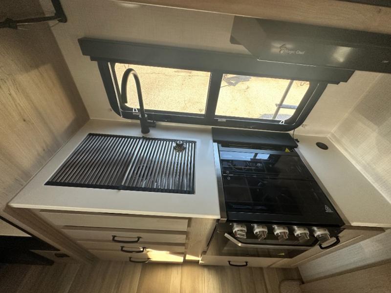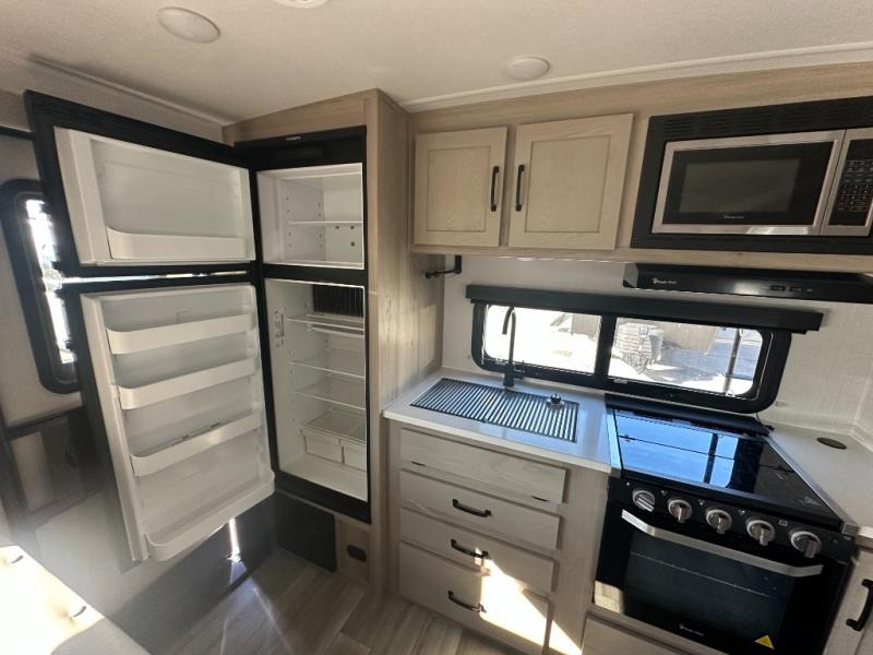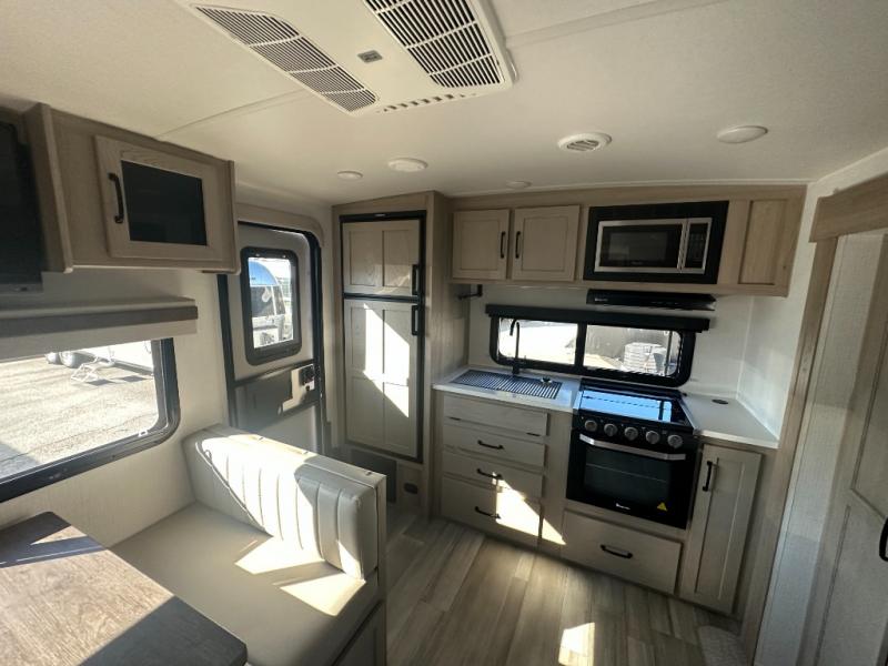 You and your spouse will have a great time camping in this travel trailer! You will have your own RV queen bed to sleep on in the front private bedroom, and an optional TV can be added if you enjoy the morning news in bed. Breakfast can be made on the three burner cooktop in the rear kitchen, or head outdoors to cook on the outside griddle. The 67" theater seating with cupholders will provide a place to relax and dine together, and the spacious walk-through bath will allow you to clean up before you head out for the day. This model includes plenty of storage space, including a pantry for your snacks, a wardrobe slide out in the bedroom, plus a drop-frame pass-through storage for larger camp gear!