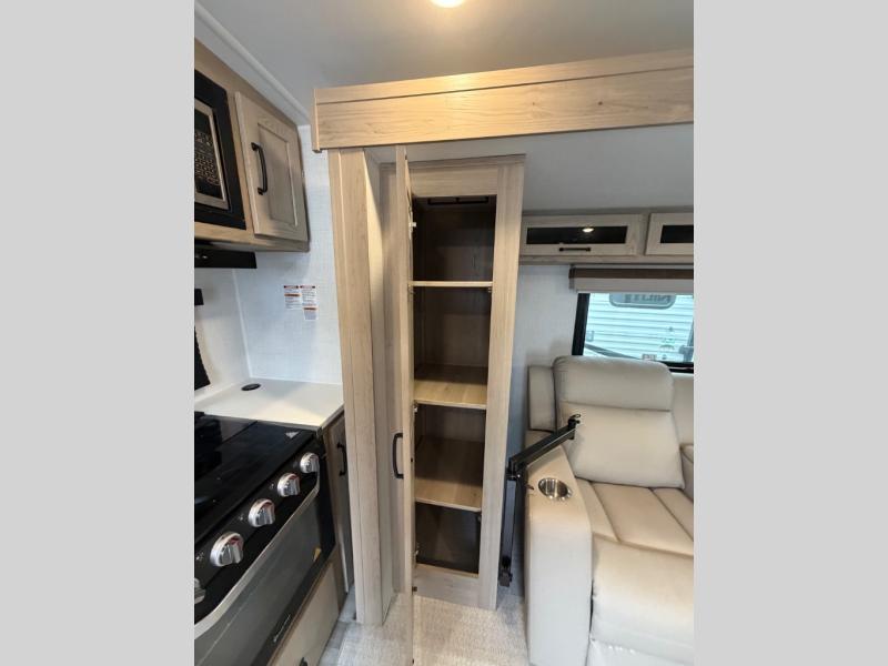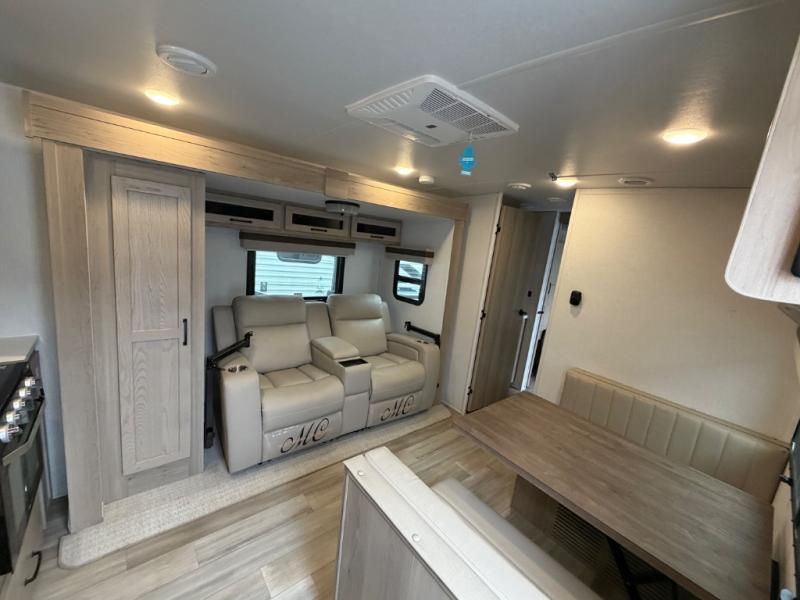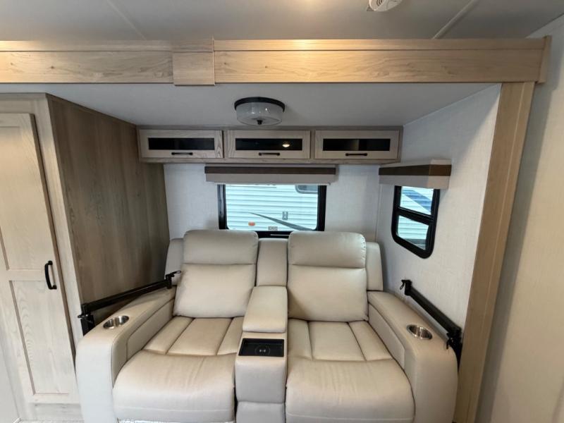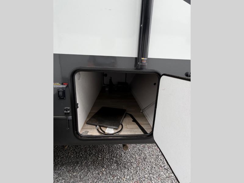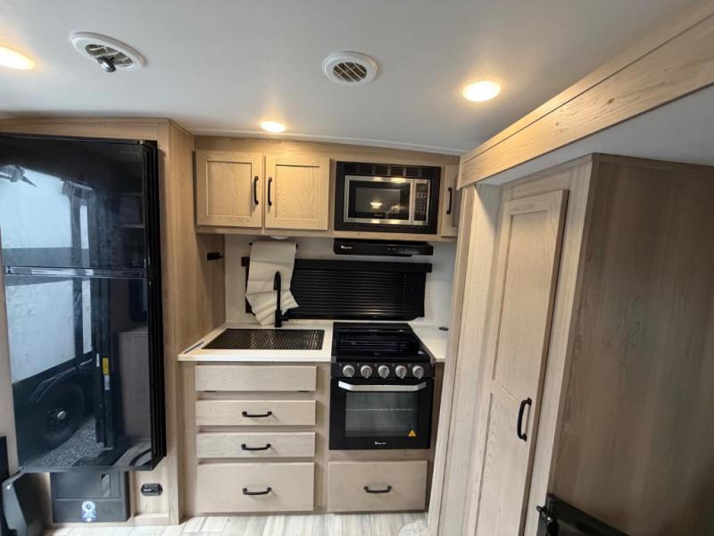 You and your spouse will have a great time camping in this travel trailer! You will have your own RV queen bed to sleep on in the front private bedroom, and an optional TV can be added if you enjoy the morning news in bed. Breakfast can be made on the three burner cooktop in the rear kitchen, or head outdoors to cook on the outside griddle. The 67" theater seating with cupholders will provide a place to relax and dine together, and the spacious walk-through bath will allow you to clean up before you head out for the day. This model includes plenty of storage space, including a pantry for your snacks, a wardrobe slide out in the bedroom, plus a drop-frame pass-through storage for larger camp gear!