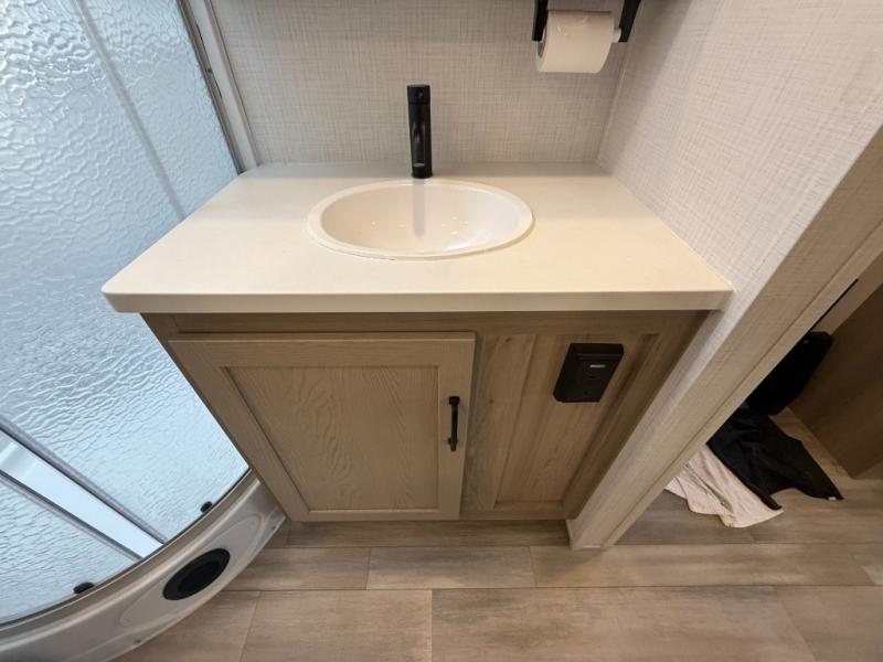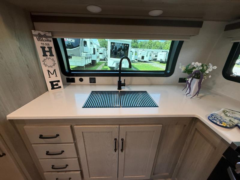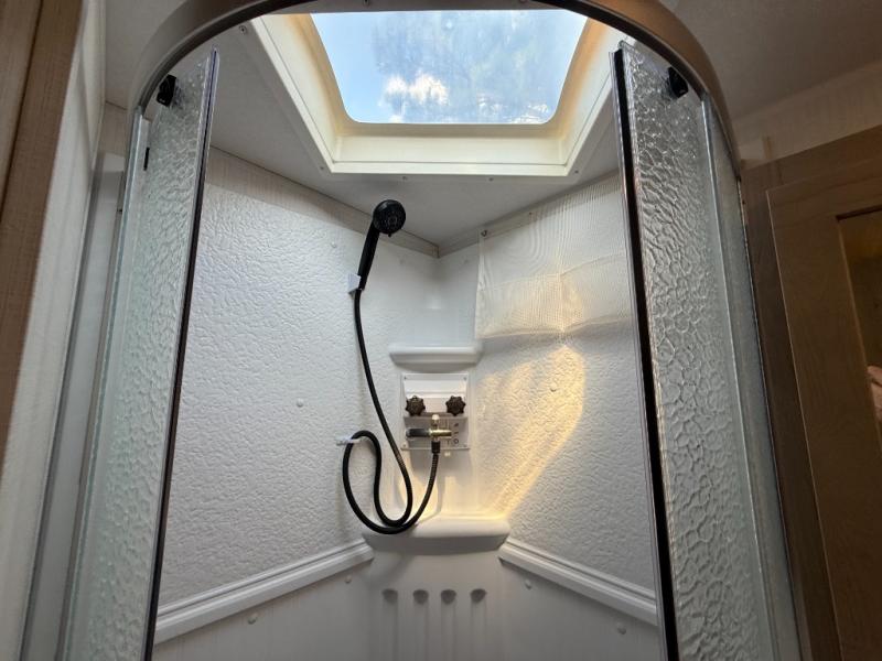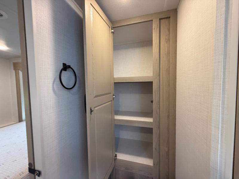Escape the city life for weekend trips in this cozy couple's trailer. The dual entry doors will allow you to enter in through the rear private bedroom, or the front kitchen/main living area for convenience. You will enjoy relaxing on the theater seating across from the LED TV and fireplace in the evenings, or you can visit outdoors under the 19' power awning. You'll also find an exterior griddle here for quick meals and exterior storage for the fishing poles or hiking gear. This model also includes a walk-through bath with a shower skylight, a linen closet, plus a Showermiser Water Saving System. And don't worry about storage space inside since this model includes an entryway pantry/closet, a second pantry in the front kitchen, plus a large bedroom wardrobe to keep your clothes wrinkle-free!