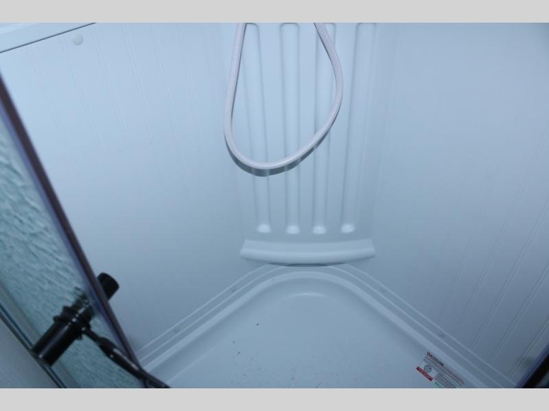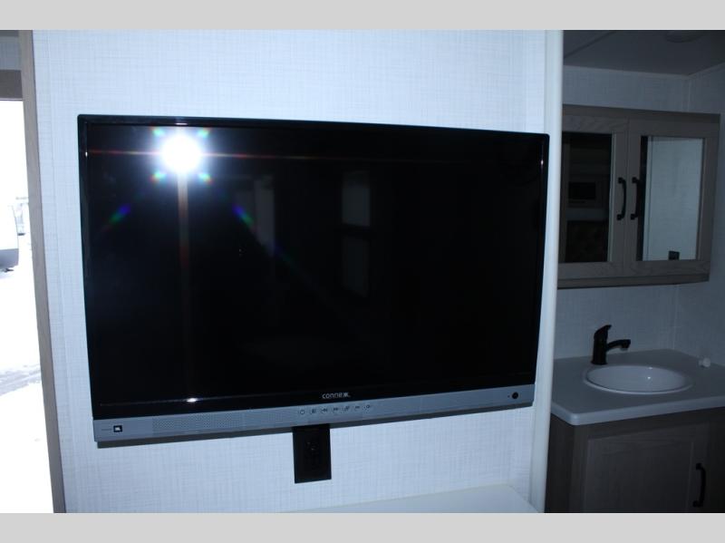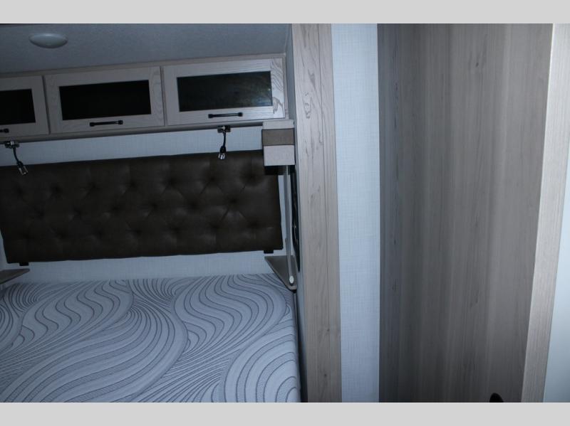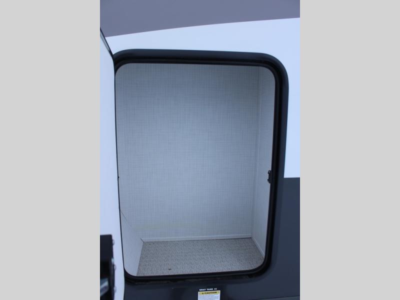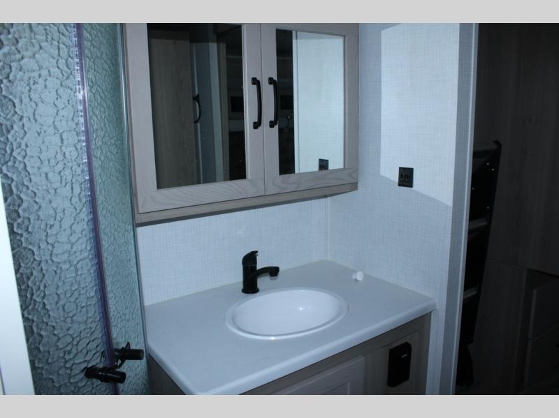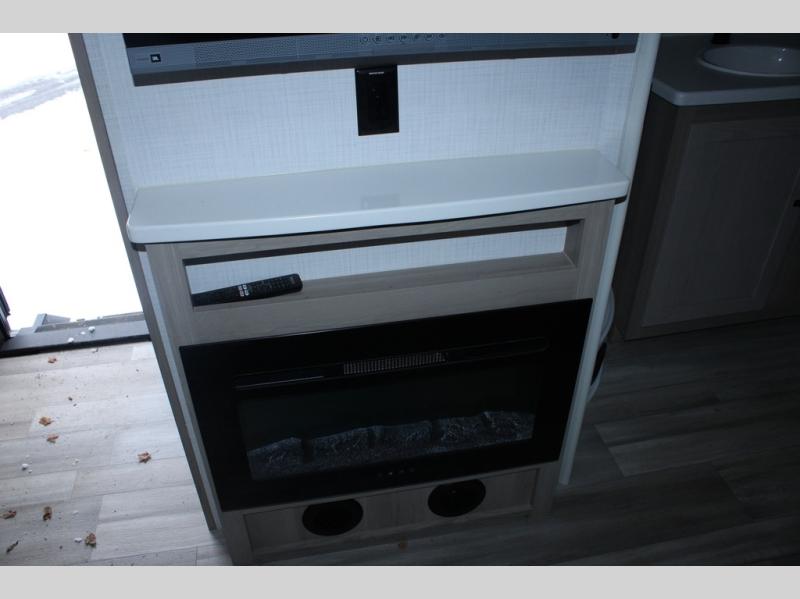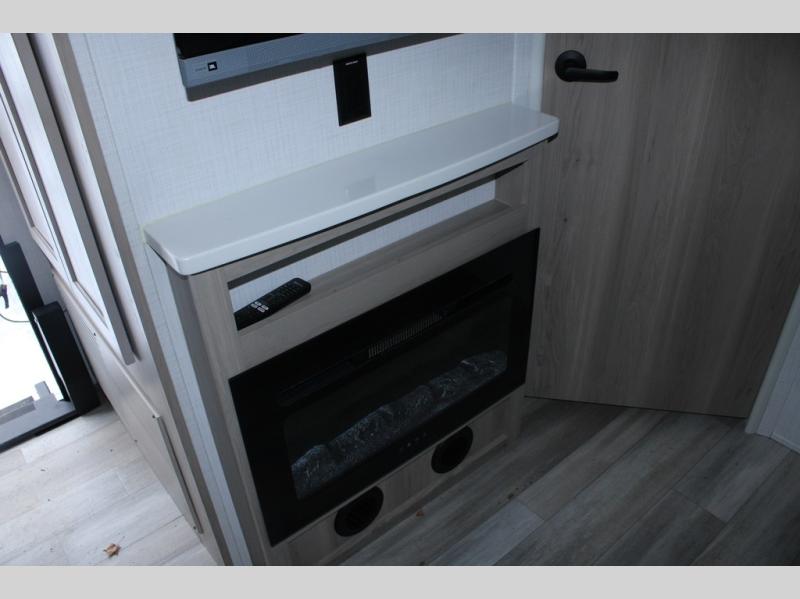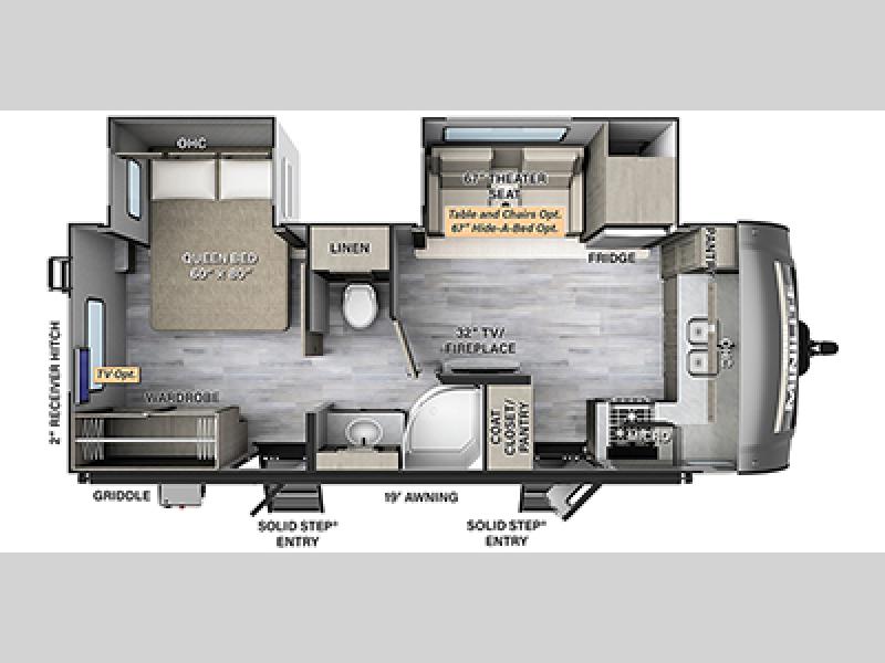 Escape the city life for weekend trips in this cozy couple's trailer. The dual entry doors will allow you to enter in through the rear private bedroom, or the front kitchen/main living area for convenience. You will enjoy relaxing on the theater seating across from the LED TV and fireplace in the evenings, or you can visit outdoors under the 19' power awning. You'll also find an exterior griddle here for quick meals and exterior storage for the fishing poles or hiking gear. This model also includes a walk-through bath with a shower skylight, a linen closet, plus a Showermiser Water Saving System. And don't worry about storage space inside since this model includes an entryway pantry/closet, a second pantry in the front kitchen, plus a large bedroom wardrobe to keep your clothes wrinkle-free!