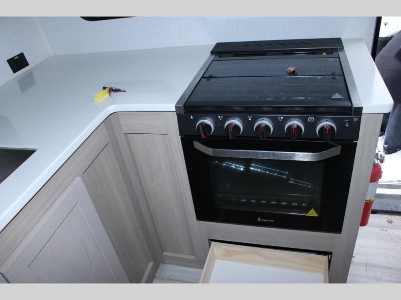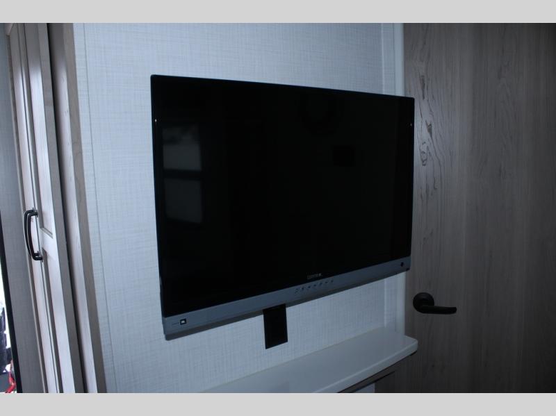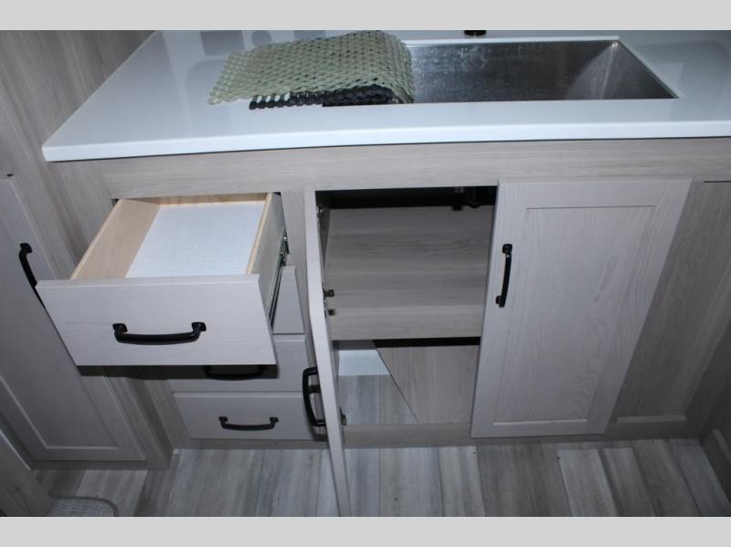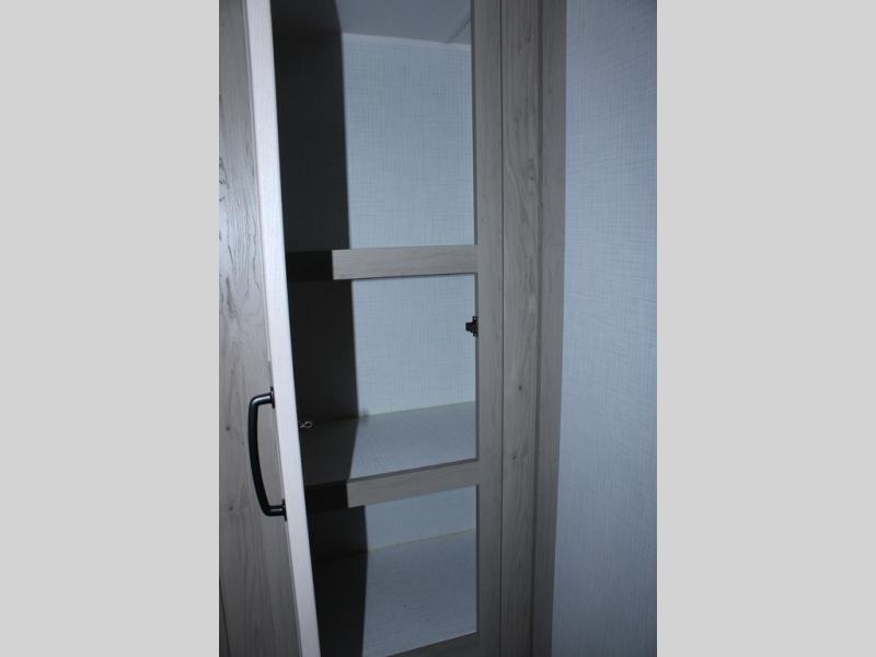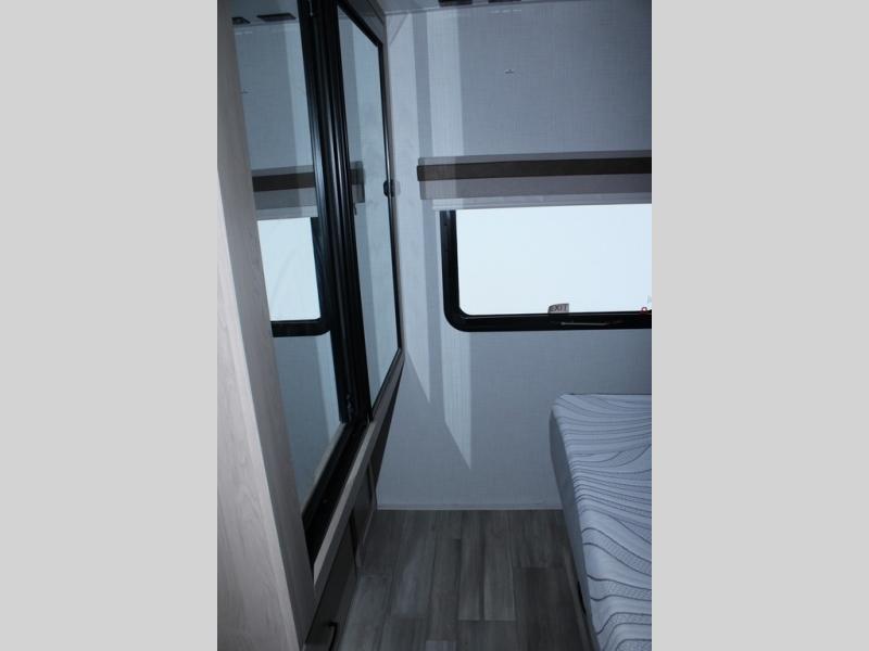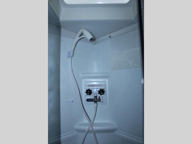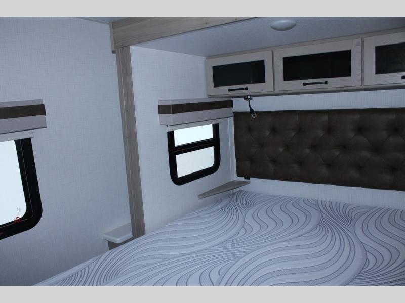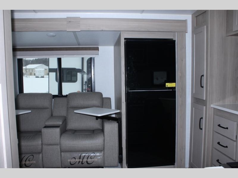 Escape the city life for weekend trips in this cozy couple's trailer. The dual entry doors will allow you to enter in through the rear private bedroom, or the front kitchen/main living area for convenience. You will enjoy relaxing on the theater seating across from the LED TV and fireplace in the evenings, or you can visit outdoors under the 19' power awning. You'll also find an exterior griddle here for quick meals and exterior storage for the fishing poles or hiking gear. This model also includes a walk-through bath with a shower skylight, a linen closet, plus a Showermiser Water Saving System. And don't worry about storage space inside since this model includes an entryway pantry/closet, a second pantry in the front kitchen, plus a large bedroom wardrobe to keep your clothes wrinkle-free!