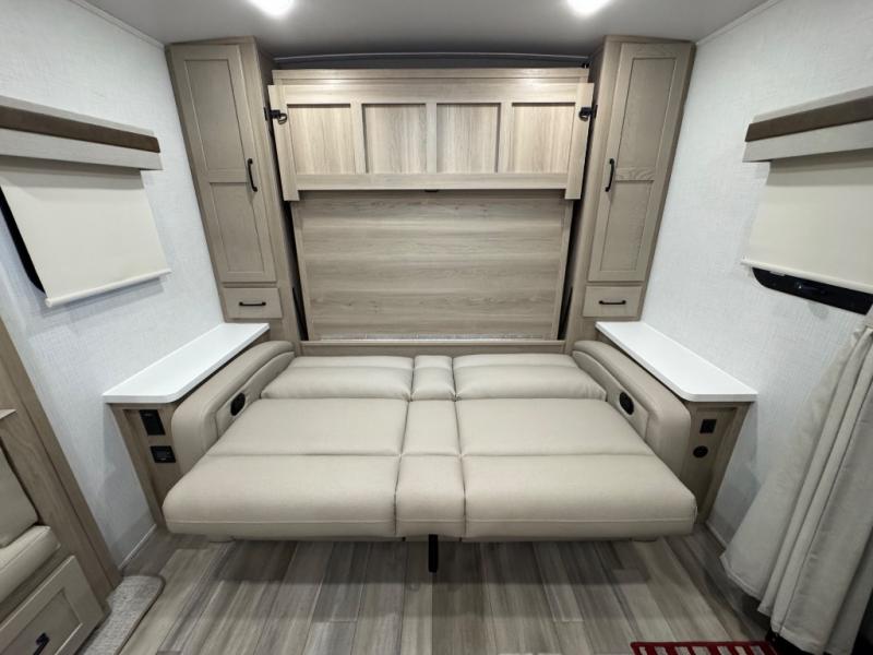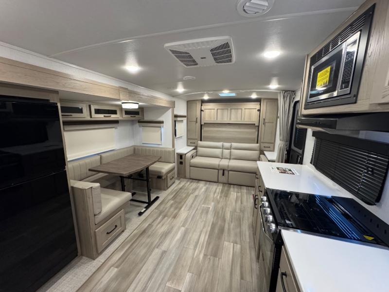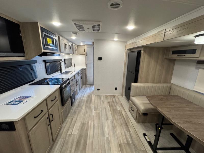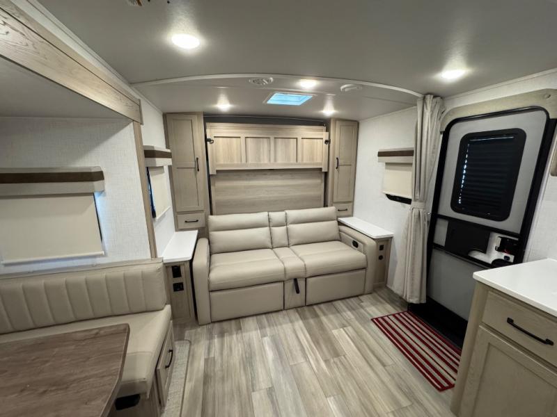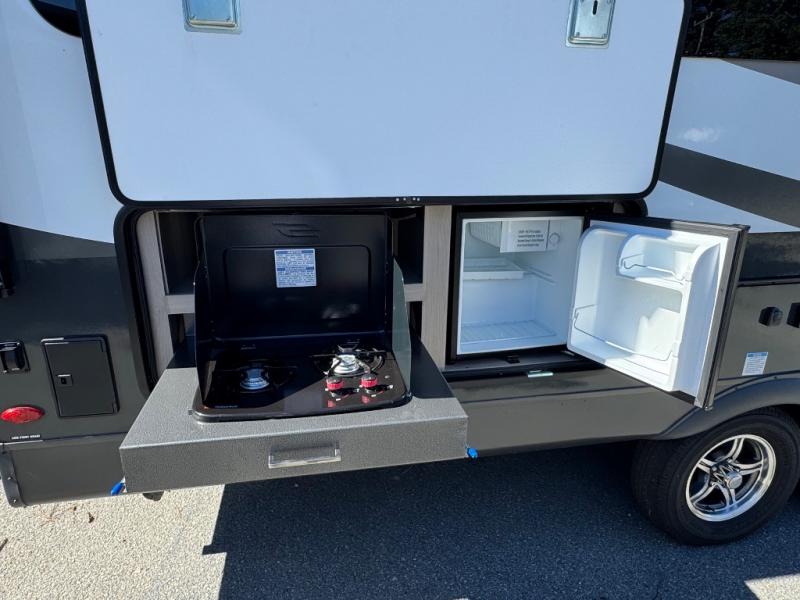 This is the perfect travel trailer for two or four people looking for comfortable and versatile camping trips! You will have your own Murphy bed to sleep on in the front at night, and during the daytime you can fold it up and have a 74" sofa in its place. No need to even make the bed! Breakfast can be made on the three burner cooktop inside, or head outdoors to cook on the outside griddle and pull-out stove under the 18' awning. The u-dinette offers ample room for everyone to gather for a meal or games, and can be transformed into sleeping space as well. This space could also feature an optional theater seat with a table or a hide-a-bed with table if you would prefer to replace the u-dinette. The kitchen features a refrigerator within the large slide as well as a microwave above the stove, plenty of counter space and overhead cabinets, plus the outside griddle and pull-out stove provide you plenty of options when it comes to preparing meals. On the exterior, you will find two storage compartments and a rear ladder for your convenience, plus more.
