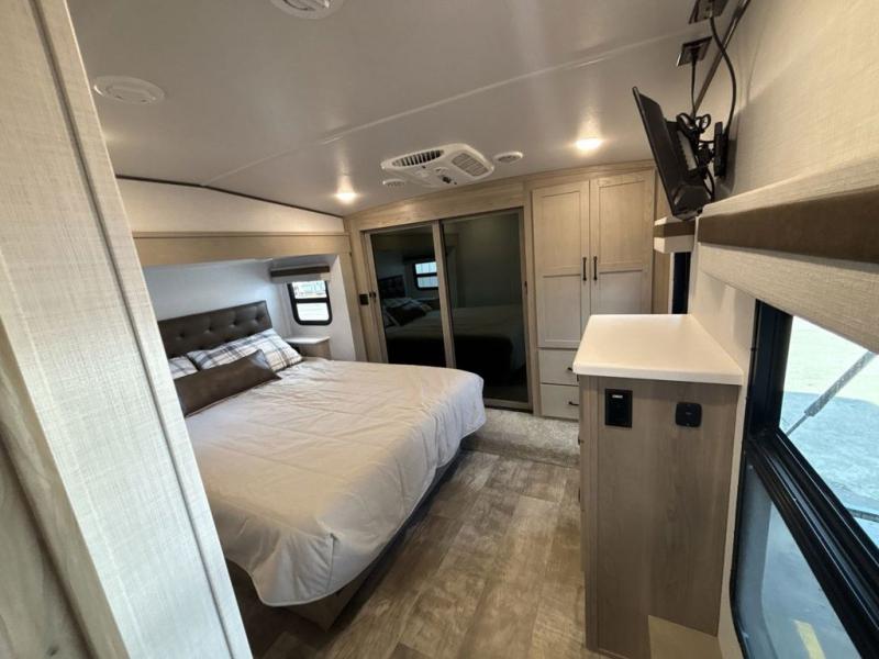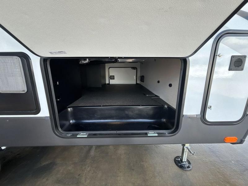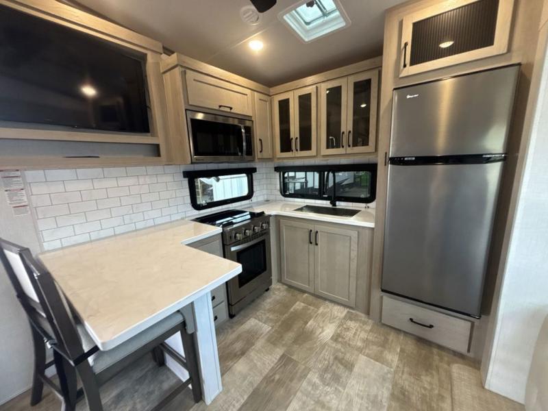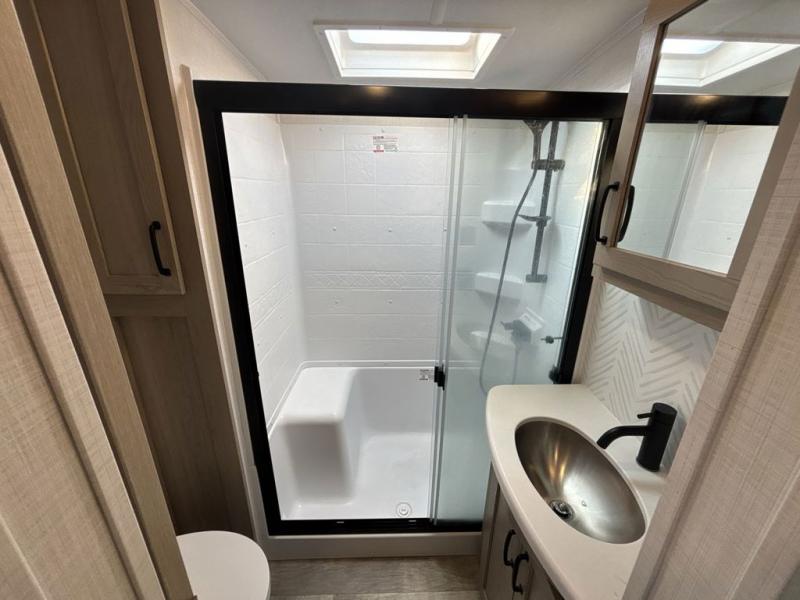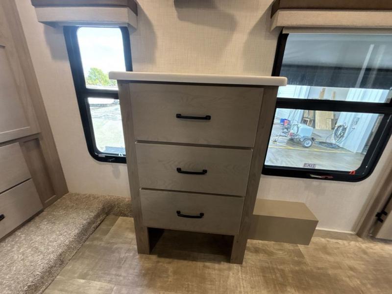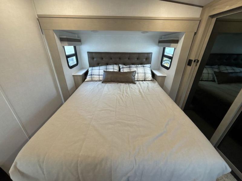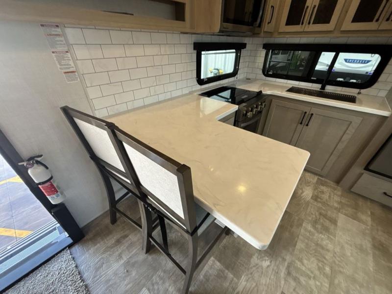 Looking for a spacious bedroom and bathroom for the perfect couple's RV with extra sleeping space for guests? This model provides a queen bed slide out for more interior floor space to get to the front wardrobe with shelves, and the dresser with a window above for great views of your campsite. The bathroom offers a shower with a seat, linen storage, and counter space for your toiletries. The main living and kitchen combined area has a hide-a-bed sofa slide that allows two guests to stay the night or you can choose the optional theater seat. There is also a breakfast bar with stools to dine at, and a U-shaped counter including appliances to make meals and store leftovers. And you will find exterior storage to bring along camping chairs and extra gear.