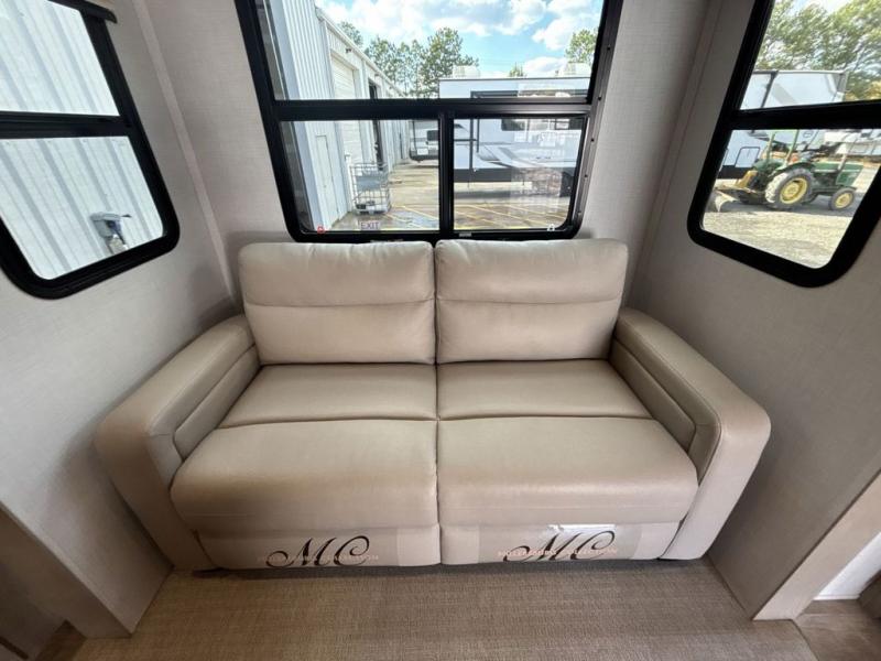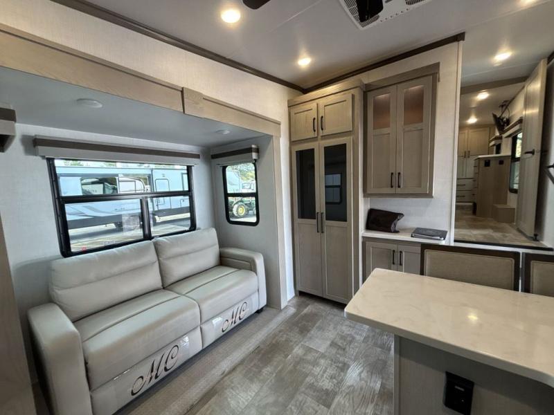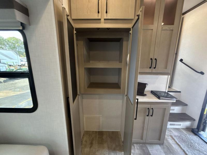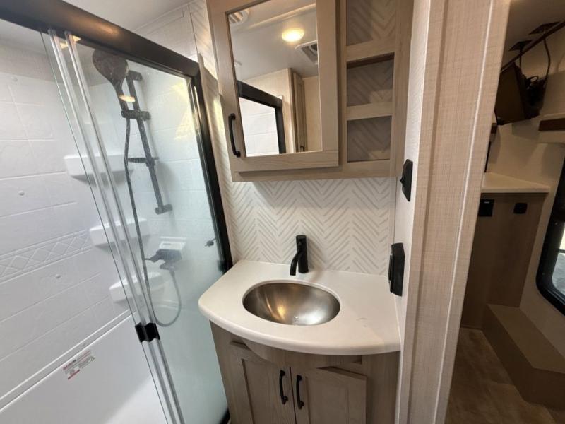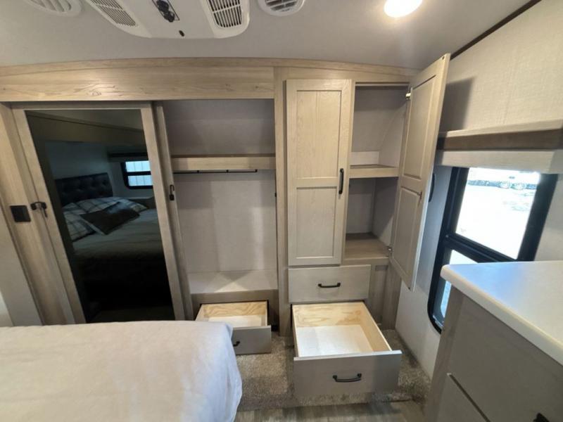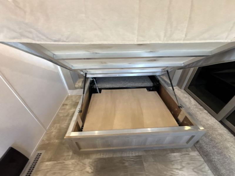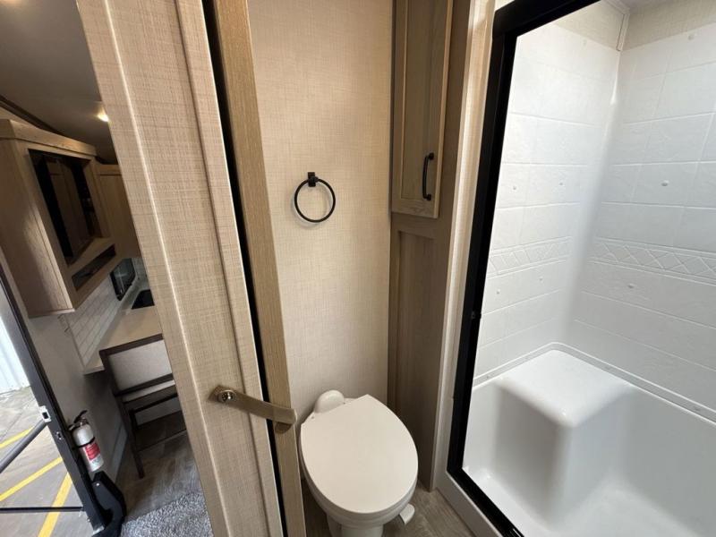 Looking for a spacious bedroom and bathroom for the perfect couple's RV with extra sleeping space for guests? This model provides a queen bed slide out for more interior floor space to get to the front wardrobe with shelves, and the dresser with a window above for great views of your campsite. The bathroom offers a shower with a seat, linen storage, and counter space for your toiletries. The main living and kitchen combined area has a hide-a-bed sofa slide that allows two guests to stay the night or you can choose the optional theater seat. There is also a breakfast bar with stools to dine at, and a U-shaped counter including appliances to make meals and store leftovers. And you will find exterior storage to bring along camping chairs and extra gear.