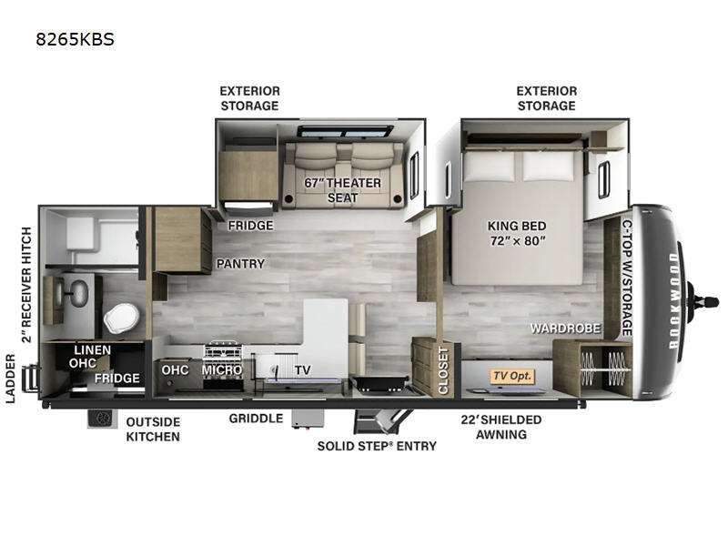 This couple's trailer is ready for adventure when you are! Once you arrive at your destination, prepare a quick lunch inside or outside with the outdoor kitchen and griddle, all while enjoying a bit of shade provided by the 22' power awning. You can eat outside, or inside at the counter with stools. The 67" theatre seat will make this travel trailer feel more like home, and the double slides provide more space to stretch out. Within the master bedroom you'll find a king bed slide, a wardrobe and a closet, plus countertop along the front wall with storage beneath, and a spot for an optional TV. And check out the rear bath with linen storage, a vanity, and a shower with a seat! Now, that's what I call comfort!