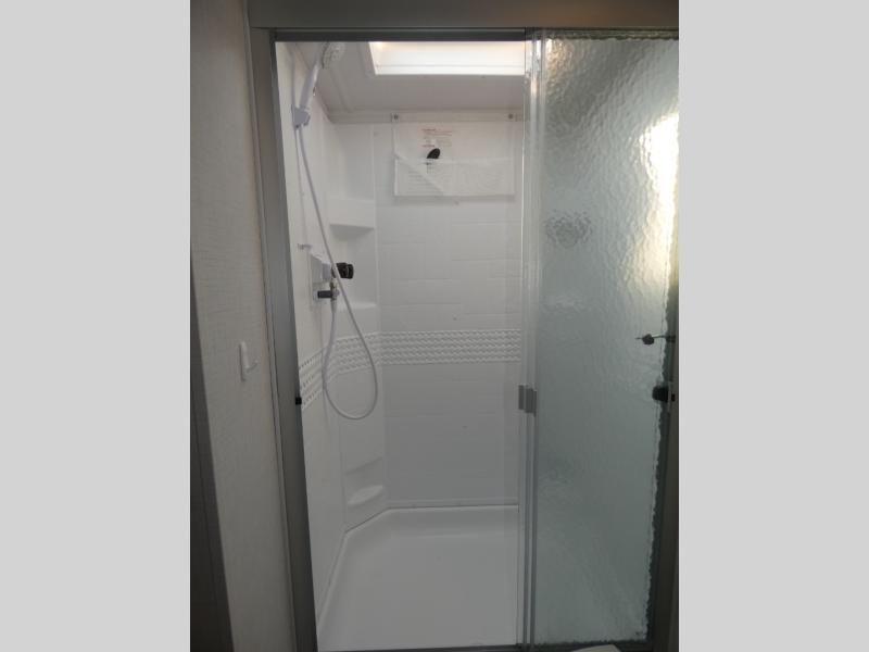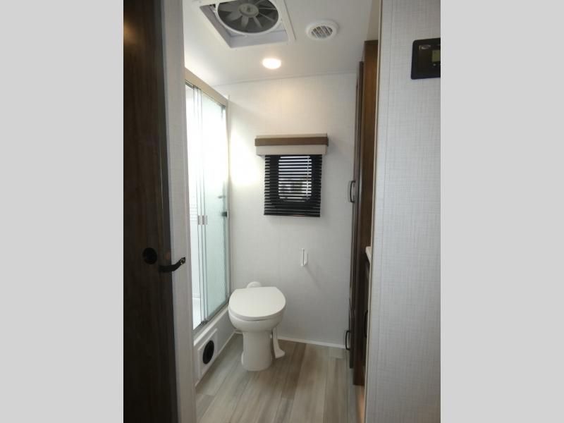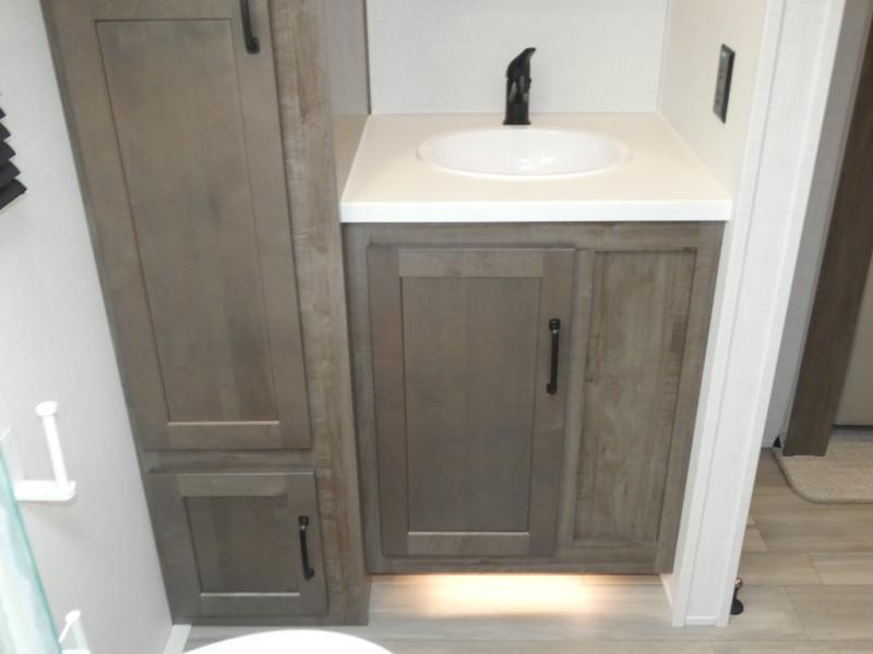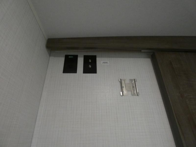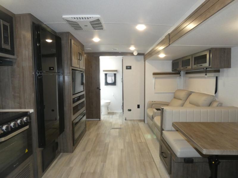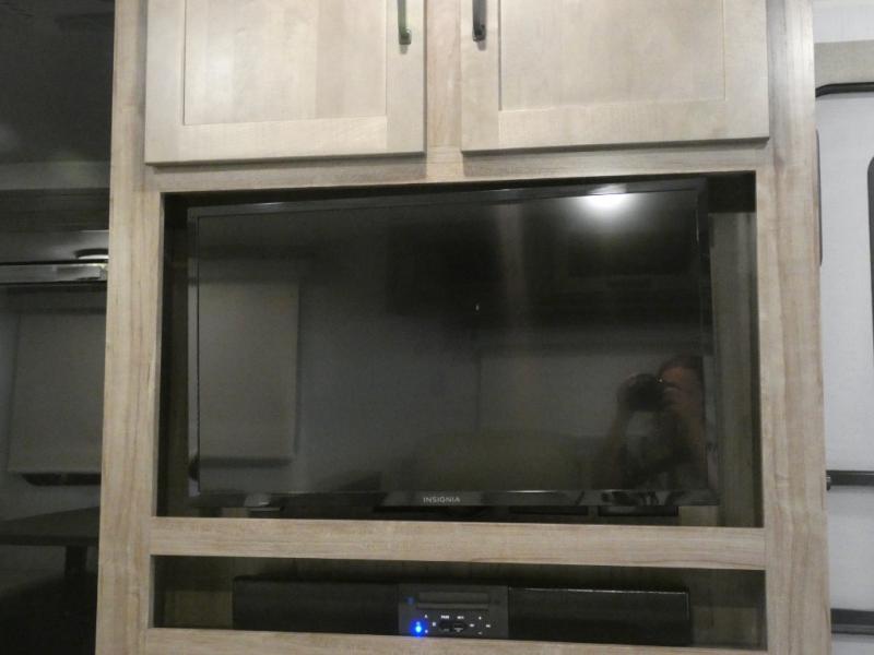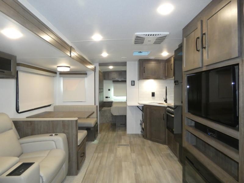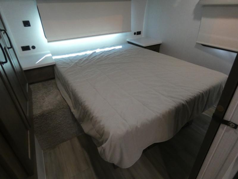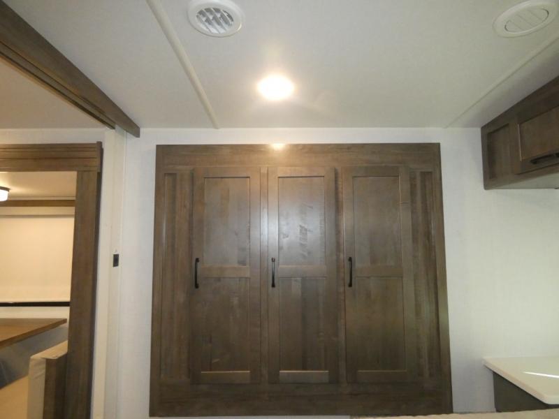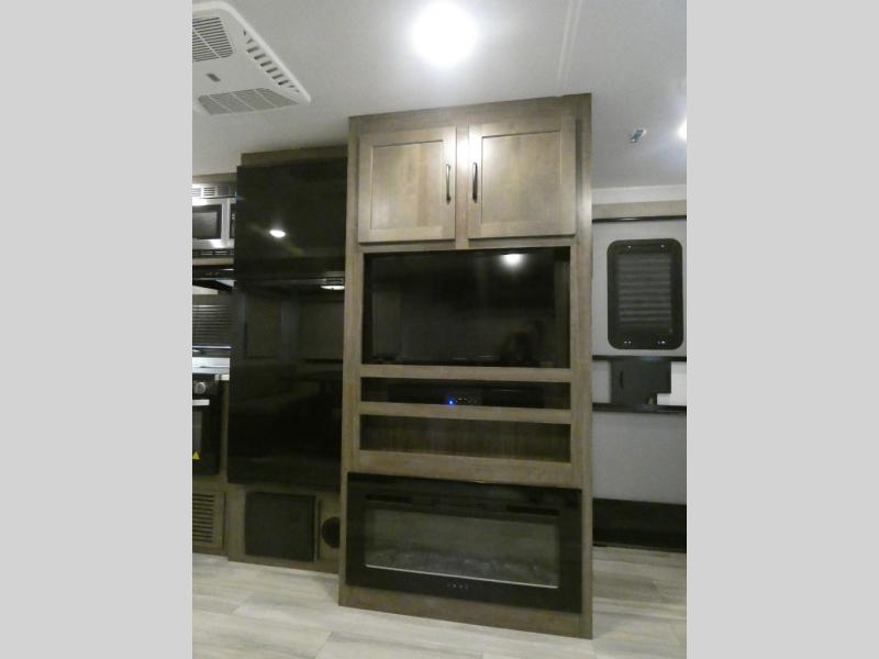 This trailer is the perfect couple's retreat with its private bedroom up front which includes a queen bed, a slide out wardrobe and a TV option. The spacious rear full bathroom provides a shower and linen storage, and a space savings sliding door. The cook will have full amenities with ample counter space, a walk-in pantry for food storage, and a three burner range to cook meals on. If the weather is nice outside, you can make dinner on the exterior griddle, and there is a 21' power awning with LED lights to relax under. Or you can stay inside to enjoy the fireplace and Smart TV! You will also appreciate the pass thru storage with a steel sliding tray to easily access gear!