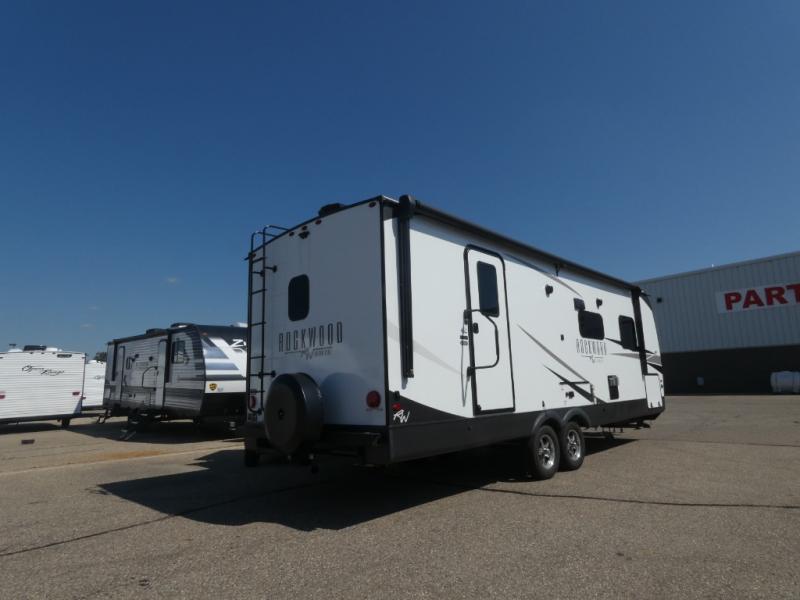 Each Rockwood Ultra Lite travel trailer by Forest River includes superior construction with a high gloss front cap, laminated white fiberglass sidewalls, and tinted frameless windows for a sleek look. You will love how easy it will be to charge a few electronics with the 200W roof solar panel with an 1800W inverter, and the AIR 360+ omnidirectional antenna with WiFi prep will let you stay connected to the outside world as you camp. The torsion axle, Rubber-Ryde suspension will make towing smooth and hassle-free, along with the nitrogen filled, Goodyear Endurance tires and the tire pressure monitor system. Interior comforts include designer kitchen backsplash, solid wood cabinet doors with hidden hinges, and night roller shades to name a few. Choose a Rockwood Ultra Lite travel trailer today!