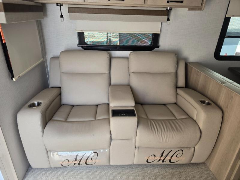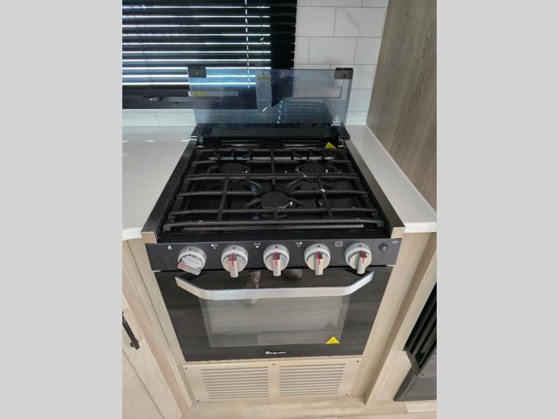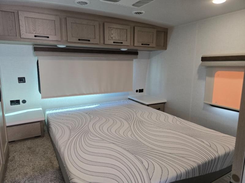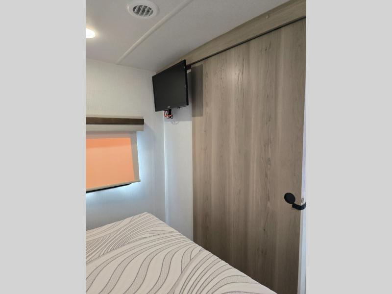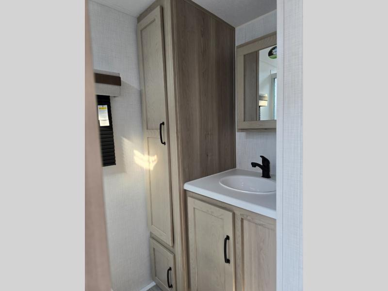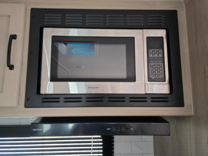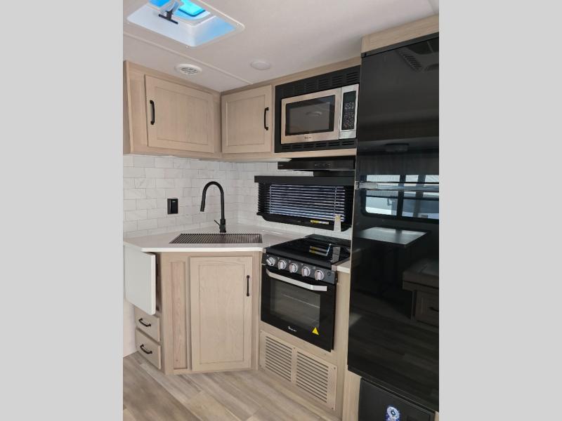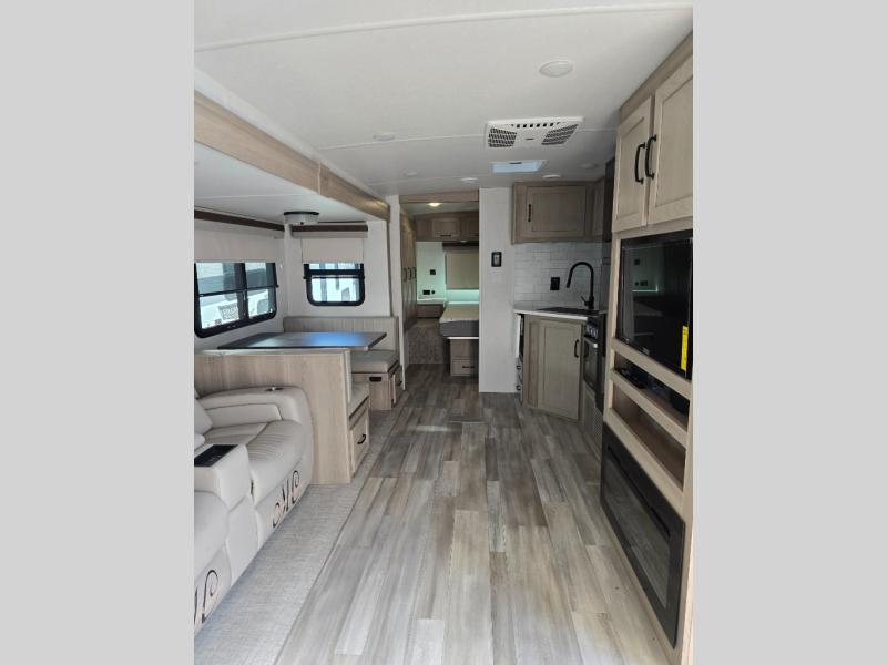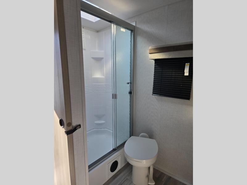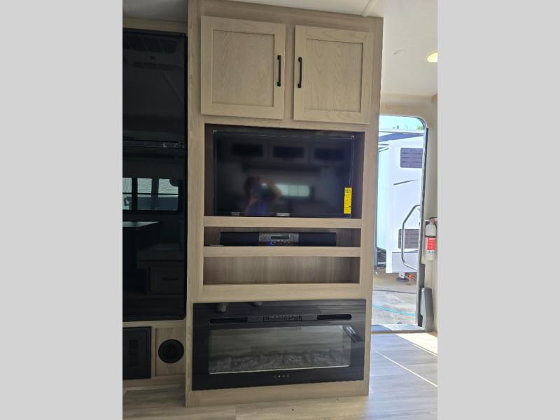 This trailer is the perfect couple's retreat with its private bedroom up front which includes a queen bed, a slide out wardrobe and a TV option. The spacious rear full bathroom provides a shower and linen storage, and a space savings sliding door. The cook will have full amenities with ample counter space, a walk-in pantry for food storage, and a three burner range to cook meals on. If the weather is nice outside, you can make dinner on the exterior griddle, and there is a 21' power awning with LED lights to relax under. Or you can stay inside to enjoy the fireplace and Smart TV! You will also appreciate the pass thru storage with a steel sliding tray to easily access gear!