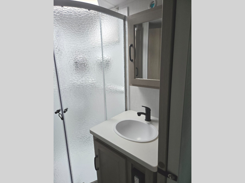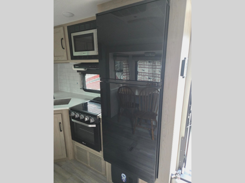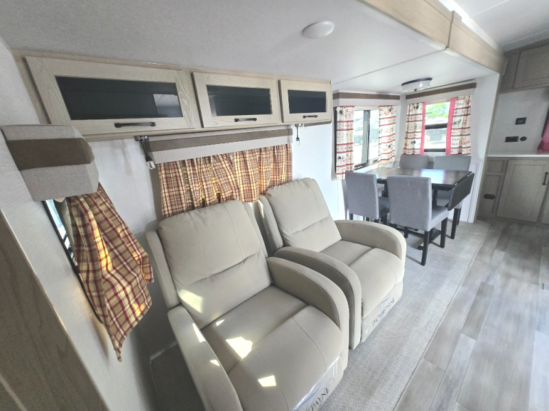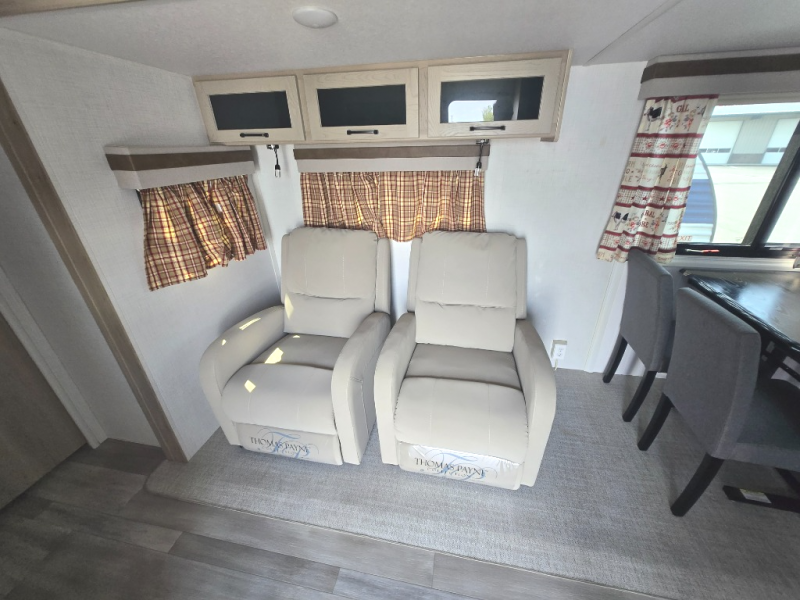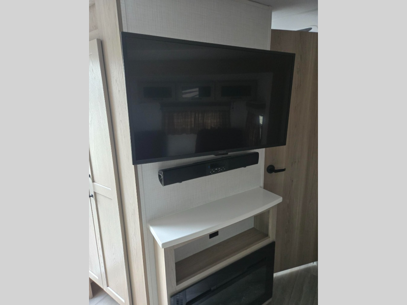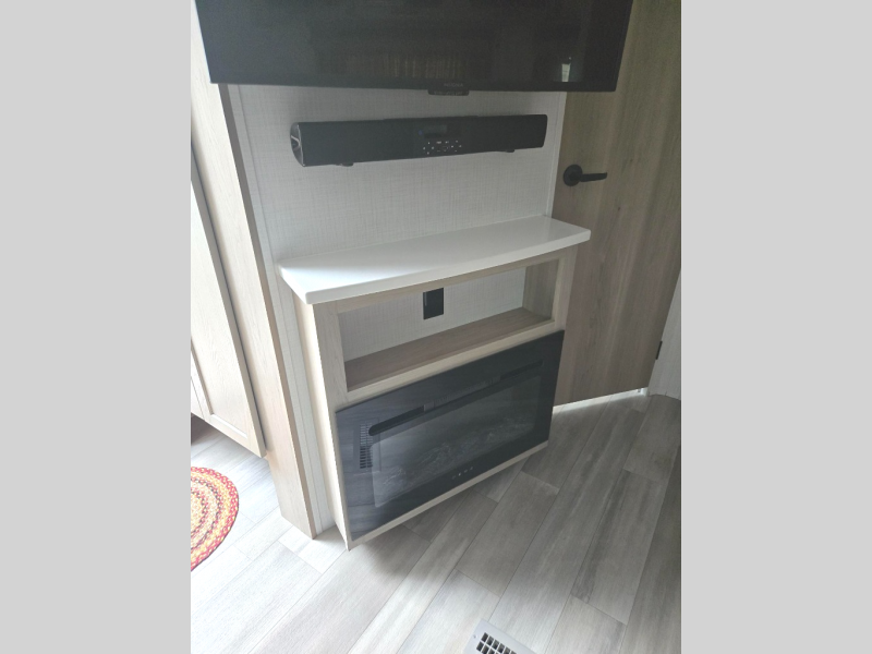 When you are outside this trailer you can enjoy the protection from the 21' power awning, and whip up a meal using the outside griddle. You will find exterior storage for your extra gear, and a ladder at the rear. You get to choose which entrance to step up into, be it the spacious rear bedroom with a queen bed slide and a wardrobe, or the main entry into the kitchen and living area. The furniture slide includes a booth dinette to eat your meals at, and theater seating to watch the Smart TV with a fireplace below. And the cook will love the front kitchen with extra counter space, a three burner range, plus a 12V refrigerator and pantry for food storage!