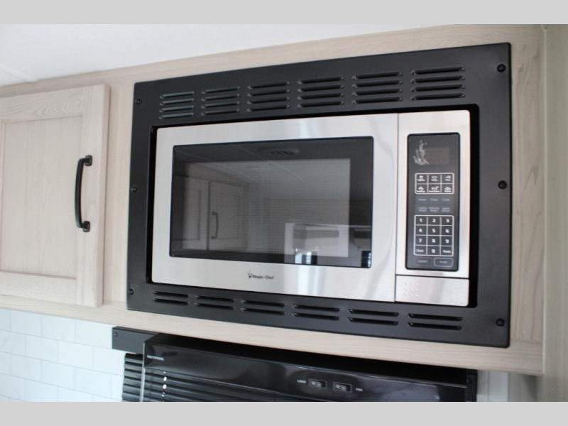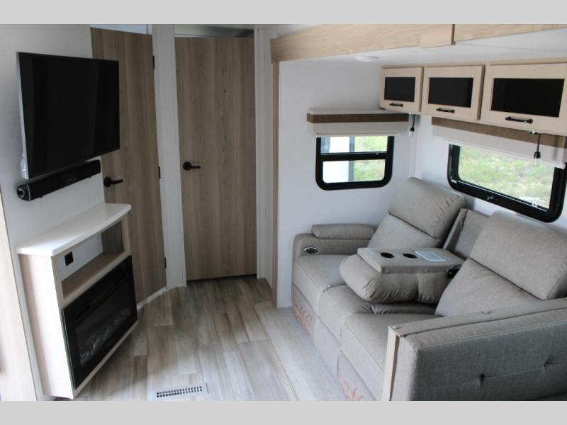 When you are outside this trailer you can enjoy the protection from the 21' power awning, and whip up a meal using the outside griddle. You will find exterior storage for your extra gear, and a ladder at the rear. You get to choose which entrance to step up into, be it the spacious rear bedroom with a queen bed slide and a wardrobe, or the main entry into the kitchen and living area. The furniture slide includes a booth dinette to eat your meals at, and theater seating to watch the Smart TV with a fireplace below. And the cook will love the front kitchen with extra counter space, a three burner range, plus a 12V refrigerator and pantry for food storage!
