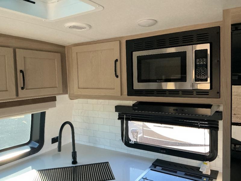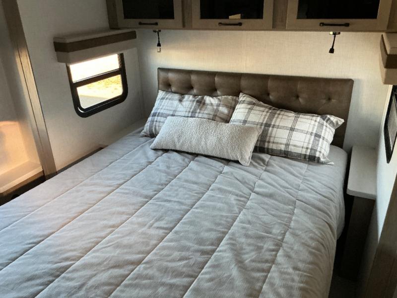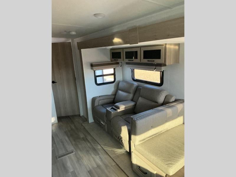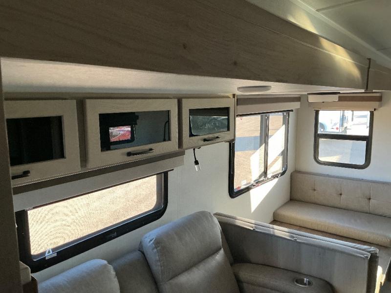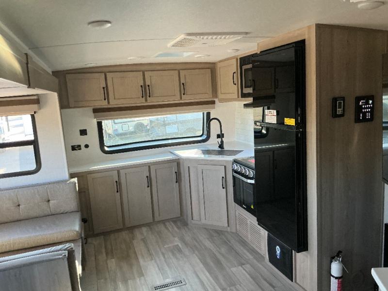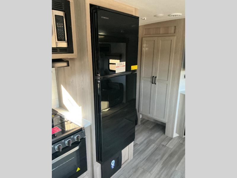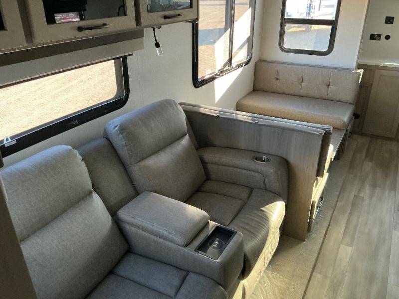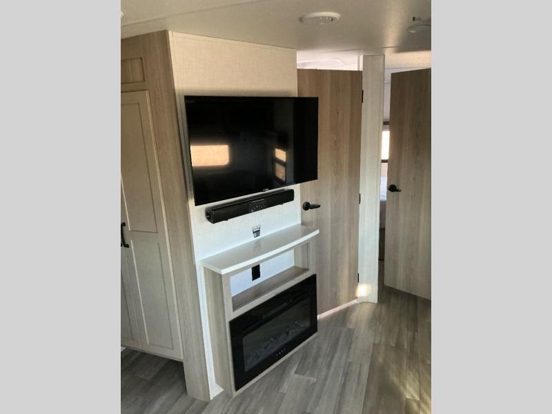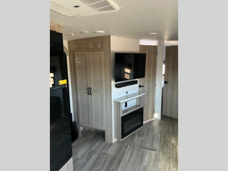 When you are outside this trailer you can enjoy the protection from the 21' power awning, and whip up a meal using the outside griddle. You will find exterior storage for your extra gear, and a ladder at the rear. You get to choose which entrance to step up into, be it the spacious rear bedroom with a queen bed slide and a wardrobe, or the main entry into the kitchen and living area. The furniture slide includes a booth dinette to eat your meals at, and theater seating to watch the Smart TV with a fireplace below. And the cook will love the front kitchen with extra counter space, a three burner range, plus a 12V refrigerator and pantry for food storage!