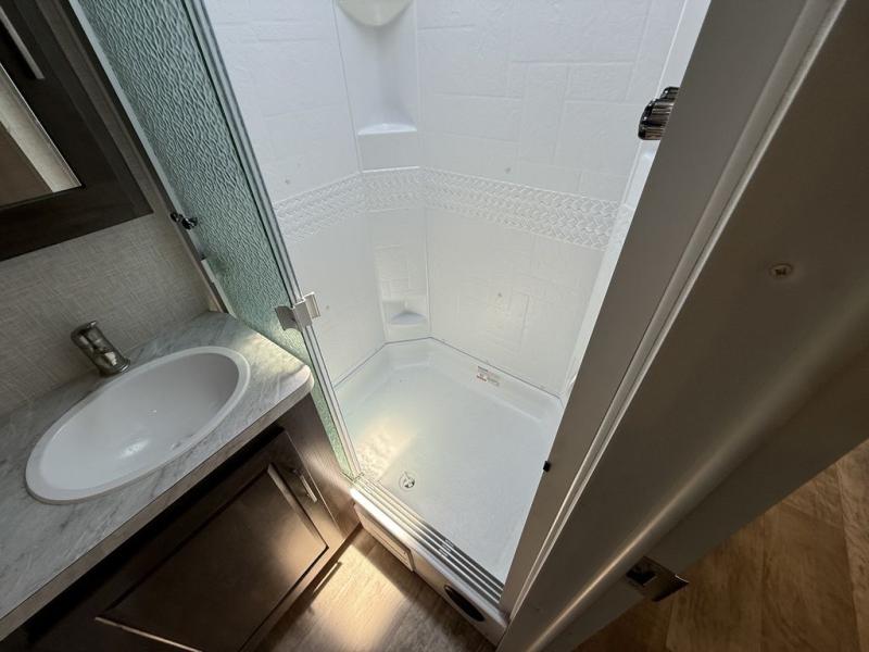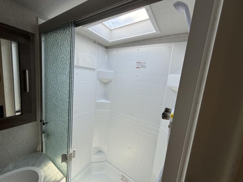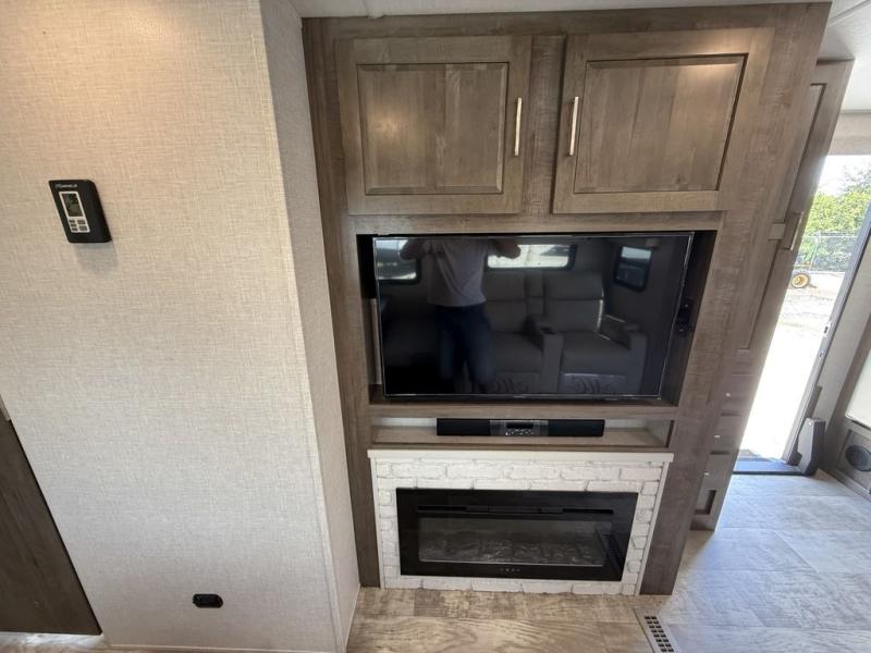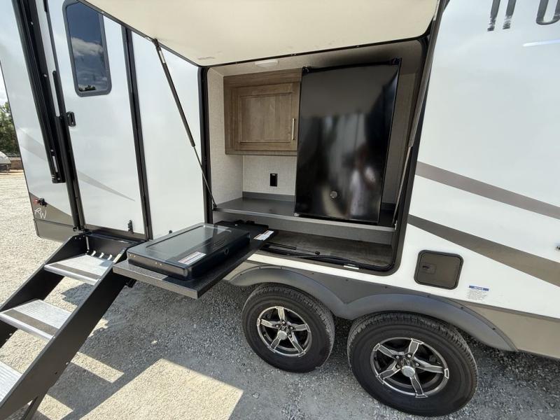 Whether you camp to relax or seek adventure, this trailer will be available for you to be comfortable indoors or outdoors! You will find there are many convenient features throughout including the dual entry doors, the 12V refrigerator and the pantry being next to the main entry for easy access, and the outside kitchen gives the cook choices when making meals. The interior rear kitchen includes full amenities, the theater seating and booth dinette slide offer seating and sleeping space, and the full bathroom gives you counter space to place your toiletries and such plus a shower to get cleaned up in each night. The front bedroom offers privacy, a queen bed slide, clothing storage and the second entry door.