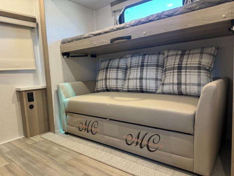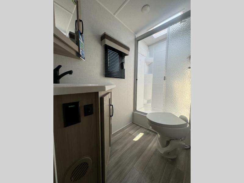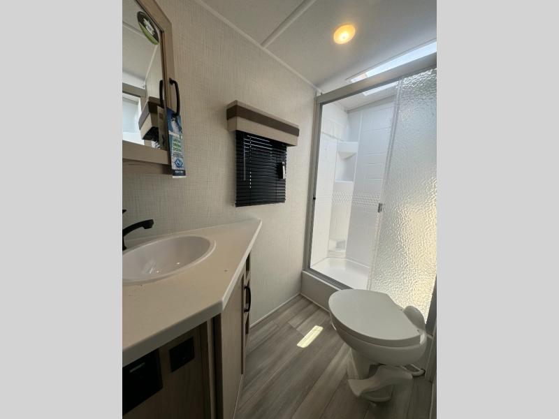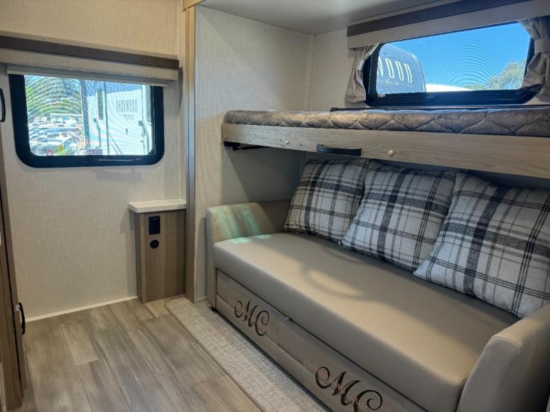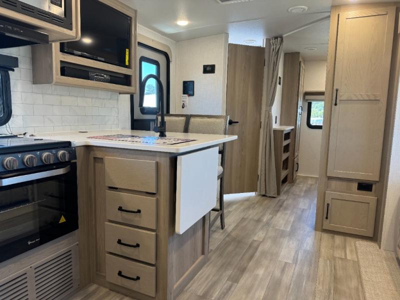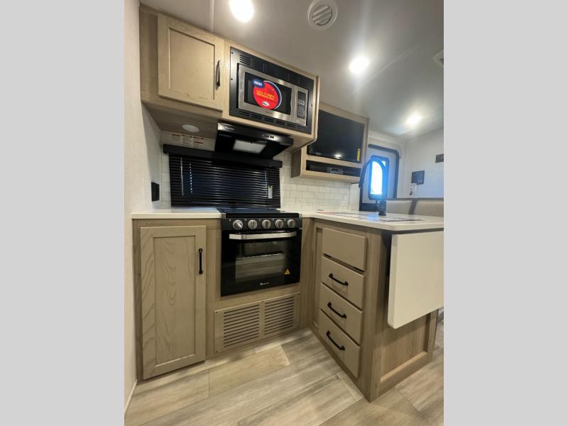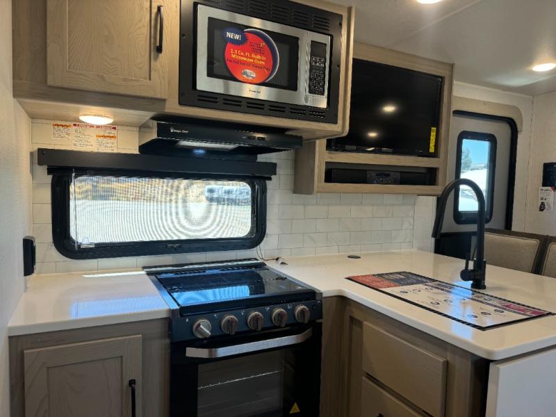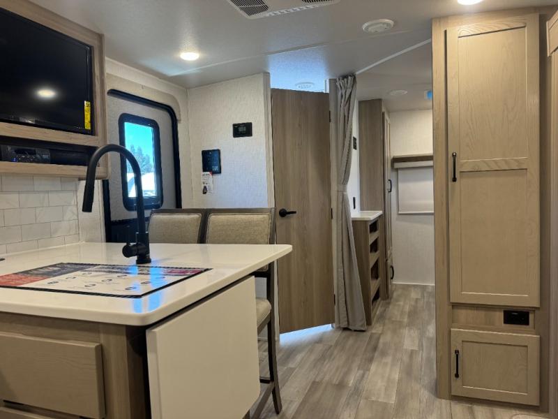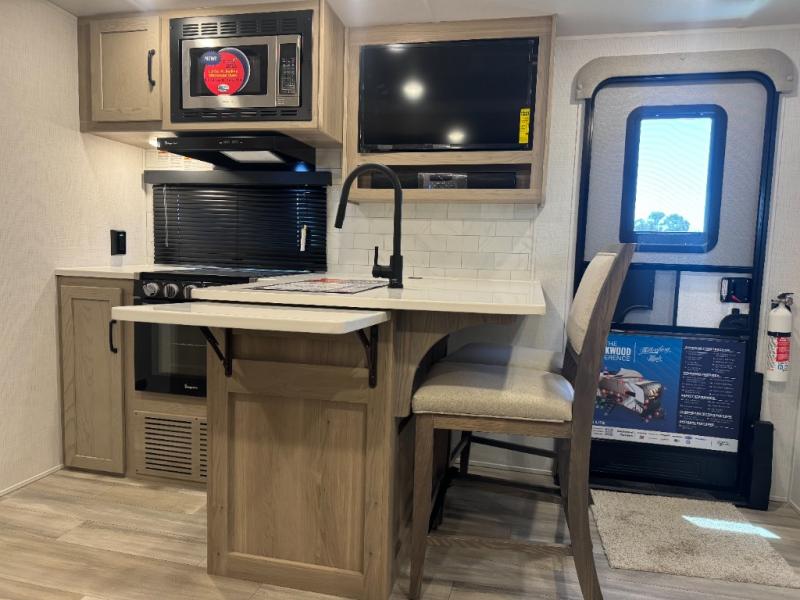 This is the perfect travel trailer to camp with friends and family since it has a private bunkhouse in the back with a flip-up bunk and a 68" sofa. The full bath is close by, as well as the main entry door for convenience. You'll find the second entry door leading into the front private bedroom that includes a queen-size bed, a wardrobe slide out, and an optional TV if you enjoy movies in bed. The U-shaped kitchen includes everything you need to prepare meals each day, and there is even an exterior griddle if you like to cook outside. In the evening, your crew can get comfortable on the theater seat or choose the optional hide-a-bed sofa if you're needing more sleeping space!