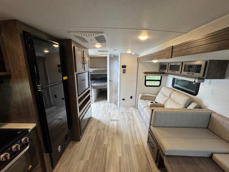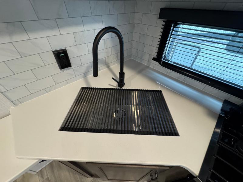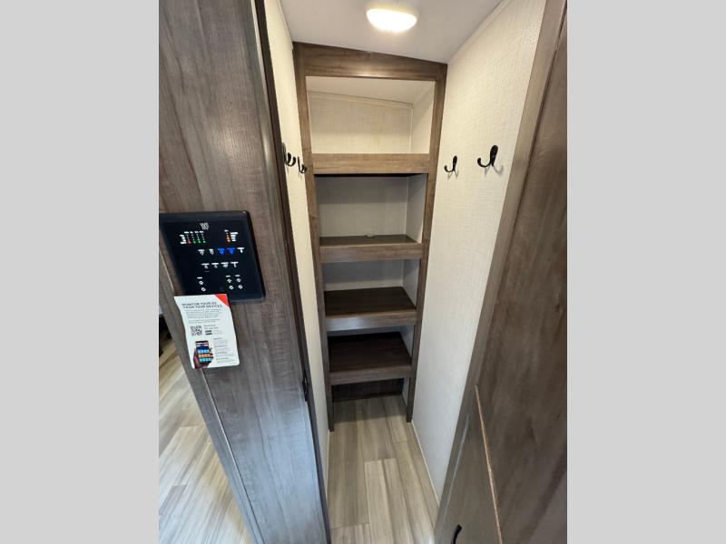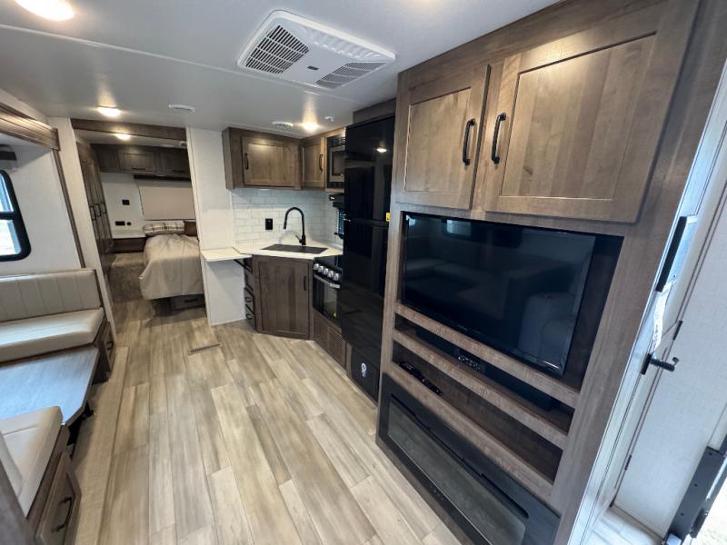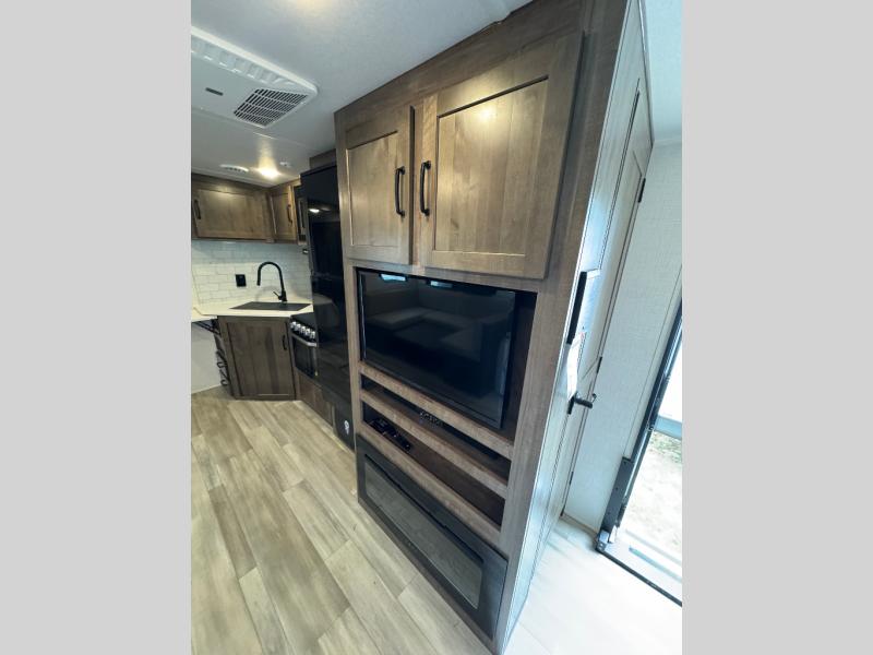 Looking for a trailer that sleeps eight, allows you to cook indoors or outdoors, and offers dual entry for convenience when you travel? This trailer provides for those wants and needs, and even more! The outside kitchen gives you more choices when feeding the masses along with the outside griddle, and the interior kitchen includes an L-shaped area for the cook to have their own space with full amenities including a walk-in pantry to bring along everything they need. The full bathroom will keep everyone refreshed, and the theater seating and U-shaped dinette offer seating inside to enjoy the Smart TV and fireplace. There is plenty of storage found throughout the interior, and along the exterior you will find several places to stow your outdoor items including in the pass thru storage with a steel sliding tray.