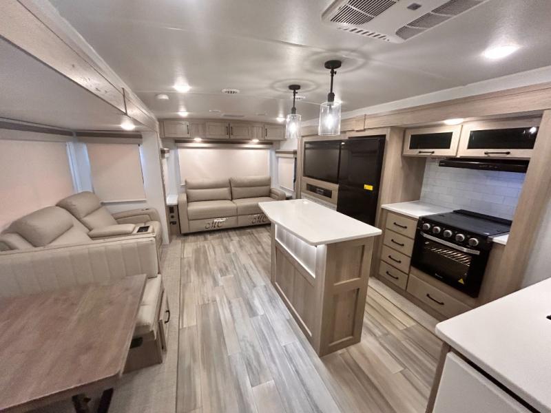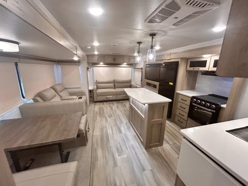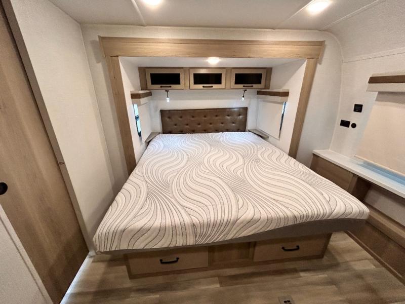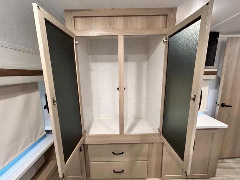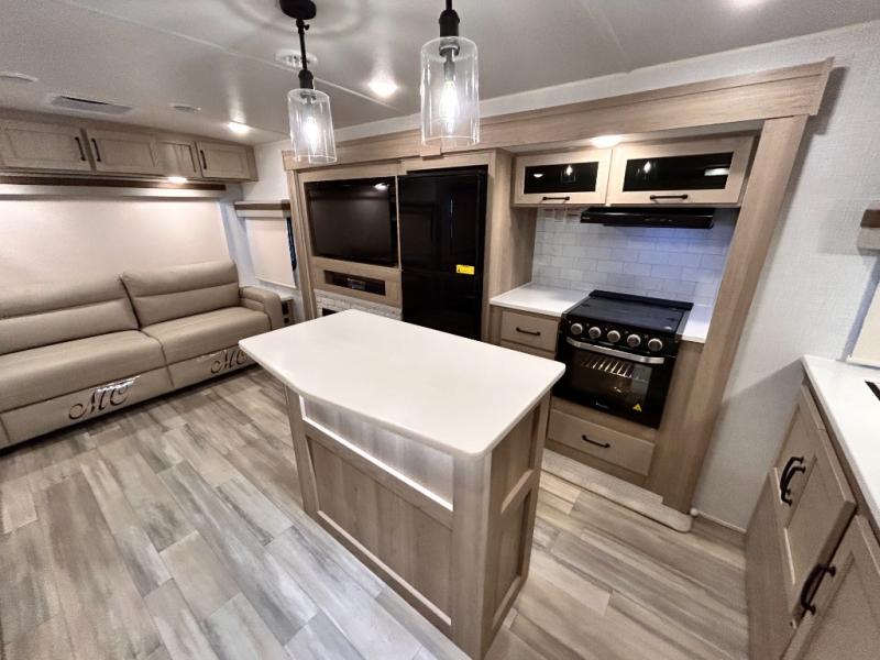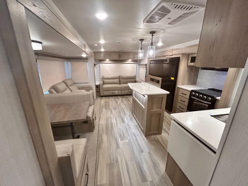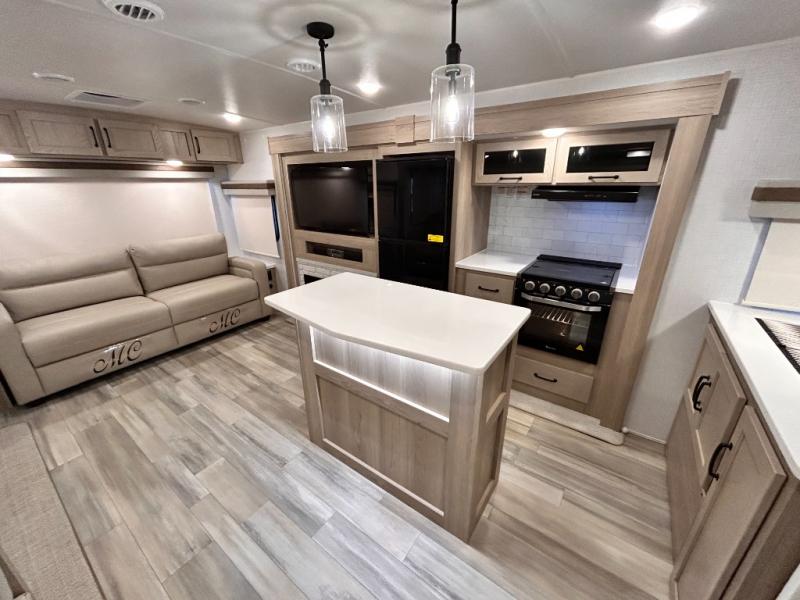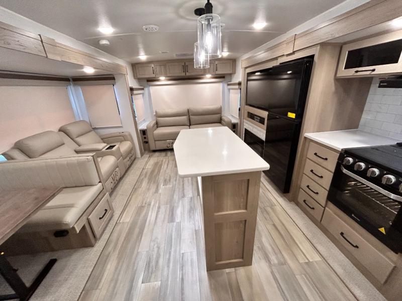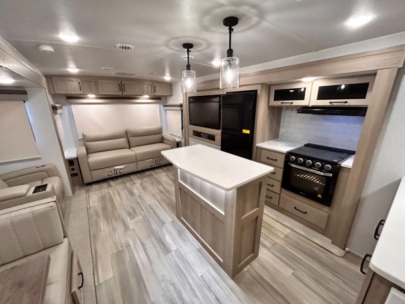 This trailer allows you to seat nine people, and the kitchen island provides a great place for the snacks and beverages. The dual opposing slides give the main living and kitchen area lots of floor space for everyone to move around, and the double entry bath is convenient with access from the hallway and the master suite. The front bedroom offers a queen bed slide, a wardrobe and storage along the front wall, plus you can choose to add an optional TV. And the two 11' power awnings give you an outdoor living area protected from the elements, just add your camping chairs.