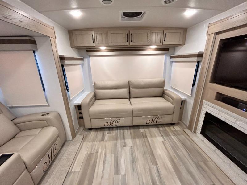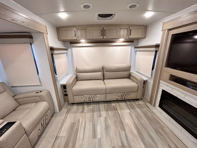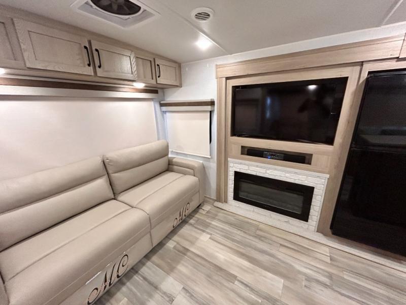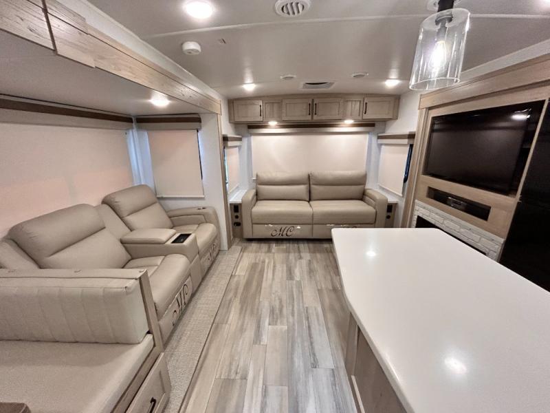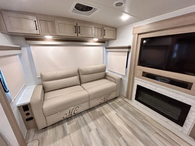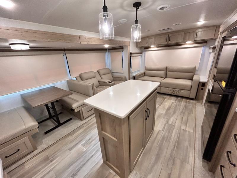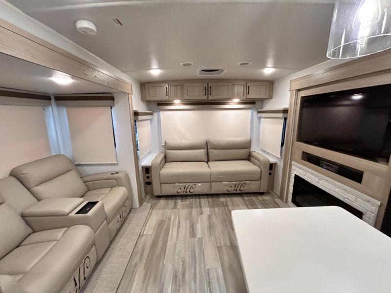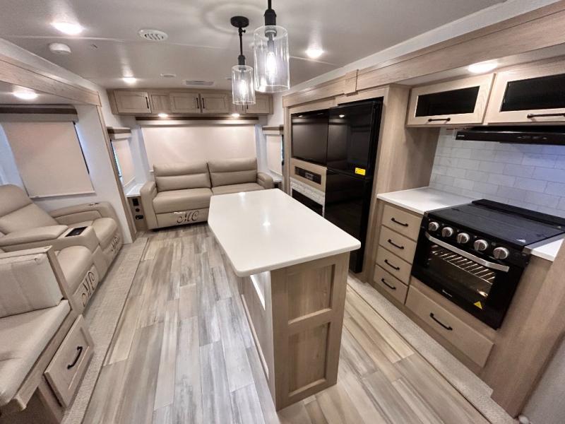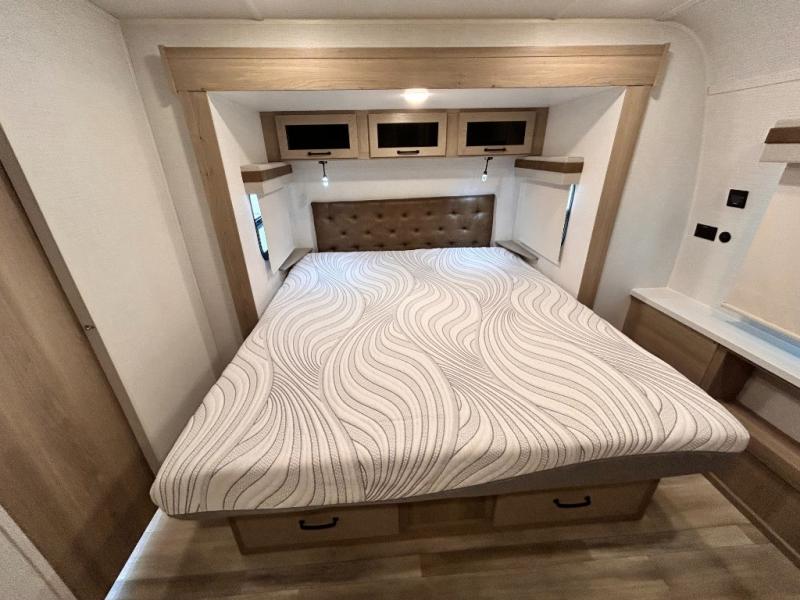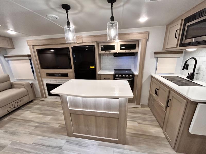 This trailer allows you to seat nine people, and the kitchen island provides a great place for the snacks and beverages. The dual opposing slides give the main living and kitchen area lots of floor space for everyone to move around, and the double entry bath is convenient with access from the hallway and the master suite. The front bedroom offers a queen bed slide, a wardrobe and storage along the front wall, plus you can choose to add an optional TV. And the two 11' power awnings give you an outdoor living area protected from the elements, just add your camping chairs.