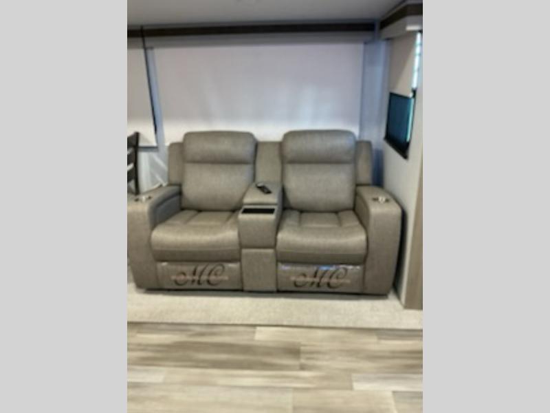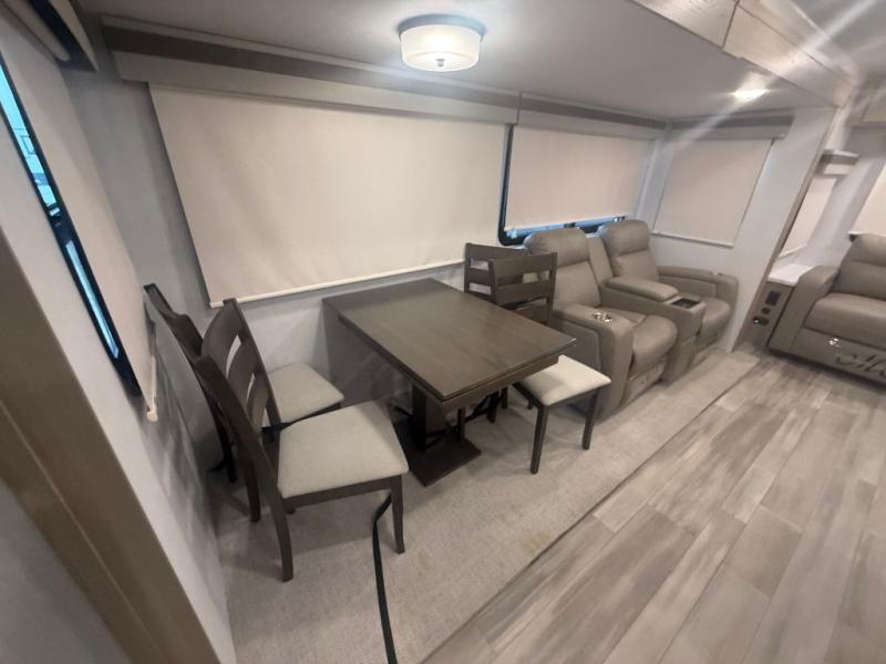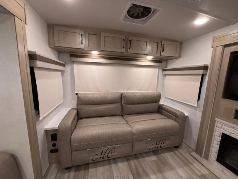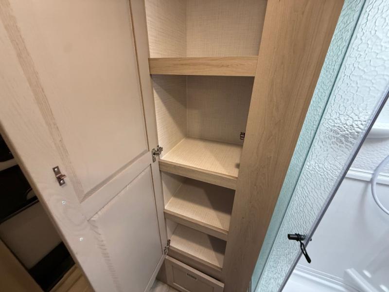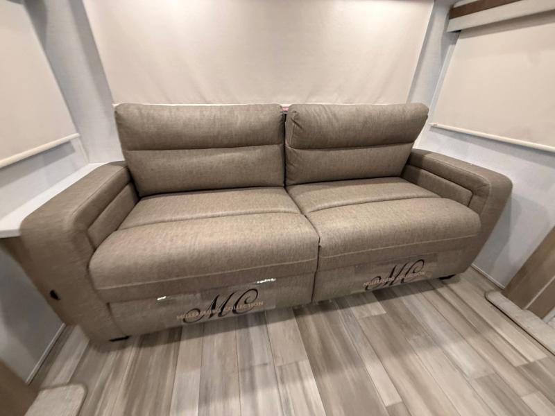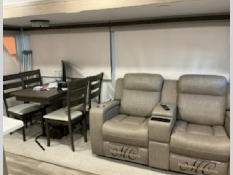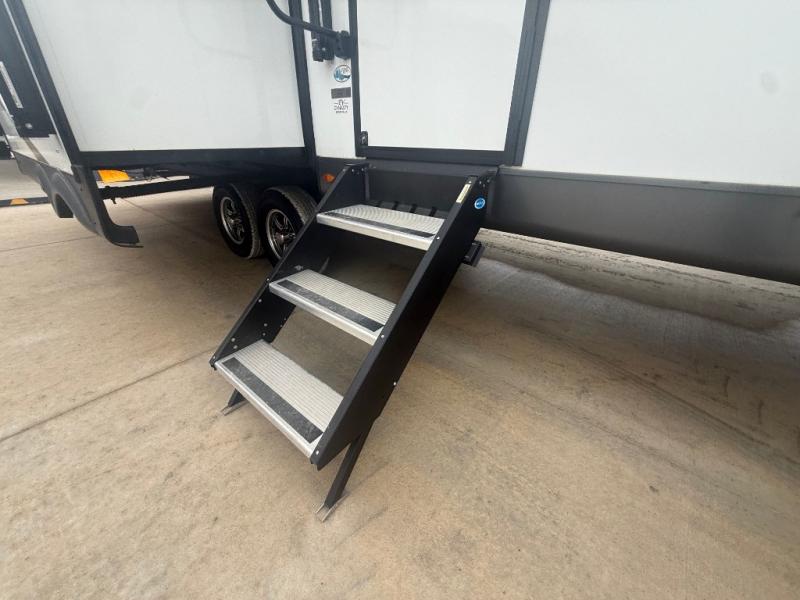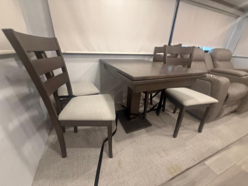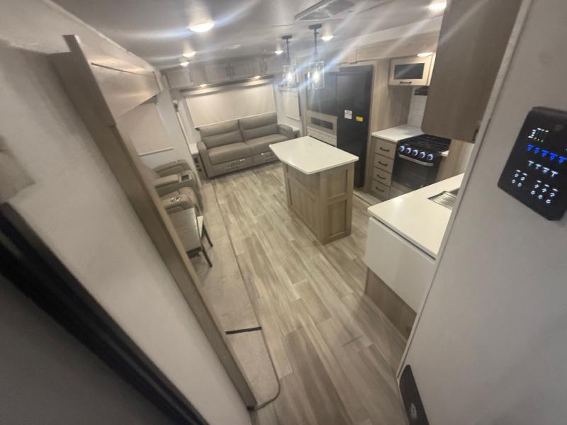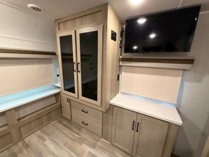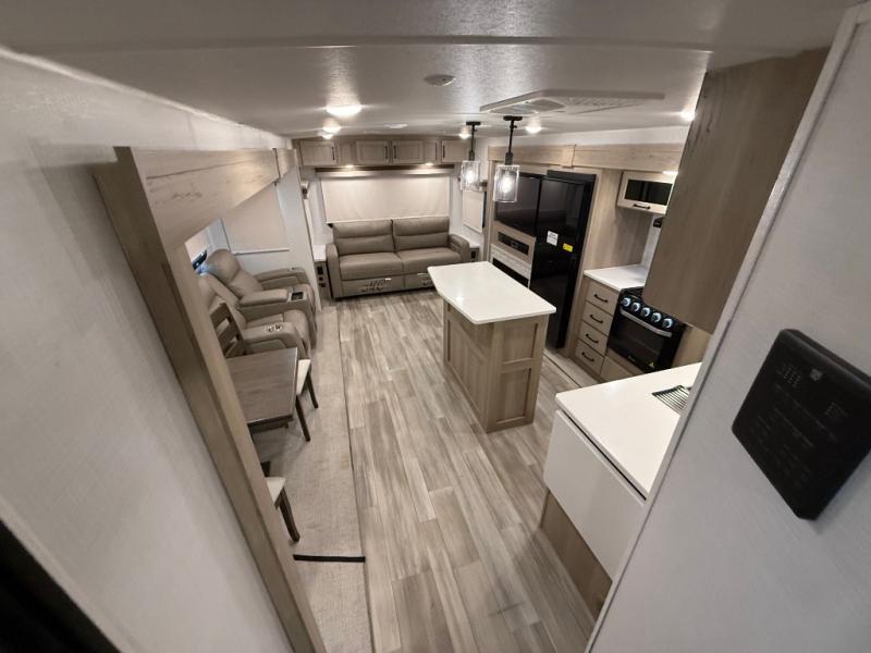 This trailer allows you to seat nine people, and the kitchen island provides a great place for the snacks and beverages. The dual opposing slides give the main living and kitchen area lots of floor space for everyone to move around, and the double entry bath is convenient with access from the hallway and the master suite. The front bedroom offers a queen bed slide, a wardrobe and storage along the front wall, plus you can choose to add an optional TV. And the two 11' power awnings give you an outdoor living area protected from the elements, just add your camping chairs.
