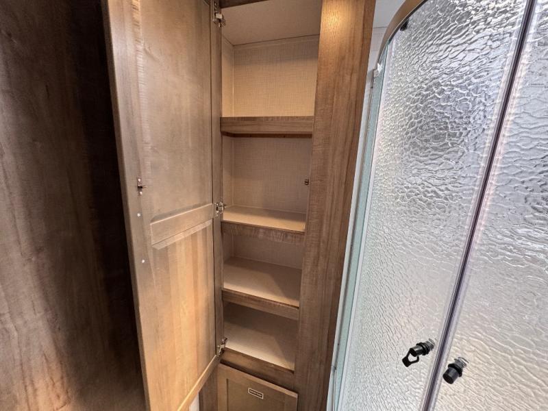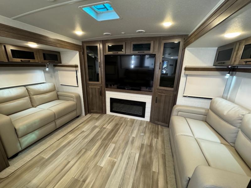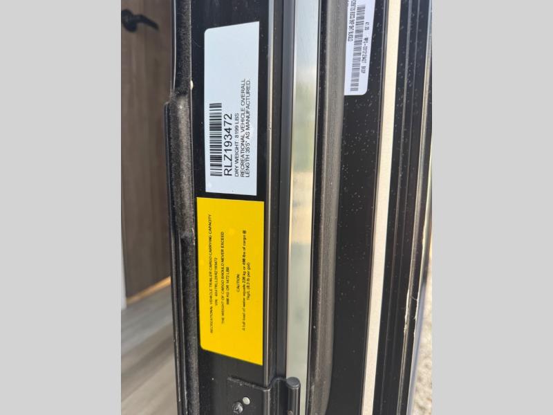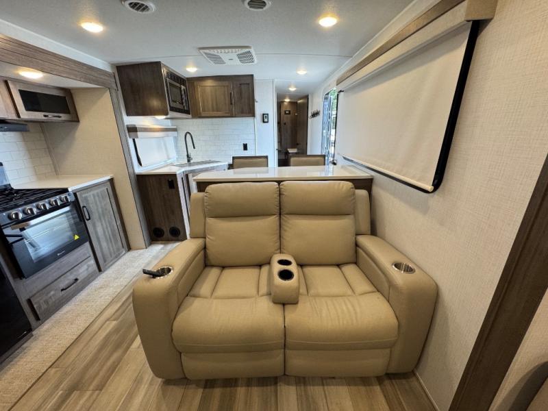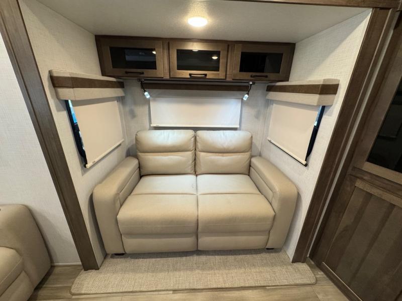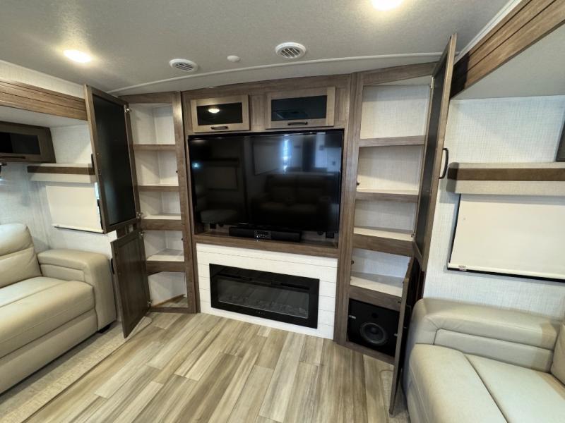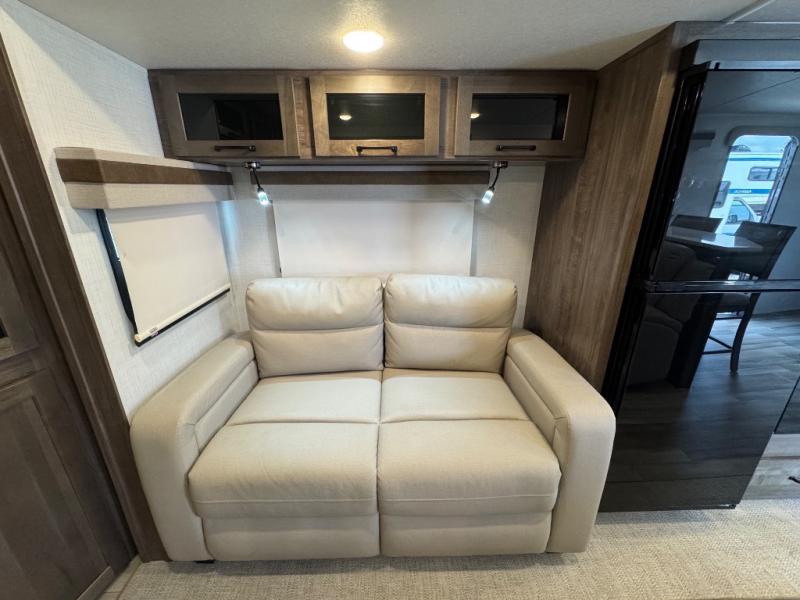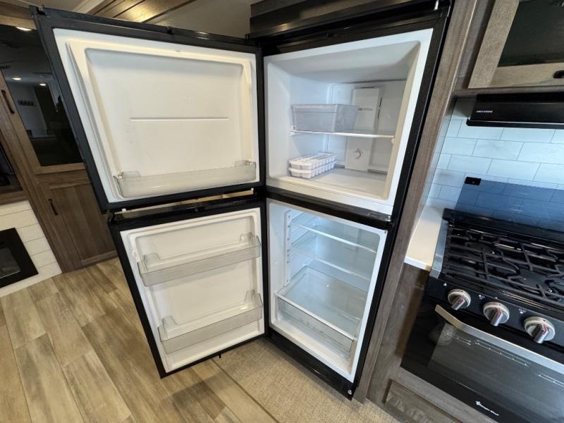 Enjoy trips to the lake in this travel trailer with triple slides! The rear living area includes a rear entertainment center, a 60" theater seat, plus two hide-a-bed sofas, which allows this room to double as your guests' bedroom at night. You'll enjoy the front private bedroom all to yourselves, and the full bath is close by for convenience. The chef of your group will love the full kitchen with a three burner range, a 21" gas oven, and a 12V refrigerator to hold perishables. And don't overlook the exterior with its outside storage, 21' power awning with LED lights, and exterior griddle!
