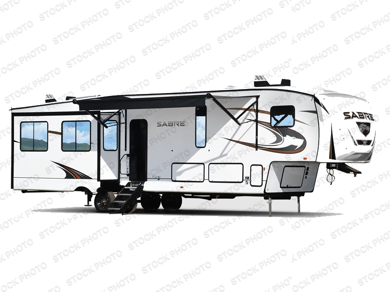 You will experience luxurious camping trips at an affordable price with any one of these Forest River Sabre fifth wheels! These models are durable and ready to travel anytime of the year thanks to features like the high-gloss gel-coat front cap with LED lighting, the PVC roof membrane, and the forced air underbelly with enclosed gate valves. The electric auto-leveling system makes setting up easy and safe, and the adjustable power awning with LED lighting will create an inviting outdoor living space. Each model includes a universal docking station which includes a black tank flush and an outside shower, and detachable and adjustable stable steps for you to enter and exit the unit safely. Inside, you will love the design of the ambient accent lighting above the crown molding in the living area, the real wood lumbercore cabinetry, and the vintage gaslight decorative lighting!