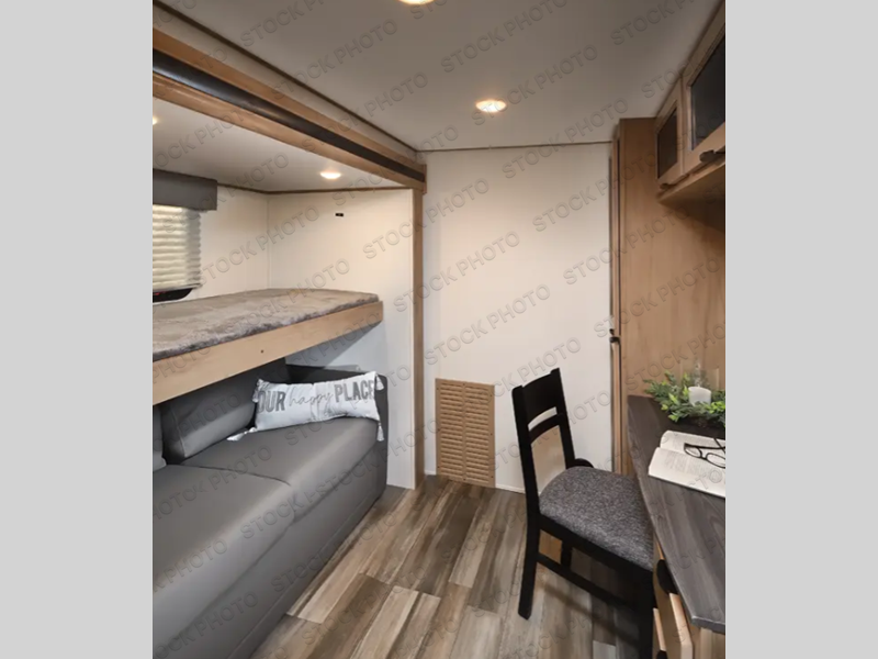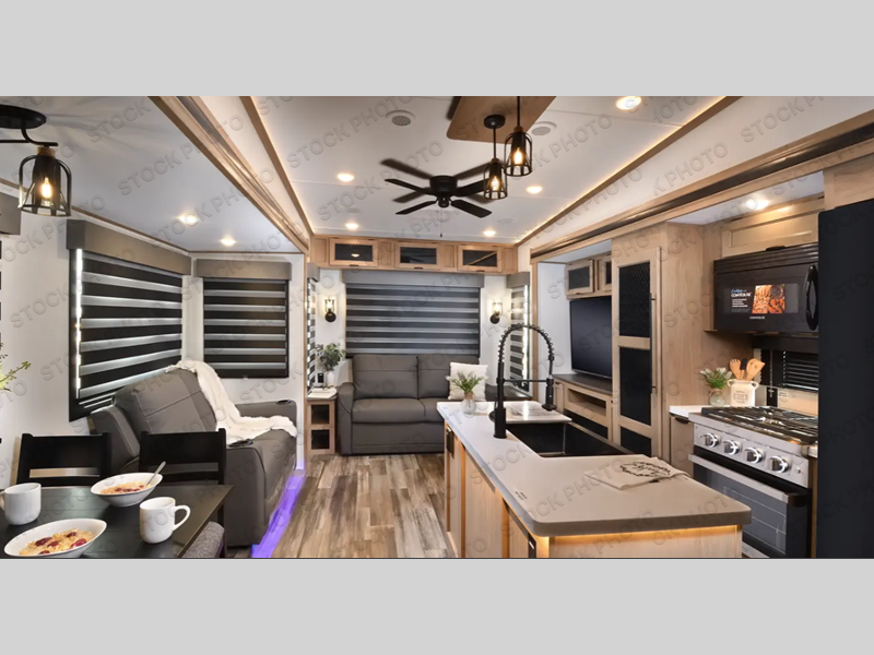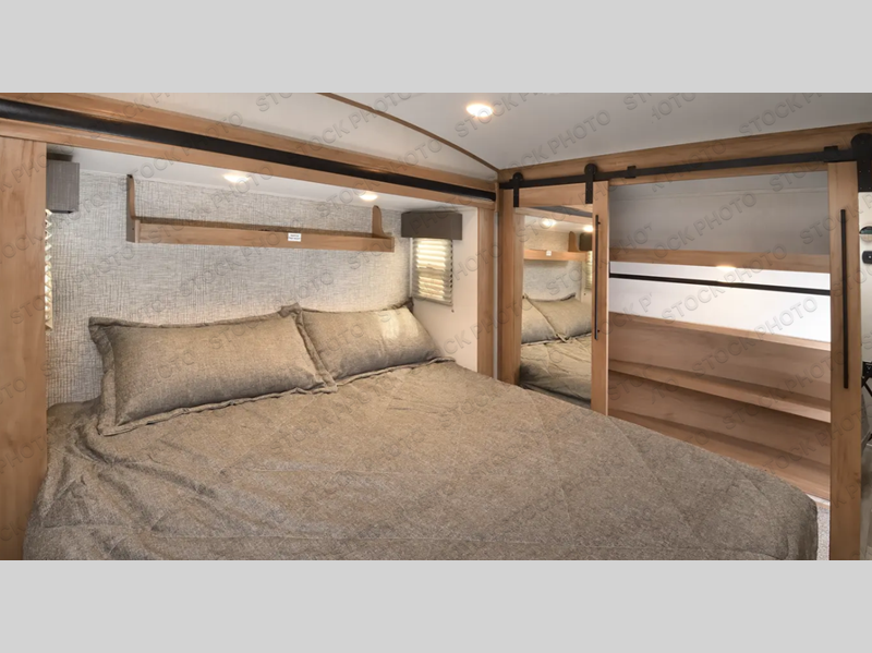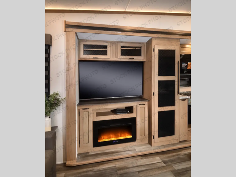There is much to love in this fifth wheel! Starting with the second bedroom which has a slide that houses a flip-up bunk above a tri-fold sofa across from a desk with drawers, a drop zone, and a wardrobe, plus above all of that is a storage/bunk loft. The rear living area includes a tri-fold sofa, a TV with a fireplace below, and theater seating for two making this space another area at night for guests. In the morning, you can prepare breakfast on the kitchen island and three burner range, then dine together at the free-standing table with bench seating and two chairs. There is plenty of storage space here, including a pantry and overhead cabinets. The full bath will allow you to stay clean throughout your trip, and you'll feel right at home in the front private bedroom with a king bed and the front wardrobe is even prepped to add an optional washer and dryer. This model also includes an outside kitchen to make meals, plus pass-thru storage for all your gear!