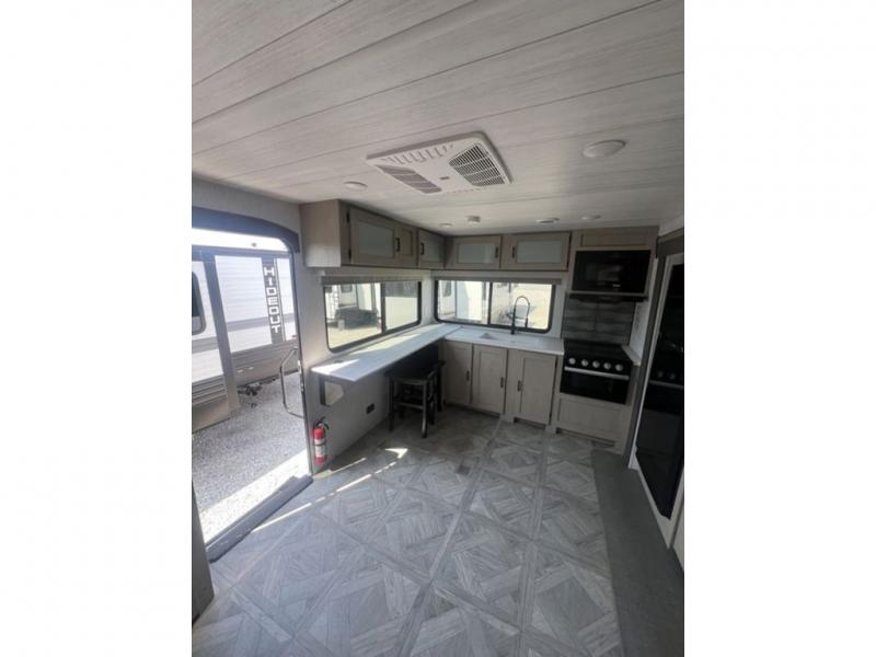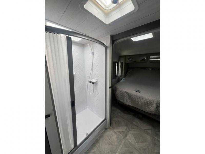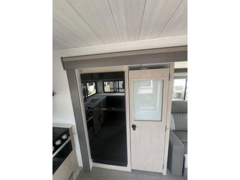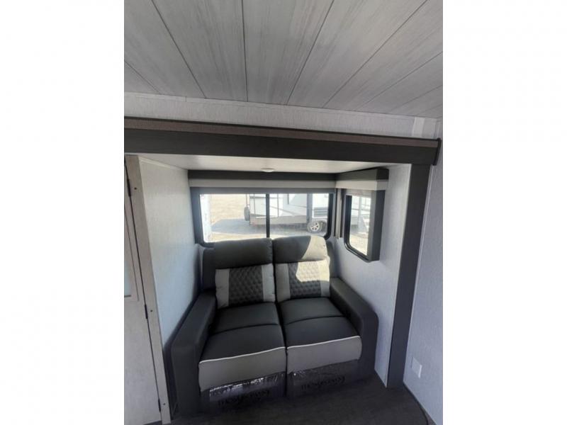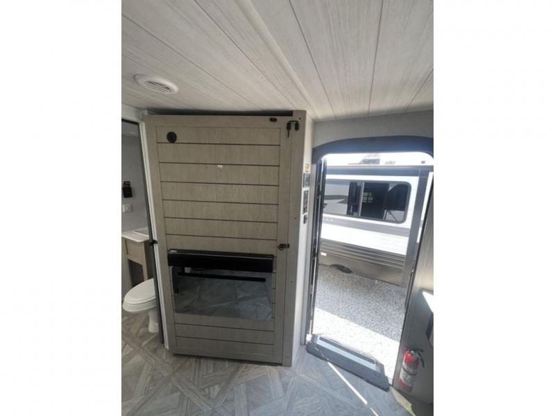 You're going to love cooking in the rear kitchen of this travel trailer! It has everything you need to prepare delicious home cooked meals including a large pantry and oversized fridge, plus there are two bar stools to sit on while you enjoy them. The theater seating is conveniently across from the swiveling entertainment center which has a fireplace and hidden shelves behind it for your games and movies. As you walk-through the bathroom, you will notice a walk-in shower to the left and a toilet and sink to the right. It leads directly into the front private bedroom which has a Versa-Tilt custom king bed to lay your head on at night and wardrobes/nightstands on either side for your items!
