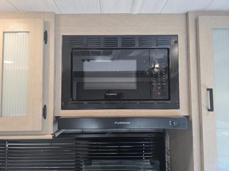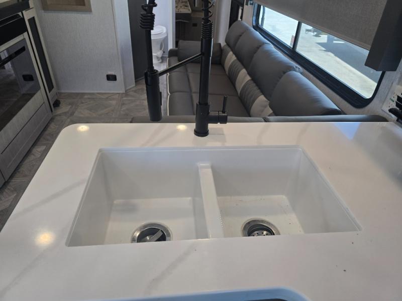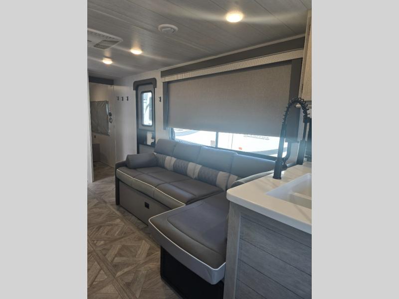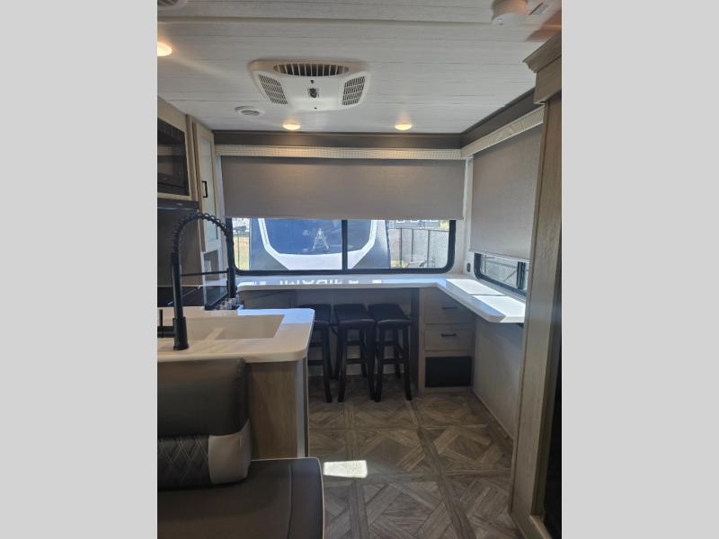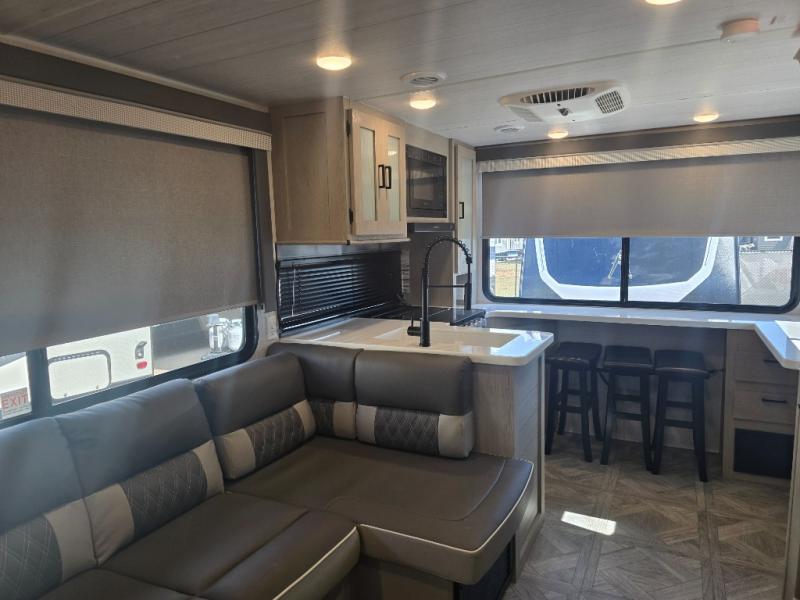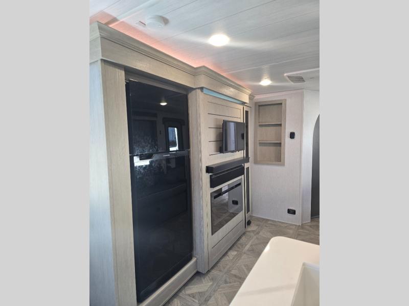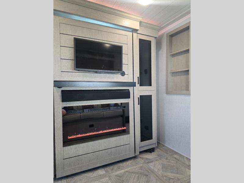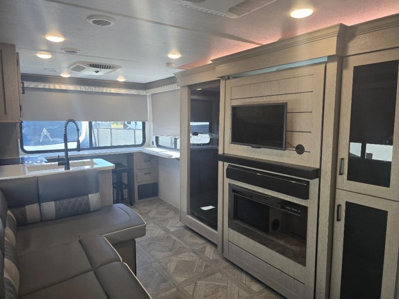 Camping trips in this spacious travel trailer are sure to leave memories. You will love the amount of counter space you have in the rear kitchen since there is wrap-around counter space with a flip-up table and two stools. The main living area will be a favorite place to visit, especially with its L-shaped sofa plus swiveling entertainment center with a fireplace. Behind the TV, you'll find a hinged mattress with a mattress below, storage cubbies, and a desk, making this hidden bunkhouse perfect for guests or an office. A spacious full bath with a radius shower will let you clean up each day, and a Versa-Tilt custom king bed in the front bedroom is sure to bring a great night's rest. There are also dual bedroom wardrobes to keep your clothes wrinkle-free!