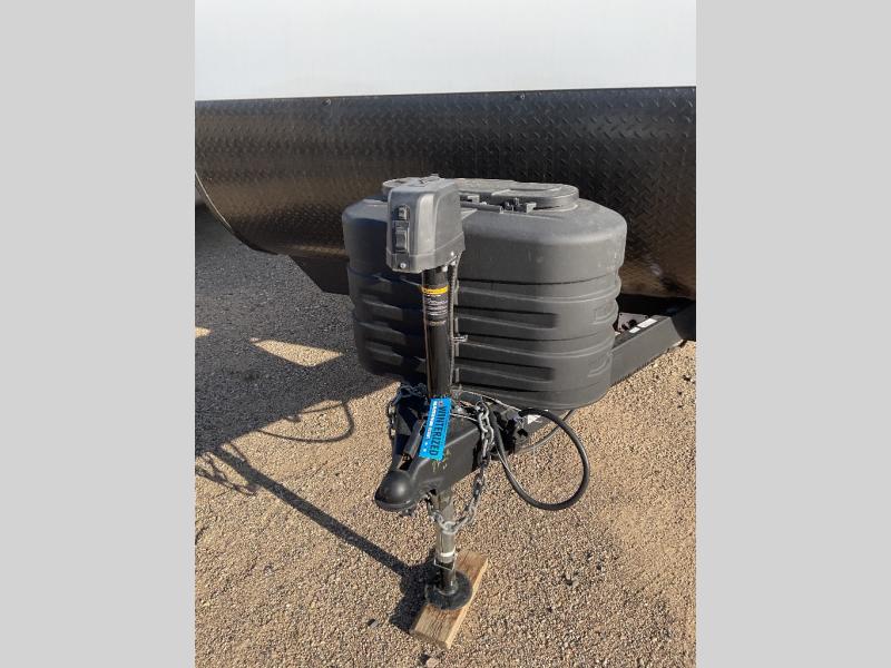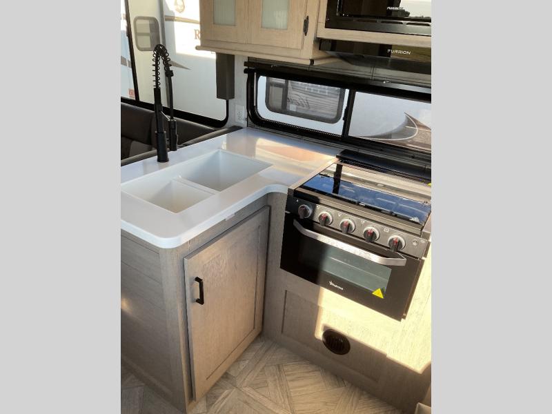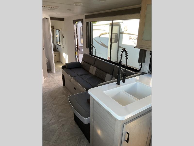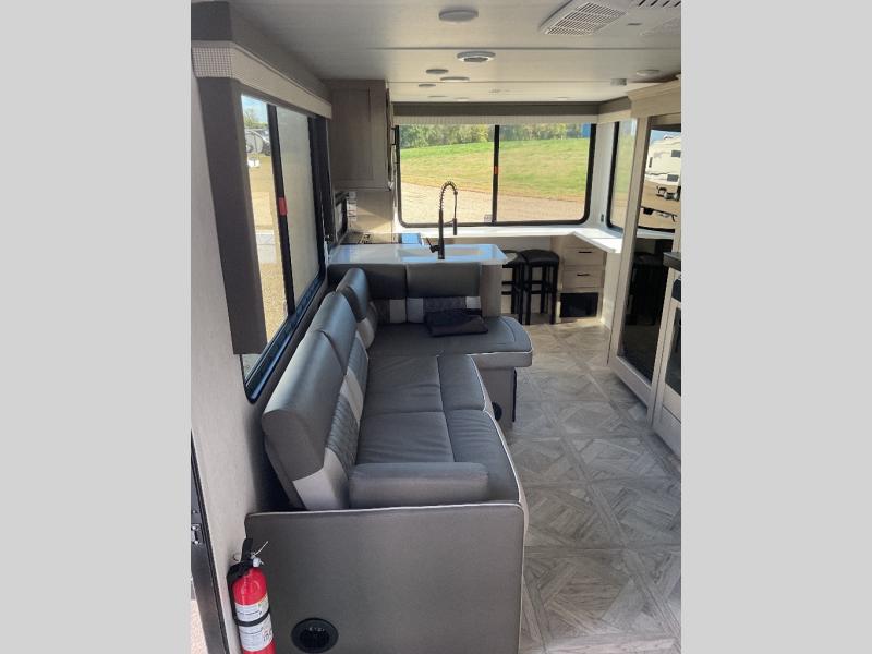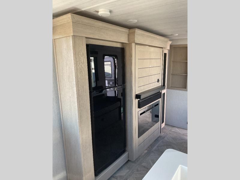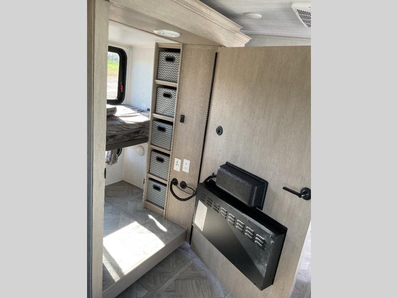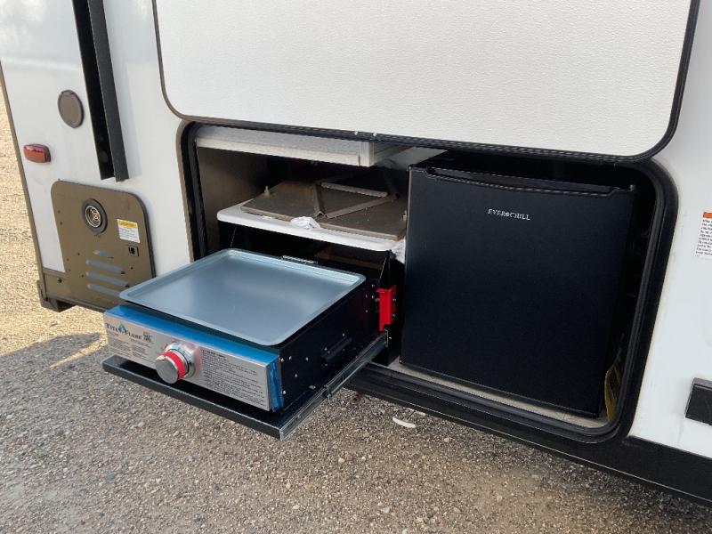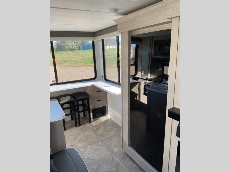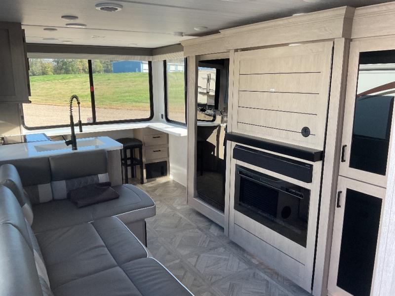 Camping trips in this spacious travel trailer are sure to leave memories. You will love the amount of counter space you have in the rear kitchen since there is wrap-around counter space with a flip-up table and two stools. The main living area will be a favorite place to visit, especially with its L-shaped sofa plus swiveling entertainment center with a fireplace. Behind the TV, you'll find a hinged mattress with a mattress below, storage cubbies, and a desk, making this hidden bunkhouse perfect for guests or an office. A spacious full bath with a radius shower will let you clean up each day, and a Versa-Tilt custom king bed in the front bedroom is sure to bring a great night's rest. There are also dual bedroom wardrobes to keep your clothes wrinkle-free!