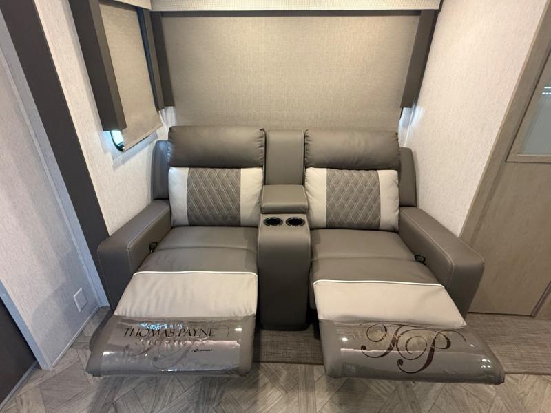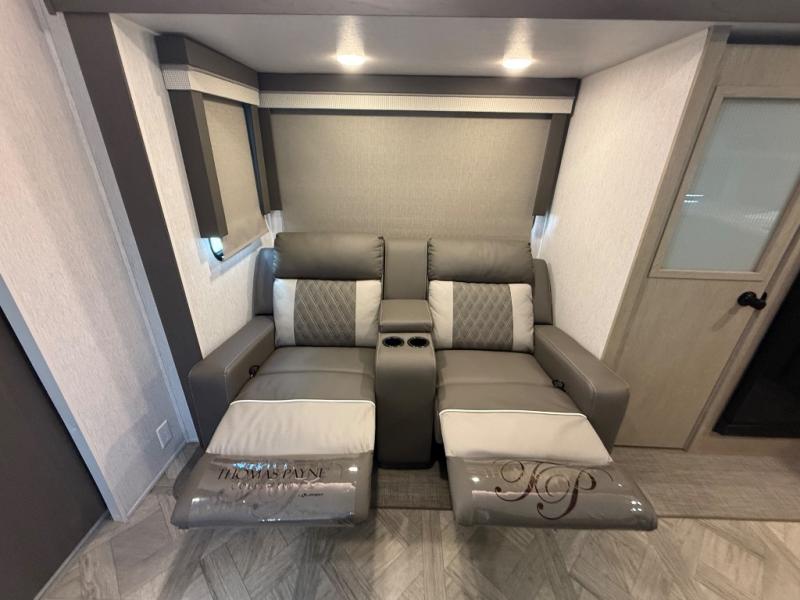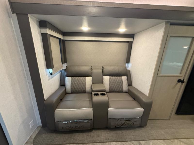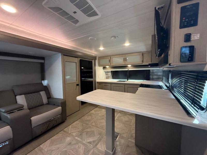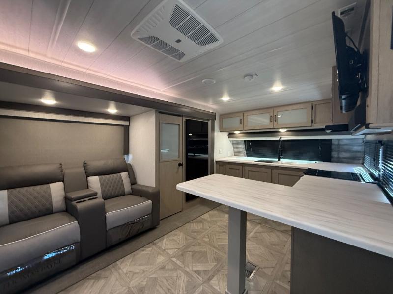 You will fall in love with this travel trailer as soon as you walk through the door! One of the dual entry doors leads directly into the front kitchen and living area which has theater seating, three bar stools to enjoy meals at the countertop, plus a bench right at the entrance to make putting your shoes on easier. Inside the master suite there is a Versa-Tilt custom king bed slide across from a dresser with TV prep above, a washer and dryer prep option, and access to the full rear bathroom. You will find a walk-in shower to freshen up in each morning, recessed storage, and the second entrance/exit door to the unit. You even have an exterior camp kitchen to prepare meals outdoors, a 20' awning to protect you rain or shine, and a Versa garage for your items!