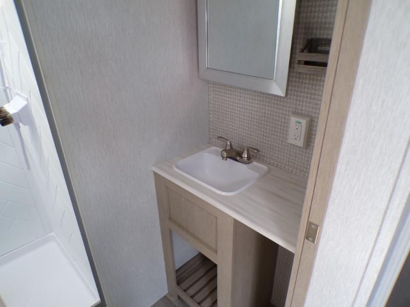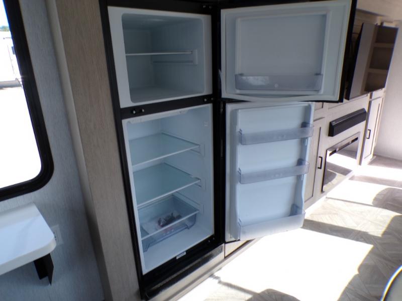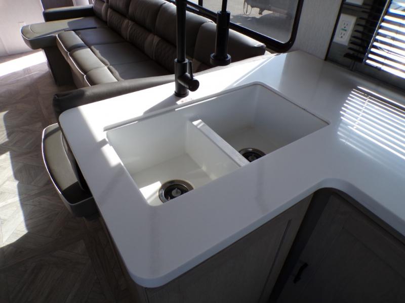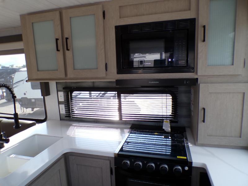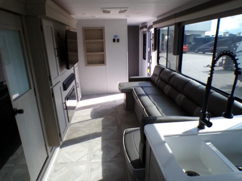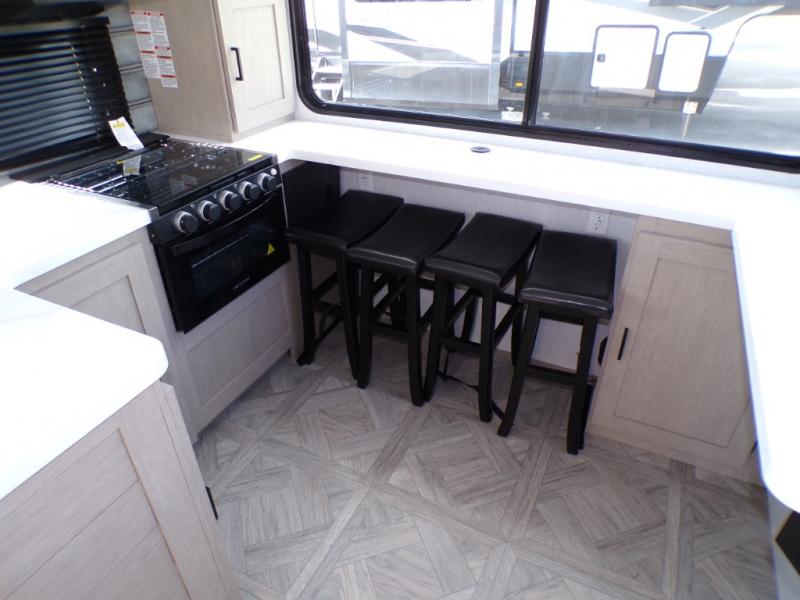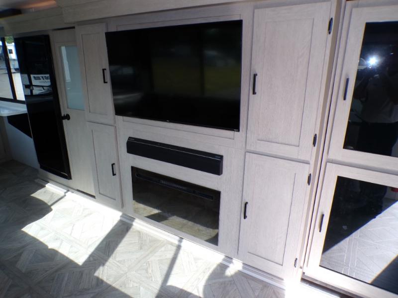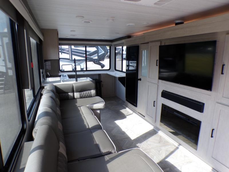 Your family of four will enjoy this Salem View bunk model featuring 105 square feet of window space for unbelievable views of your surroundings. A Versa Slide features a refrigerator, pantry, and entertainment center with a door leading to a bunk space including a set of 30" x 70" bunks with top flip-up bunk, storage cubbies for your things, and a desk with bar stool for any office work that you may need to do while you travel. All is neatly tucked away within the slide behind a shiplap featured entertainment wall with fireplace opposite the sectional sofa which is great for relaxing and entertaining family and friends indoors. The rear kitchen area offers 18 linear feet of countertop space with four bar stools, plus a three burner range and double sink. Your refrigerator and pantry will hold all of your perishables and dry goods, and those are nearby within the Versa slide. Up front, a private bedroom with Versa-Tilt custom king bed which provides 14-1/2" of additional walking around space, plus you will find a wardrobe that has been prepped for a washer and dryer if you choose to add, as well as dual nightstands beneath wardrobes on either side of the bed. A large pass-through storage compartment offers plenty of space for your outdoor gear, and if you enjoy outdoor cooking, you might want to add the outside kitchen option as well.