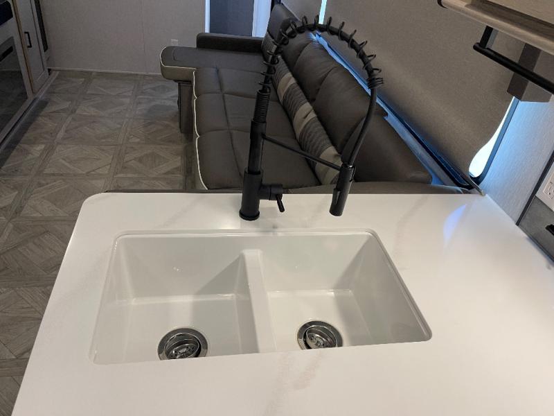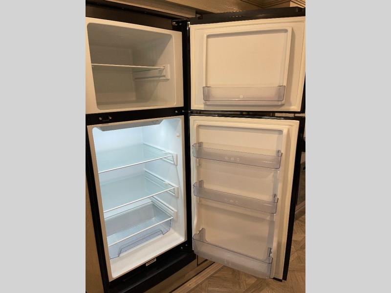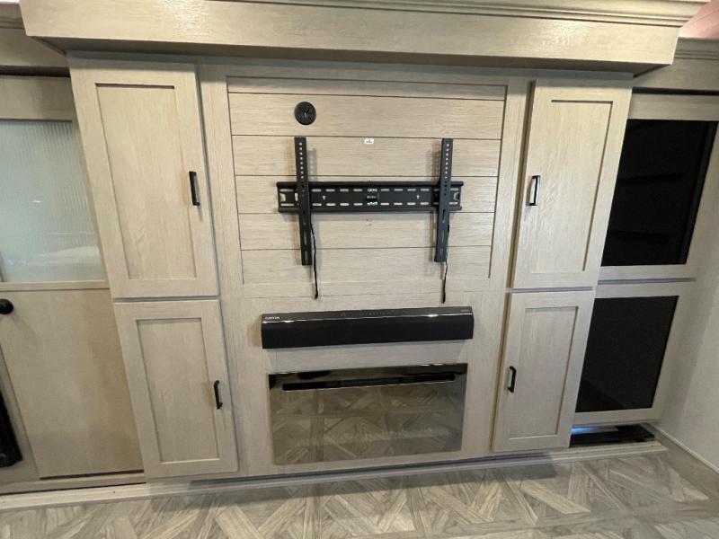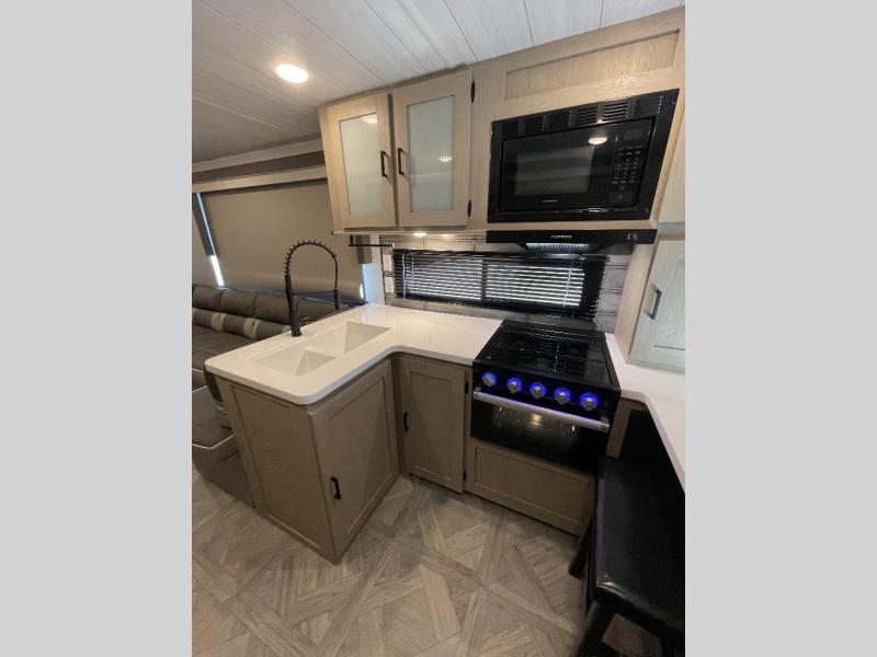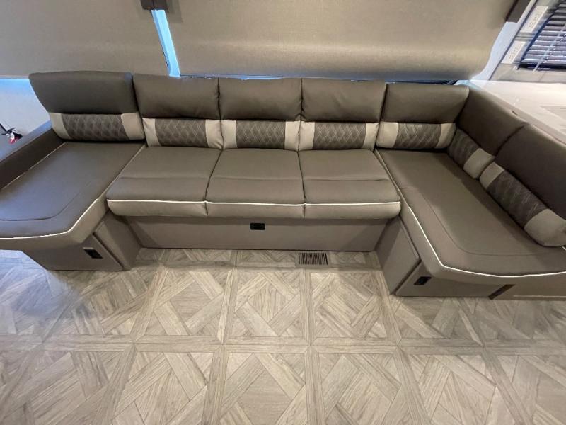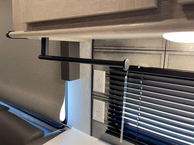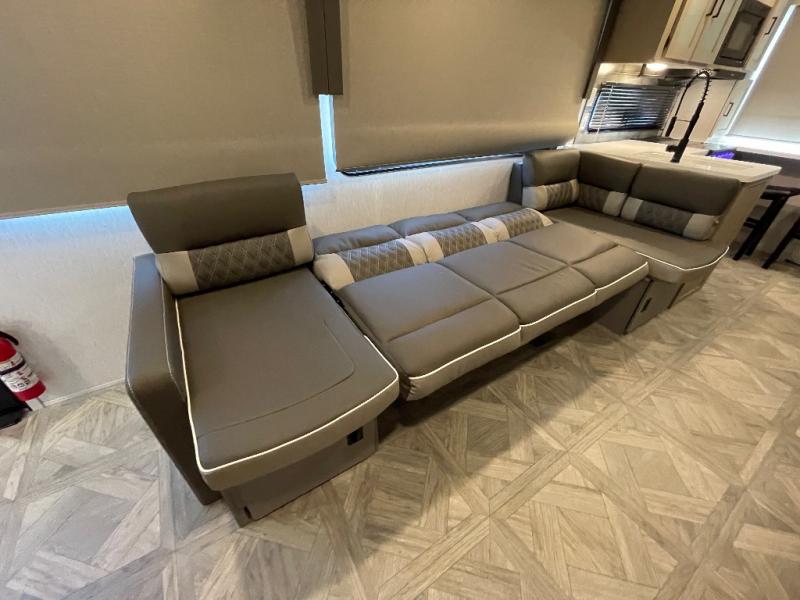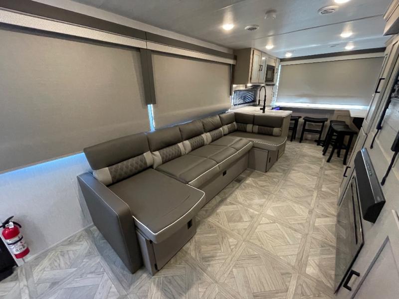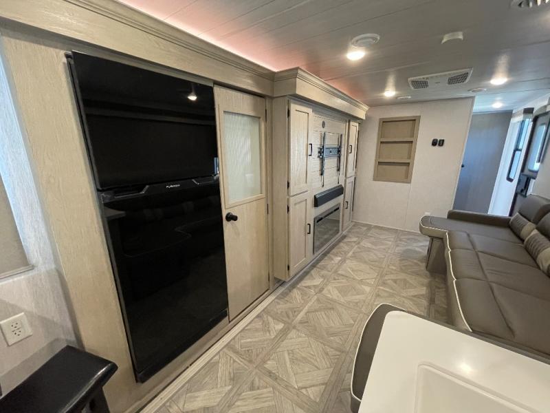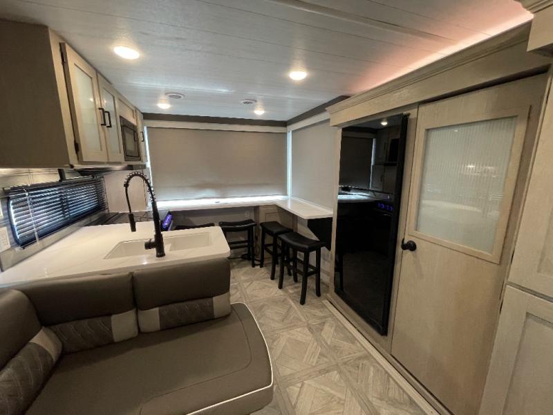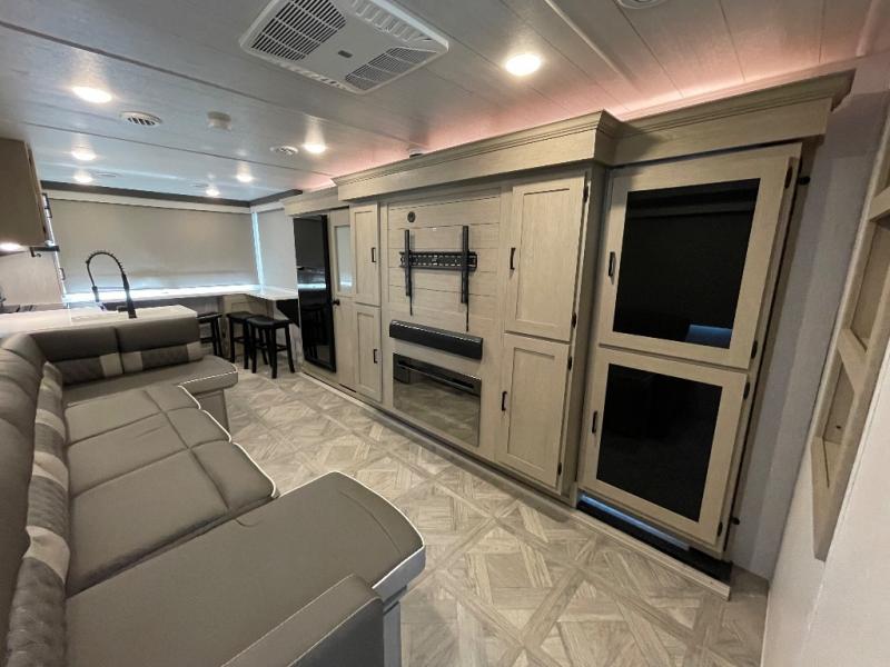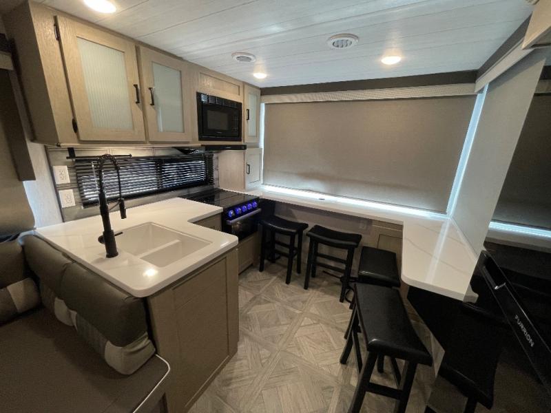 Your family of four will enjoy this Salem View bunk model featuring 105 square feet of window space for unbelievable views of your surroundings. A Versa Slide features a refrigerator, pantry, and entertainment center with a door leading to a bunk space including a set of 30" x 70" bunks with top flip-up bunk, storage cubbies for your things, and a desk with bar stool for any office work that you may need to do while you travel. All is neatly tucked away within the slide behind a shiplap featured entertainment wall with fireplace opposite the sectional sofa which is great for relaxing and entertaining family and friends indoors. The rear kitchen area offers 18 linear feet of countertop space with four bar stools, plus a three burner range and double sink. Your refrigerator and pantry will hold all of your perishables and dry goods, and those are nearby within the Versa slide. Up front, a private bedroom with Versa-Tilt custom king bed which provides 14-1/2" of additional walking around space, plus you will find a wardrobe that has been prepped for a washer and dryer if you choose to add, as well as dual nightstands beneath wardrobes on either side of the bed. A large pass-through storage compartment offers plenty of space for your outdoor gear, and if you enjoy outdoor cooking, you might want to add the outside kitchen option as well.