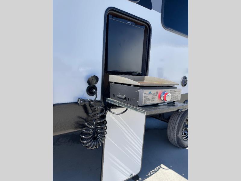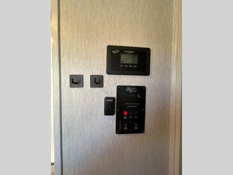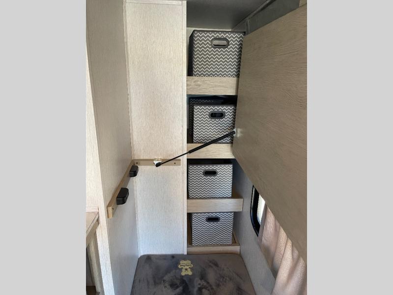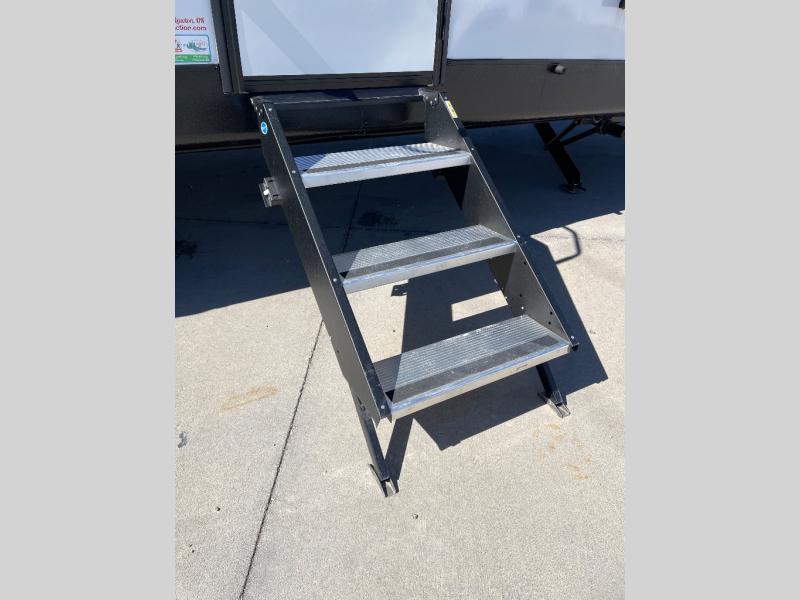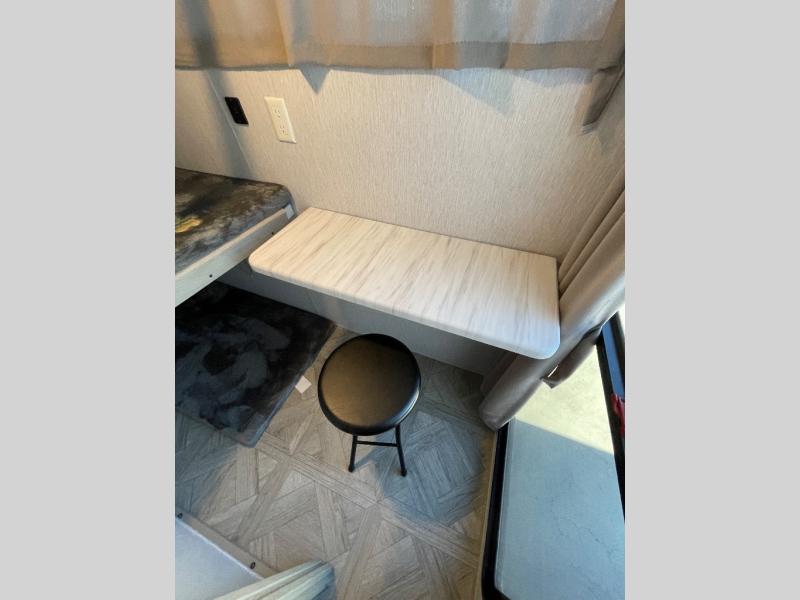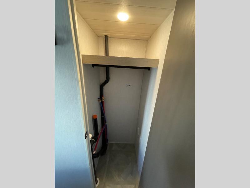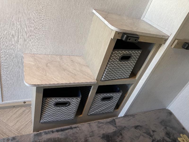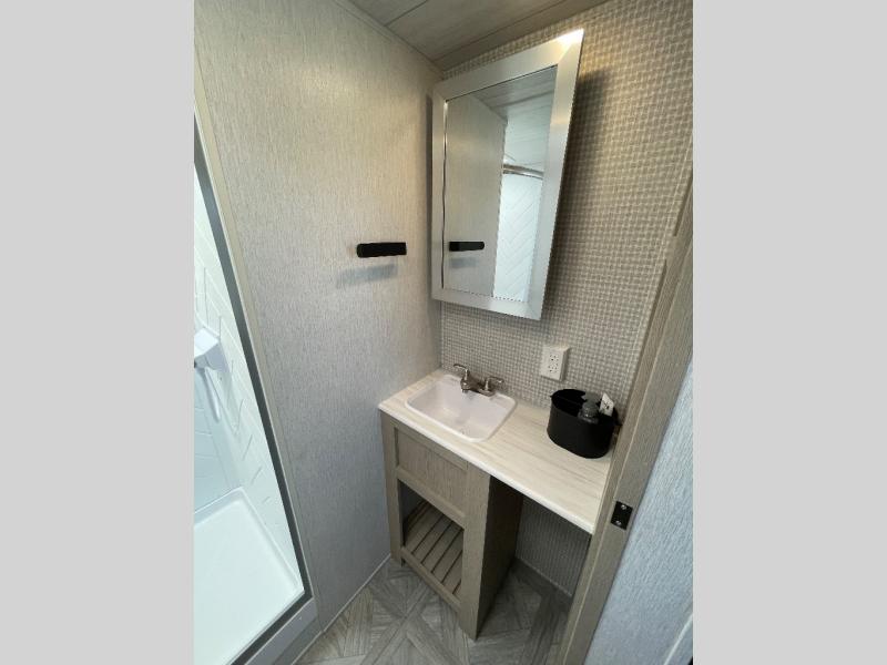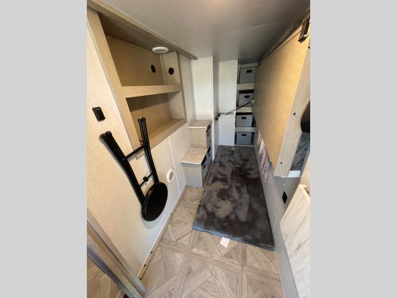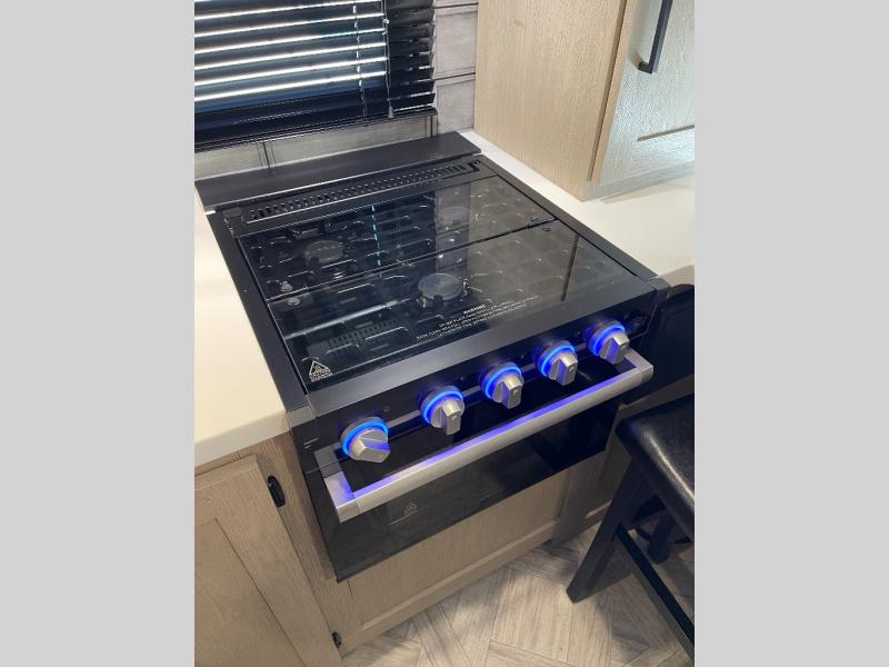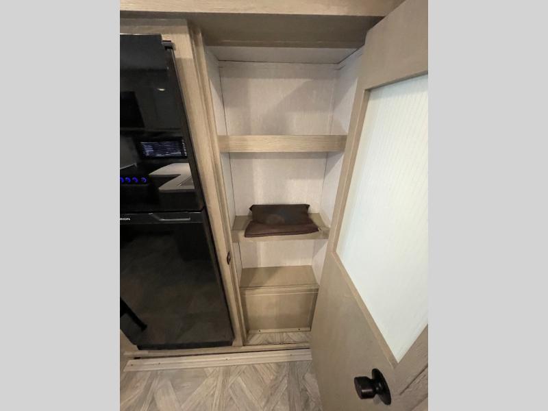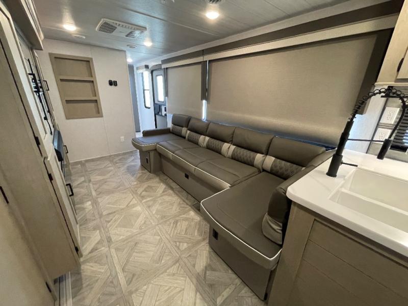 Your family of four will enjoy this Salem View bunk model featuring 105 square feet of window space for unbelievable views of your surroundings. A Versa Slide features a refrigerator, pantry, and entertainment center with a door leading to a bunk space including a set of 30" x 70" bunks with top flip-up bunk, storage cubbies for your things, and a desk with bar stool for any office work that you may need to do while you travel. All is neatly tucked away within the slide behind a shiplap featured entertainment wall with fireplace opposite the sectional sofa which is great for relaxing and entertaining family and friends indoors. The rear kitchen area offers 18 linear feet of countertop space with four bar stools, plus a three burner range and double sink. Your refrigerator and pantry will hold all of your perishables and dry goods, and those are nearby within the Versa slide. Up front, a private bedroom with Versa-Tilt custom king bed which provides 14-1/2" of additional walking around space, plus you will find a wardrobe that has been prepped for a washer and dryer if you choose to add, as well as dual nightstands beneath wardrobes on either side of the bed. A large pass-through storage compartment offers plenty of space for your outdoor gear, and if you enjoy outdoor cooking, you might want to add the outside kitchen option as well.