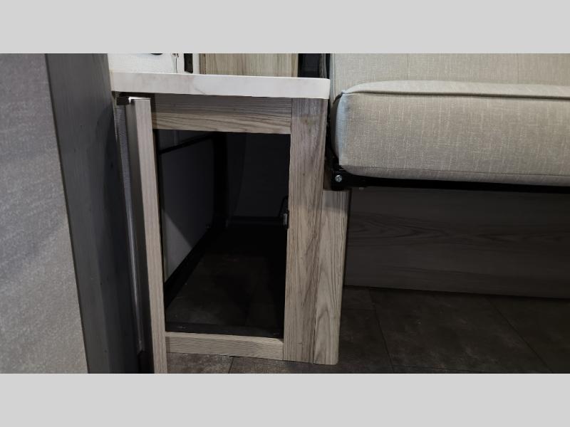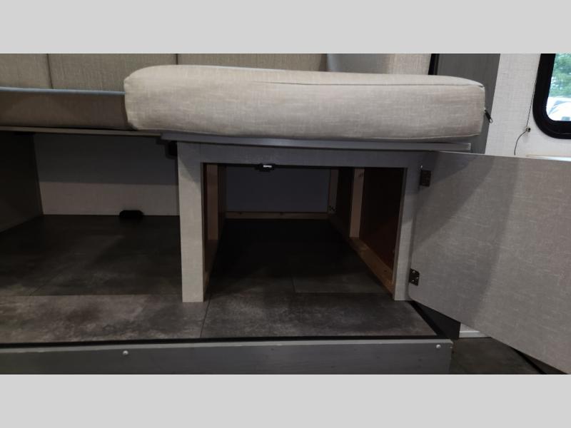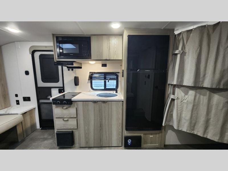 Includes a 2-burner cooktop, microwave, oversized 12V refrigerator, stainless steel sink, seamless countertops, and plenty of storage space for food and cookware.