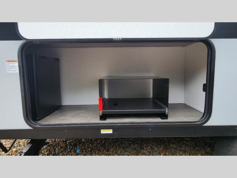 Grill out and chill out with the exterior LP griddle and fridge, plus a power awning with LED lights—your outdoor living space is ready for any campground or tailgate.