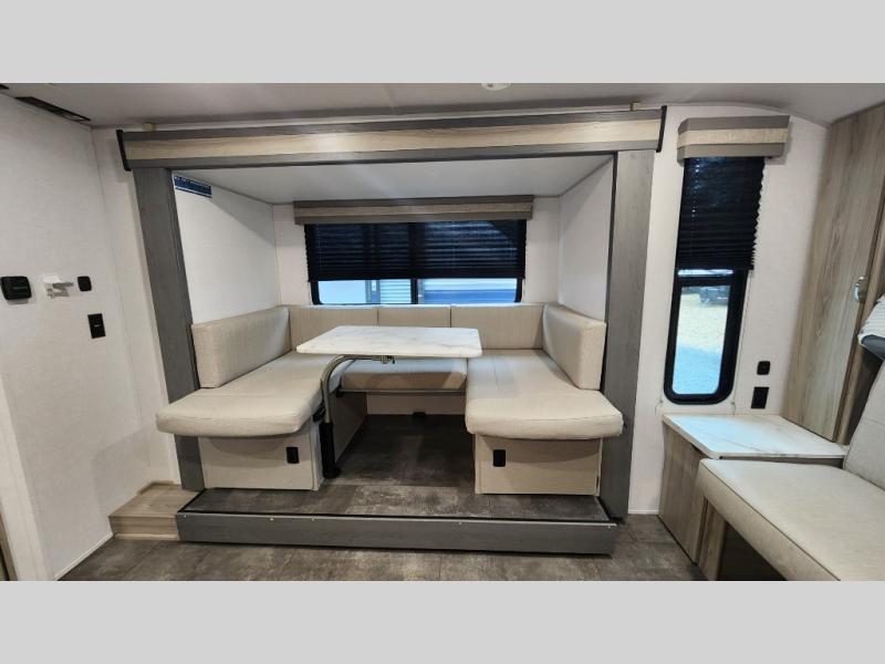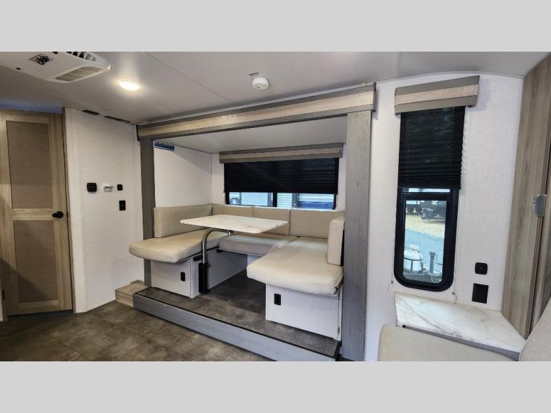 This smart layout comfortably sleeps up to 7 people with double-over-double rear bunks, a versatile murphy queen bed, and a convertible U-shaped dinette. Everyone has a place to rest after a day of adventure.