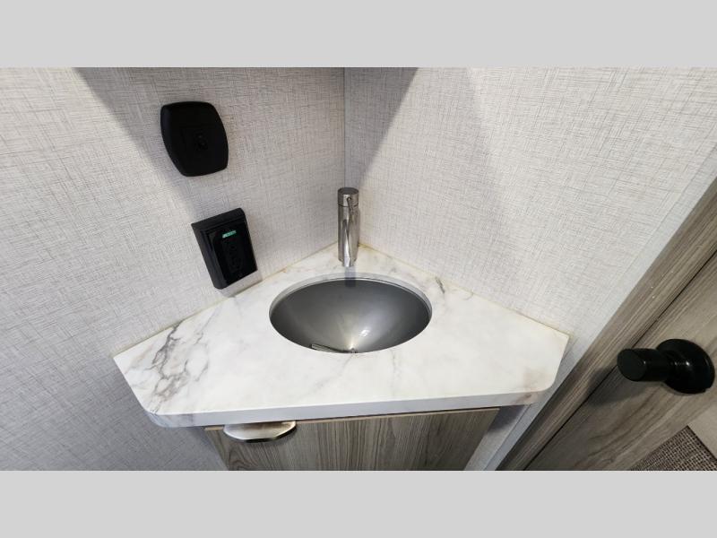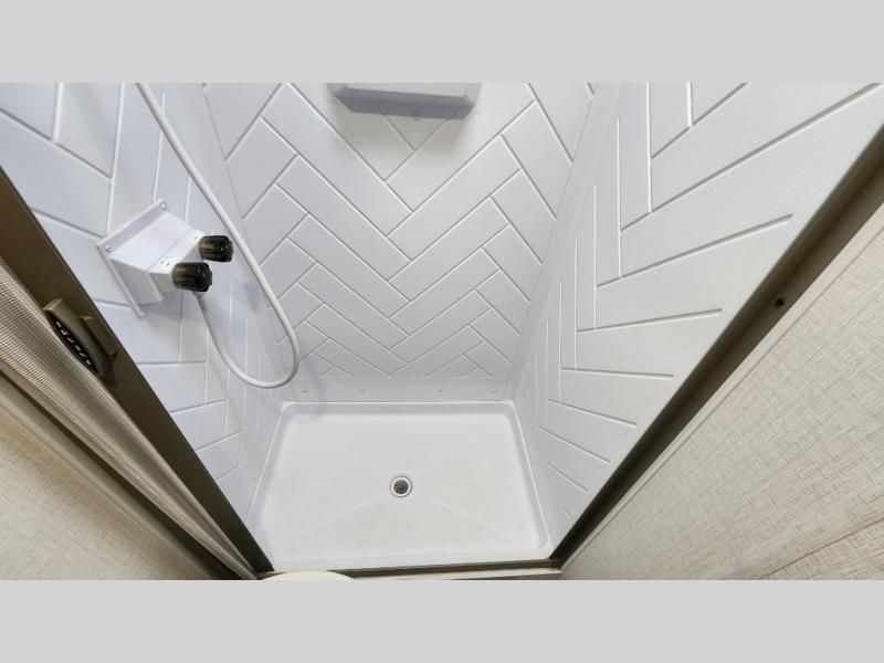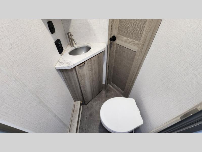 The spacious rear corner bath includes a shower with skylight, foot-flush toilet, and high-speed vent fan—rare for trailers in this weight class.