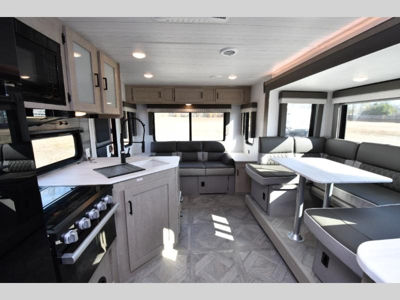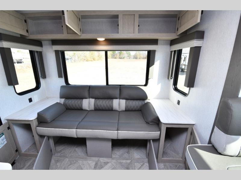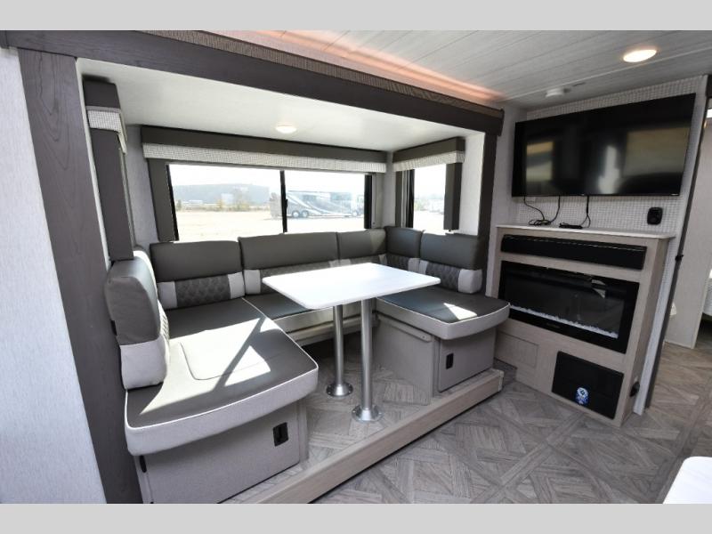 Enjoy cozy nights by the fireplace, panoramic dining views, and a 16' power awning with exterior speakers for the ultimate outdoor living.