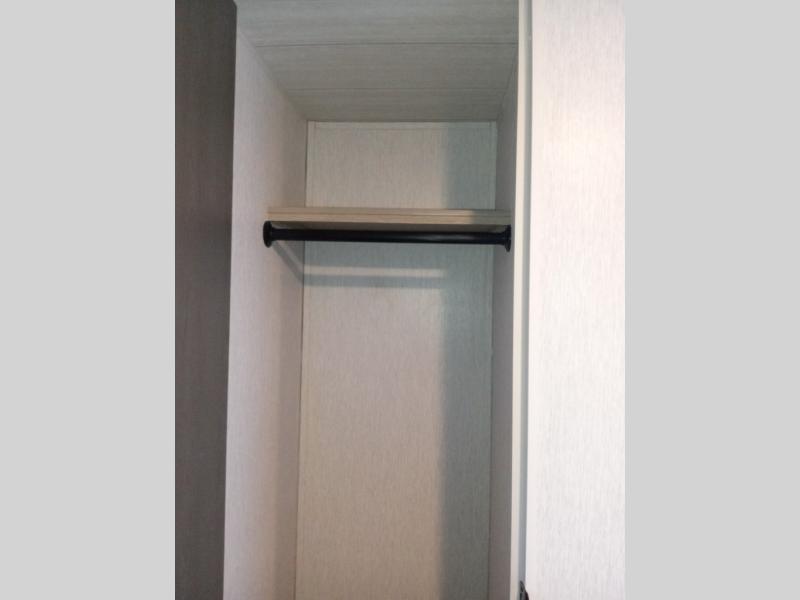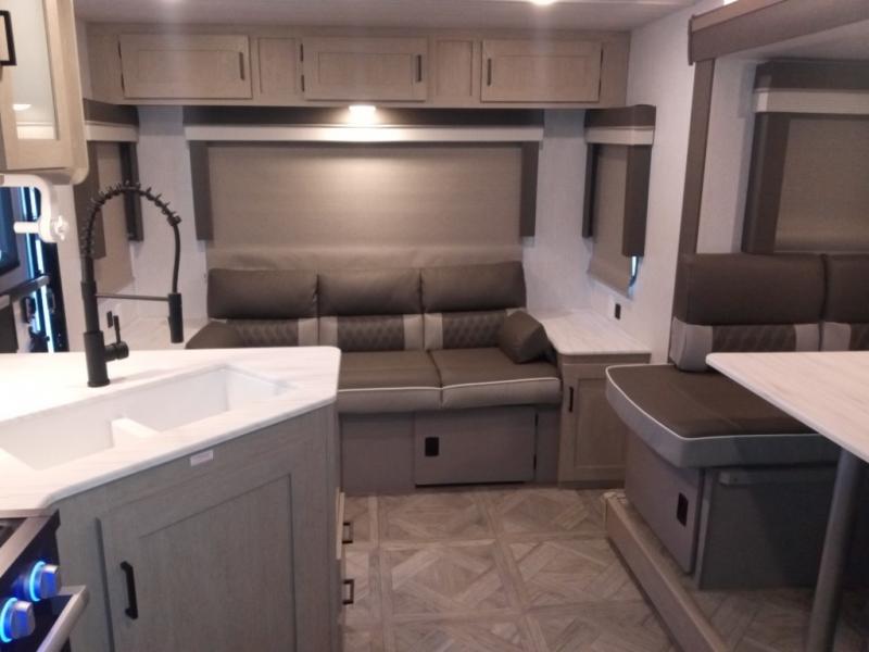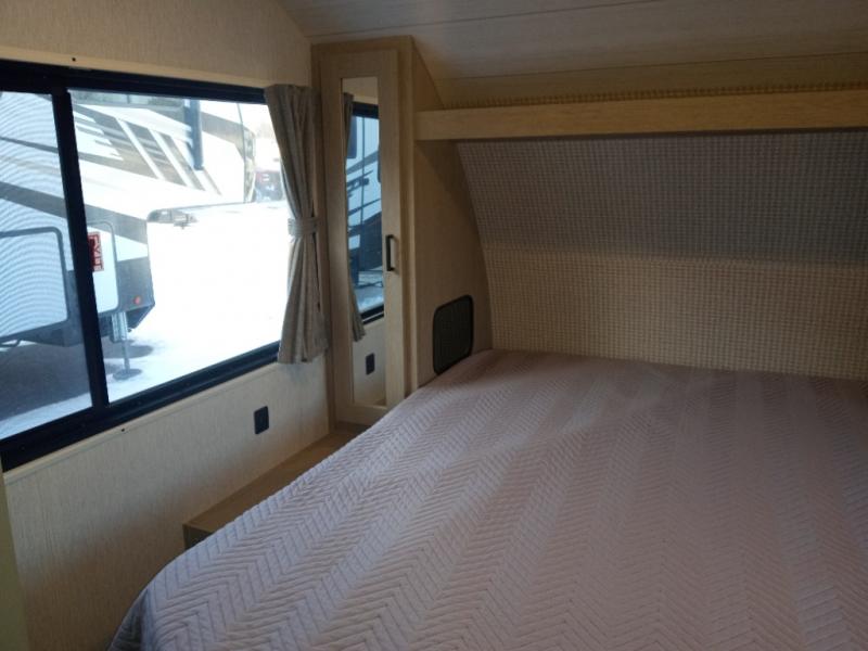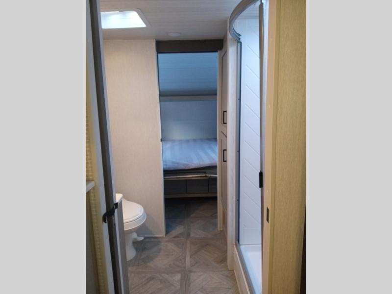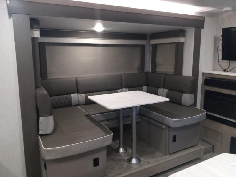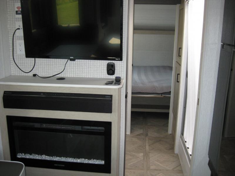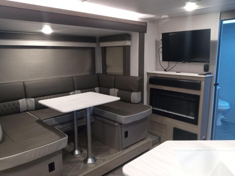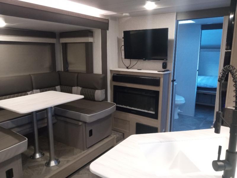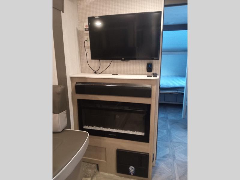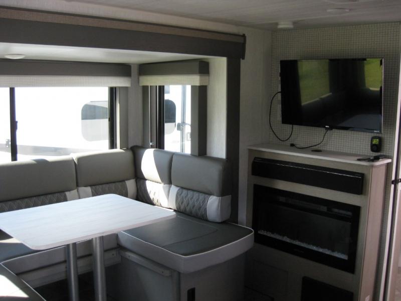 This travel trailer is packed full of features, but is still lightweight coming in at just over 5,000 lbs.! You will feel right at home in the front master bedroom with a custom king bed with Versa Tilt that has closets on either side, CPAP storage, and a walk-in closet to keep your clothes looking their best. The walk-through bathroom has a walk-in shower with fiberglass surround and a skylight above for added natural lighting as you get ready. The U-shaped dinette slide has a panoramic window for you to enjoy your beautiful scenery as you eat dinner, and there is a fireplace at the entertainment center for a relaxing evening indoors. There is a pass-through storage area to store your outdoor camping gear, and a 16' power awning and exterior speakers to crank up the tunes!
