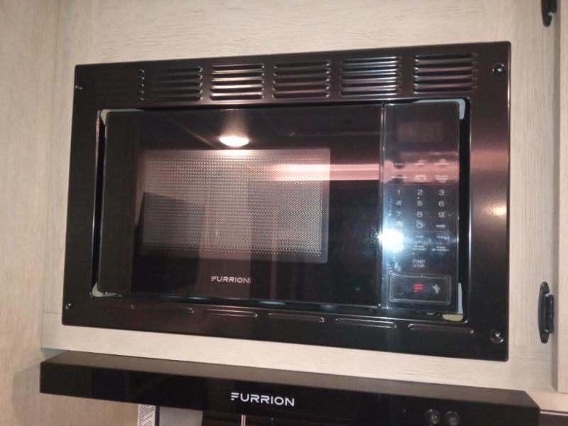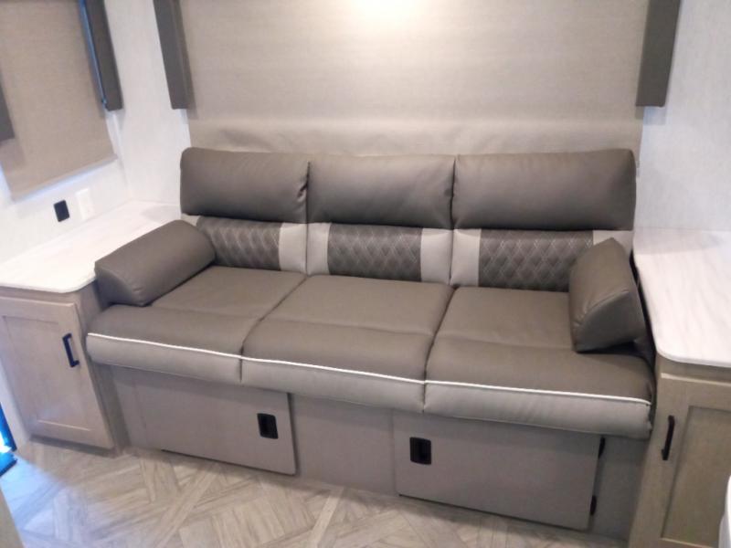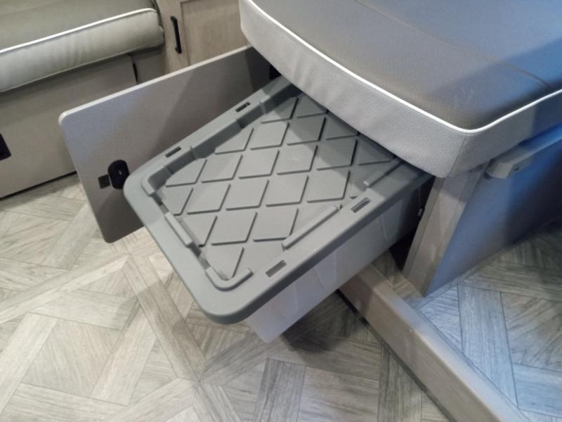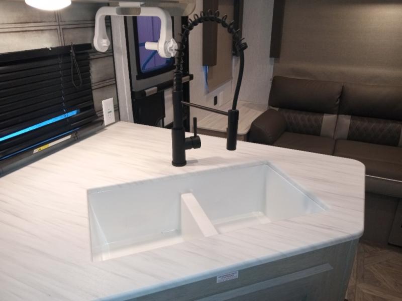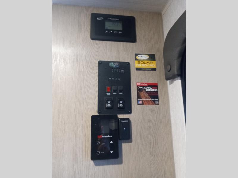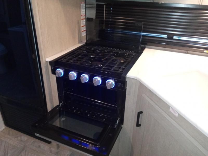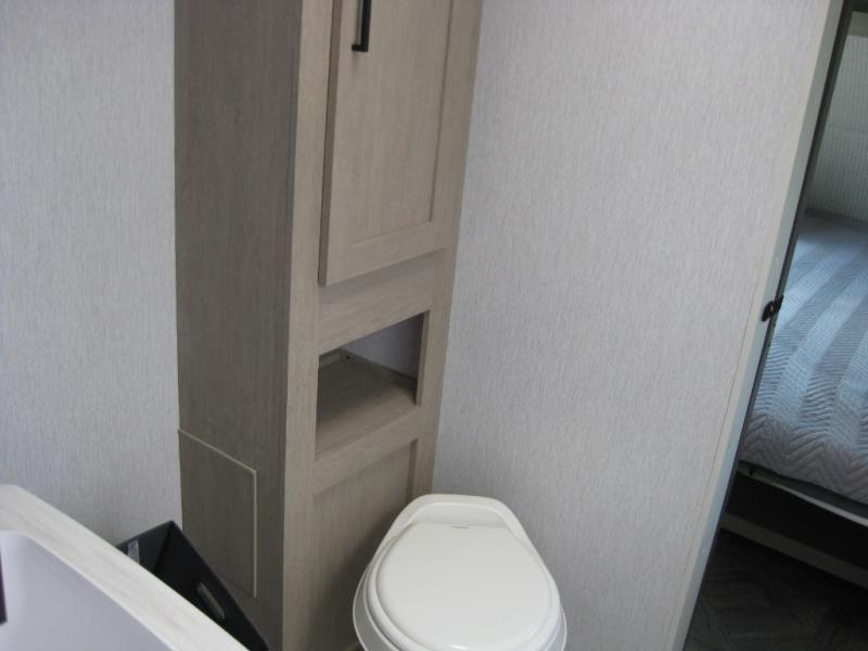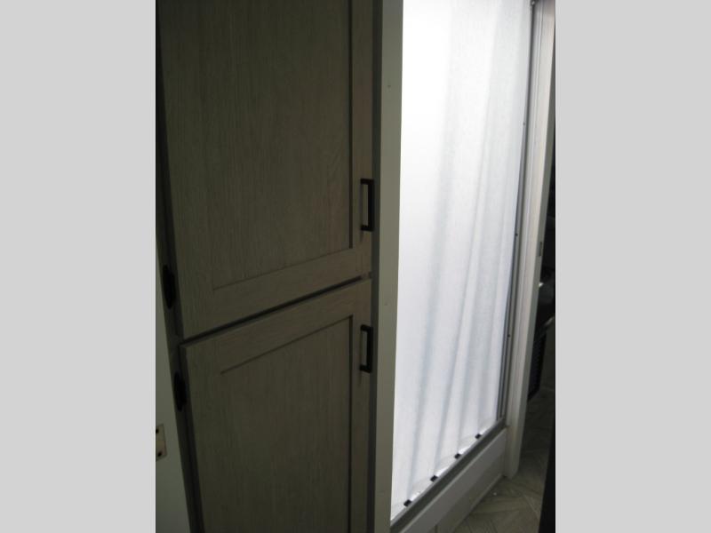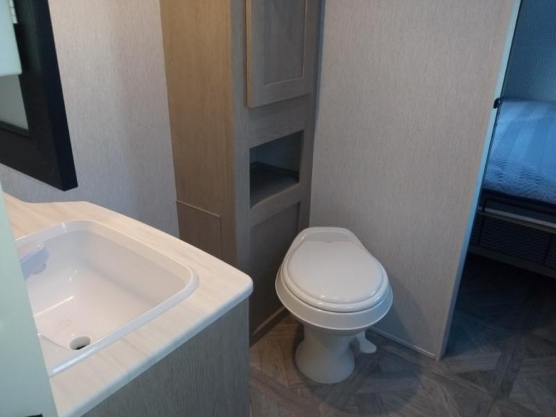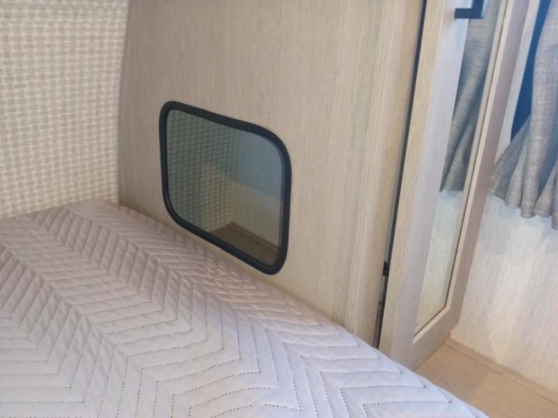This travel trailer is packed full of features, but is still lightweight coming in at just over 5,000 lbs.! You will feel right at home in the front master bedroom with a custom king bed with Versa Tilt that has closets on either side, CPAP storage, and a walk-in closet to keep your clothes looking their best. The walk-through bathroom has a walk-in shower with fiberglass surround and a skylight above for added natural lighting as you get ready. The U-shaped dinette slide has a panoramic window for you to enjoy your beautiful scenery as you eat dinner, and there is a fireplace at the entertainment center for a relaxing evening indoors. There is a pass-through storage area to store your outdoor camping gear, and a 16' power awning and exterior speakers to crank up the tunes!