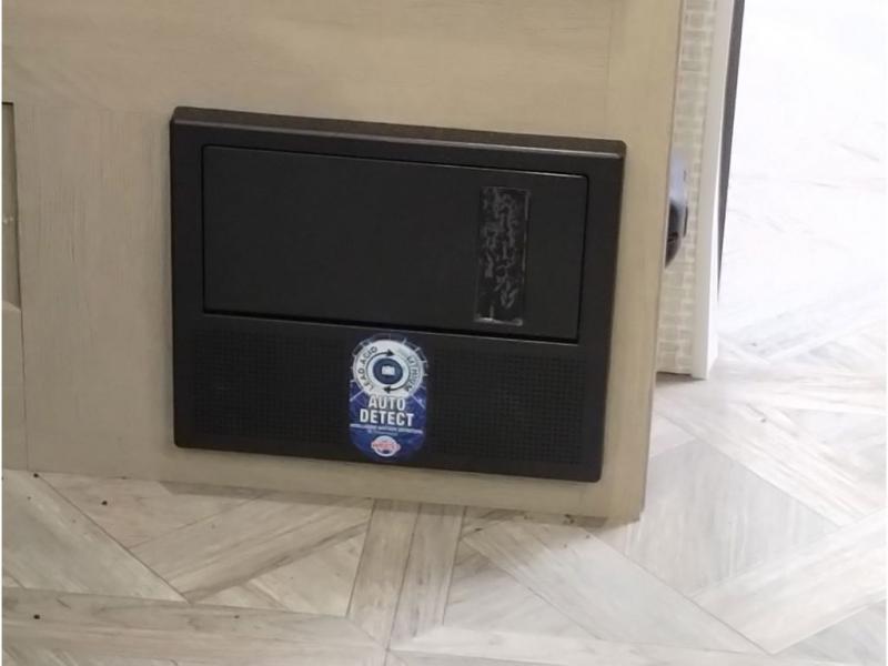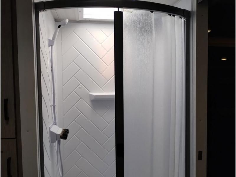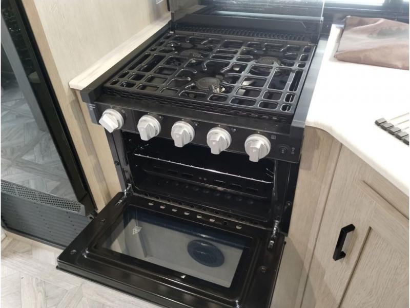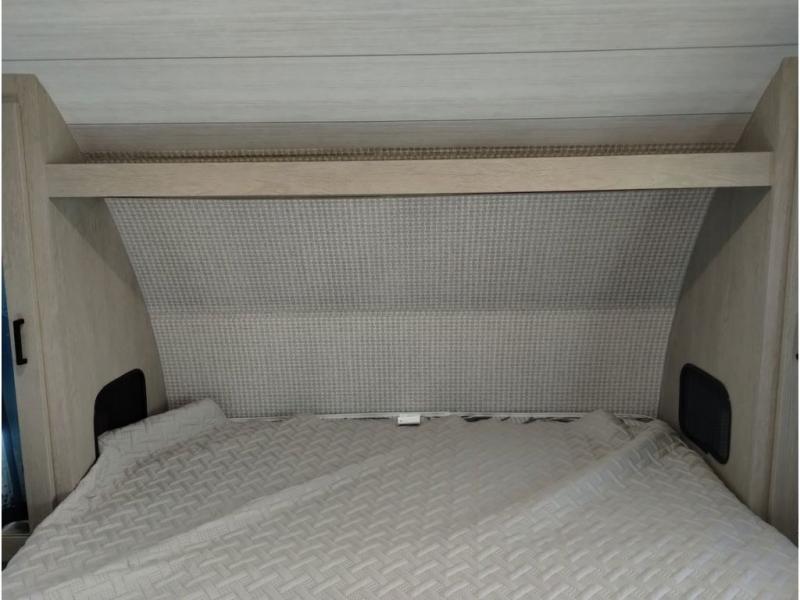 This travel trailer is packed full of features, but is still lightweight coming in at just over 5,000 lbs.! You will feel right at home in the front master bedroom with a custom king bed with Versa Tilt that has closets on either side, CPAP storage, and a walk-in closet to keep your clothes looking their best. The walk-through bathroom has a walk-in shower with fiberglass surround and a skylight above for added natural lighting as you get ready. The U-shaped dinette slide has a panoramic window for you to enjoy your beautiful scenery as you eat dinner, and there is a fireplace at the entertainment center for a relaxing evening indoors. There is a pass-through storage area to store your outdoor camping gear, and a 16' power awning and exterior speakers to crank up the tunes!