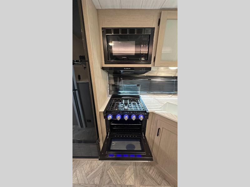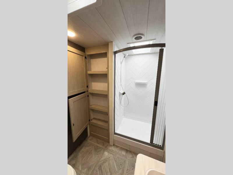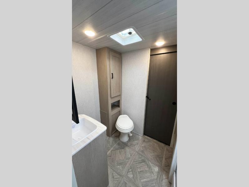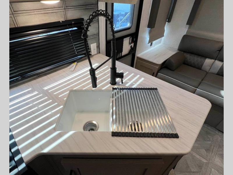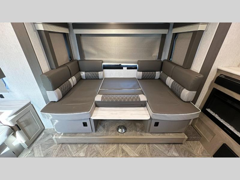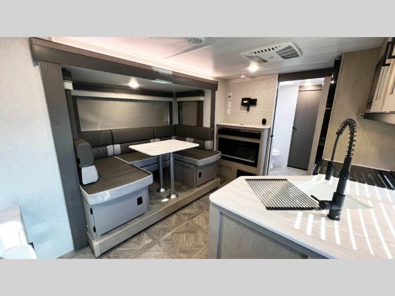 This travel trailer is packed full of features, but is still lightweight coming in at just over 5,000 lbs.! You will feel right at home in the front master bedroom with a custom king bed with Versa Tilt that has closets on either side, CPAP storage, and a walk-in closet to keep your clothes looking their best. The walk-through bathroom has a walk-in shower with fiberglass surround and a skylight above for added natural lighting as you get ready. The U-shaped dinette slide has a panoramic window for you to enjoy your beautiful scenery as you eat dinner, and there is a fireplace at the entertainment center for a relaxing evening indoors. There is a pass-through storage area to store your outdoor camping gear, and a 16' power awning and exterior speakers to crank up the tunes!