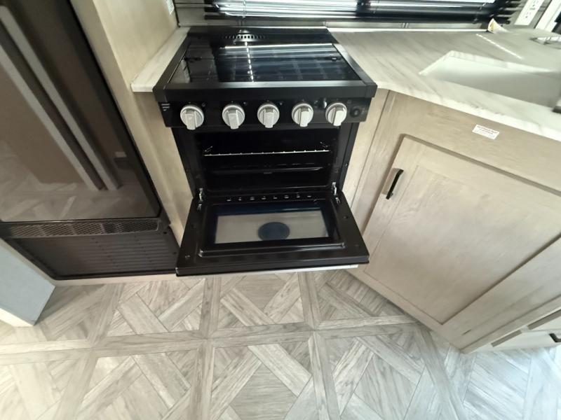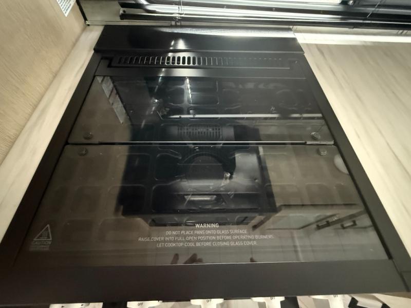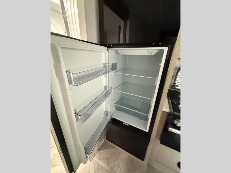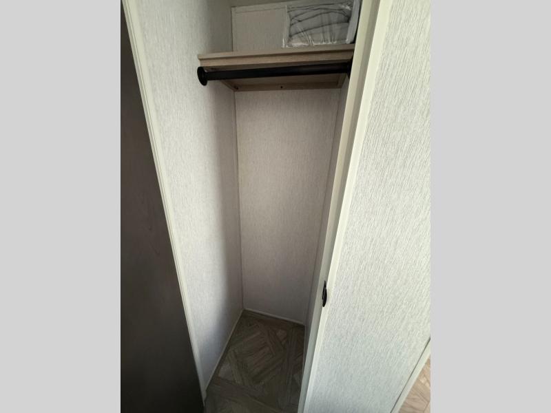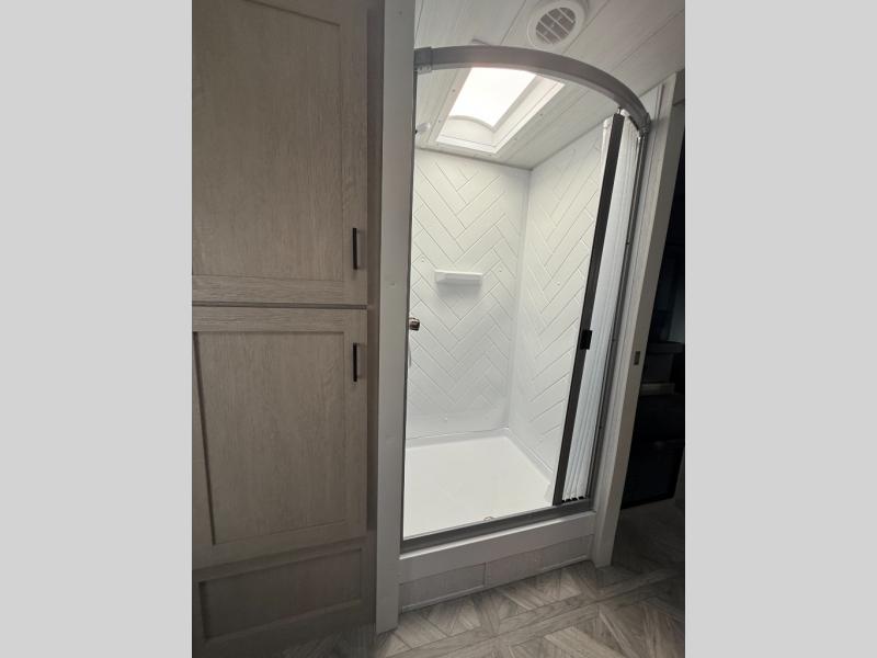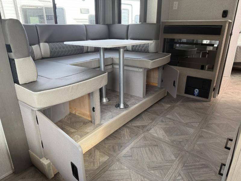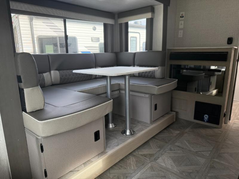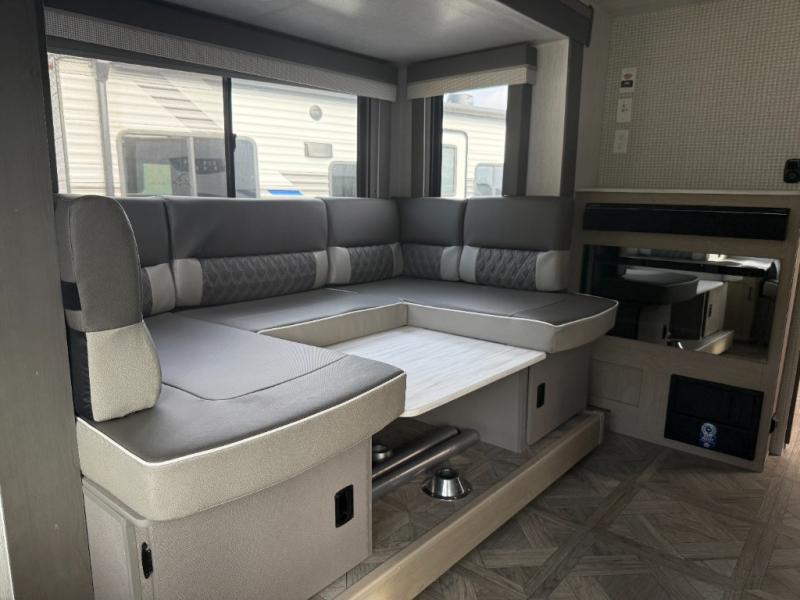 This travel trailer is packed full of features, but is still lightweight coming in at just over 5,000 lbs.! You will feel right at home in the front master bedroom with a custom king bed with Versa Tilt that has closets on either side, CPAP storage, and a walk-in closet to keep your clothes looking their best. The walk-through bathroom has a walk-in shower with fiberglass surround and a skylight above for added natural lighting as you get ready. The U-shaped dinette slide has a panoramic window for you to enjoy your beautiful scenery as you eat dinner, and there is a fireplace at the entertainment center for a relaxing evening indoors. There is a pass-through storage area to store your outdoor camping gear, and a 16' power awning and exterior speakers to crank up the tunes!